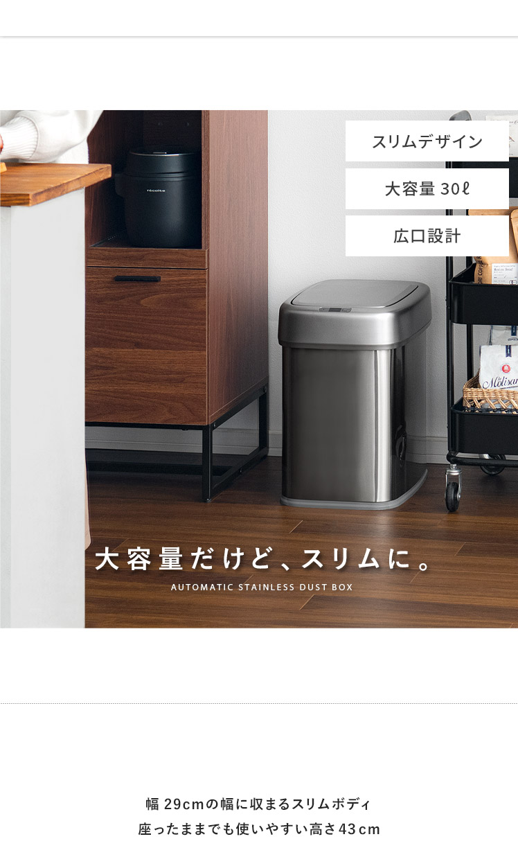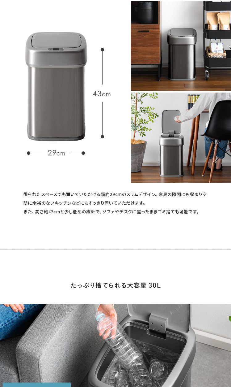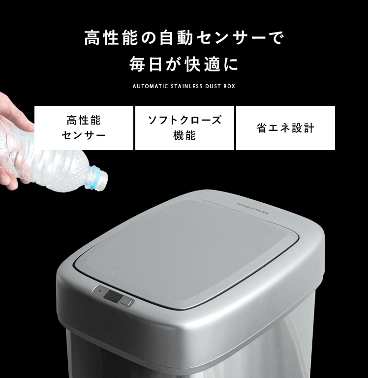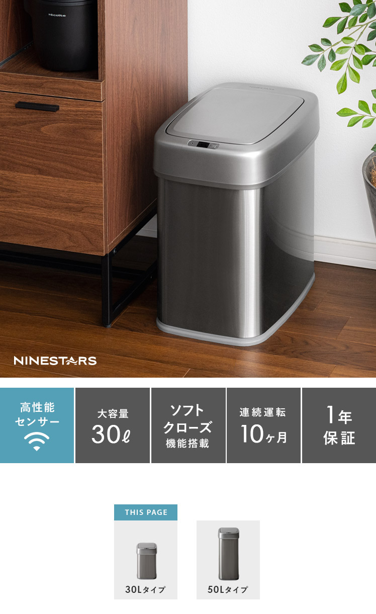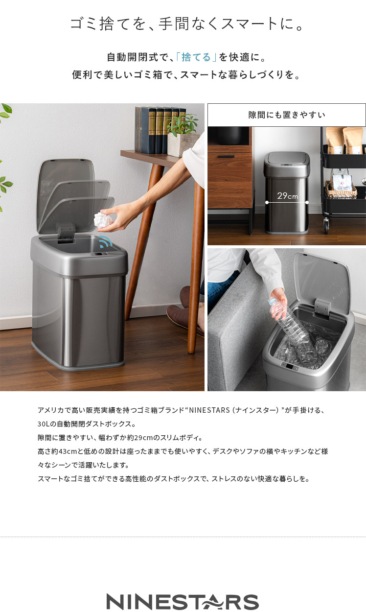NINE STARS〔ナインスター〕 自動開閉ダストボックス 30L スリムタイプ/アメリカで高い販売実績を持つゴミ箱ブランド“NINESTARS(ナインスター)”が手掛ける、30Lの自動開閉ダストボックス。隙間に置きやすい、幅わずか約29cmのスリムボディ。高さ約43cmと低めの設計は座ったままでも使いやすく、デスクやソファの横やキッチンなど様々なシーンで活躍いたします。スマートなゴミ捨てができる高性能のダストボックスで、ストレスのない快適な暮らしを。