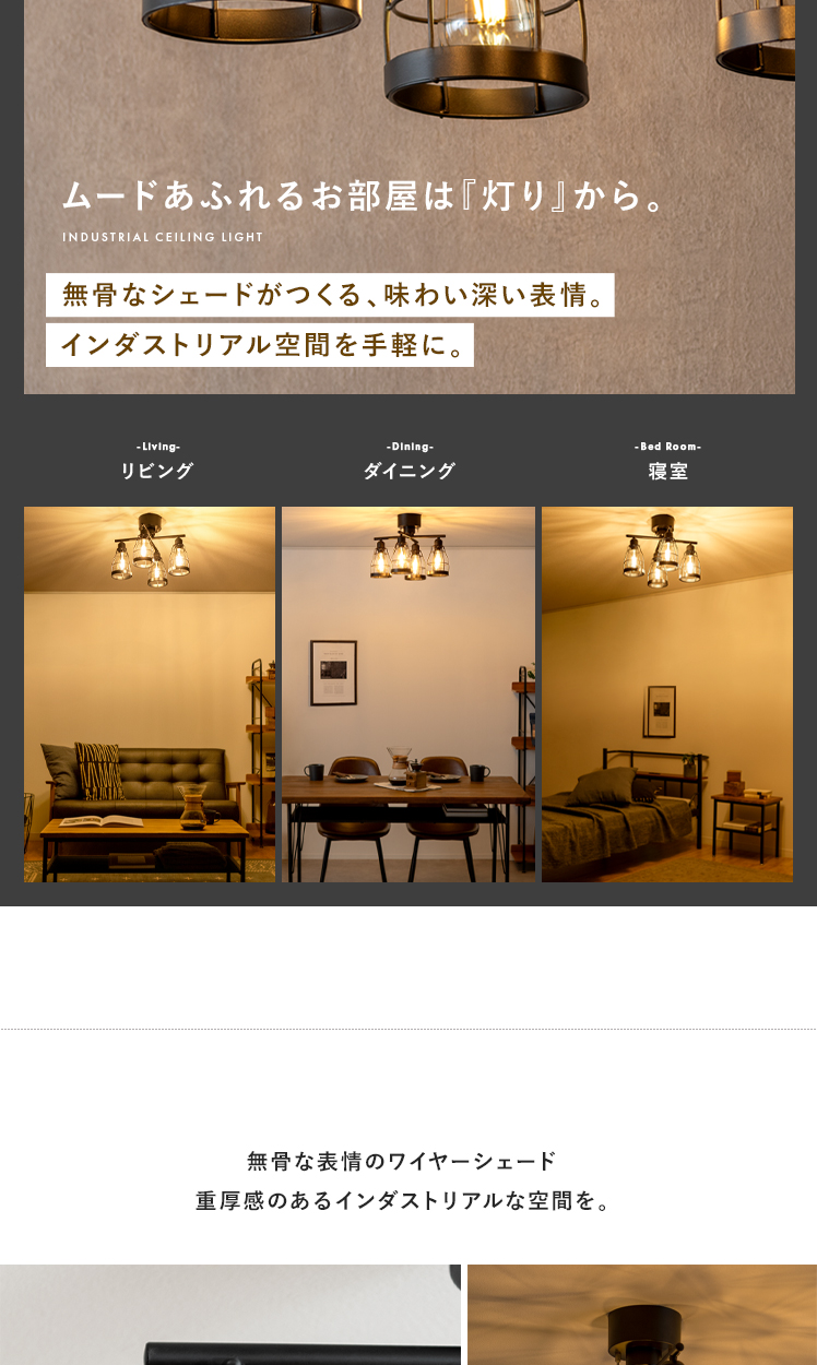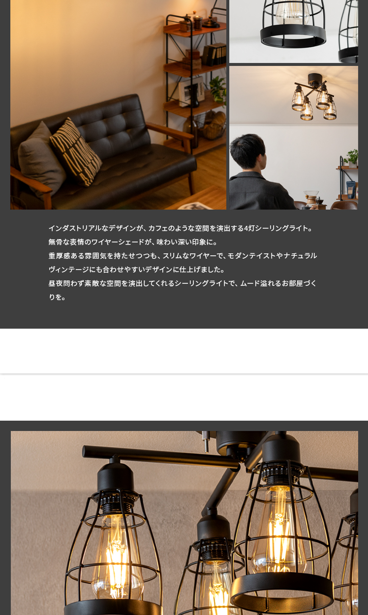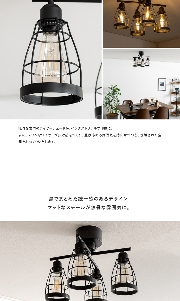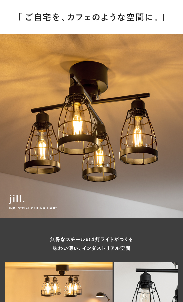 4灯シーリングライトjill〔ジル〕クロスタイプ/インダストリアルなデザインが、カフェのような空間を演出する4灯シーリングライト。無骨な表情のワイヤーシェードが、味わい深い印象に。重厚感ある雰囲気を持たせつつも、スリムなワイヤーで、モダンテイストやナチュラルヴィンテージにも合わせやすいデザインに仕上げました。昼夜問わず素敵な空間を演出してくれるシーリングライトで、ムード溢れるお部屋づくりを。
