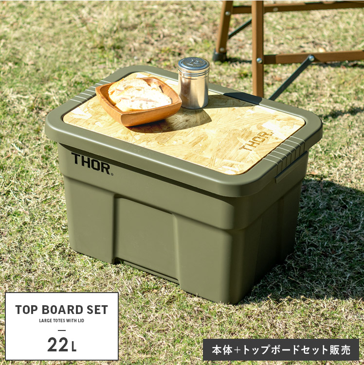 ソーラージトートウィズリッド 22L・トップボードセット販売/お部屋やベランダに映える、ガレージ風デザインの大容量コンテナ“THOR(ソー)”屋外はもちろん、お部屋の中にも取り入れやすいシンプルなデザイン性で、おしゃれなカフェやショップのような雰囲気ある空間を作っていただけます。アウトドアシーンでも人気の“THOR”シリーズは、業務用プラスチックメーカーならではの屋外環境にも適応した頑丈な造り。キャンプ用品、ガーデン用品、非常用ストック、衣類収納など、屋内外問わず幅広い収納物にお使いいただけます。