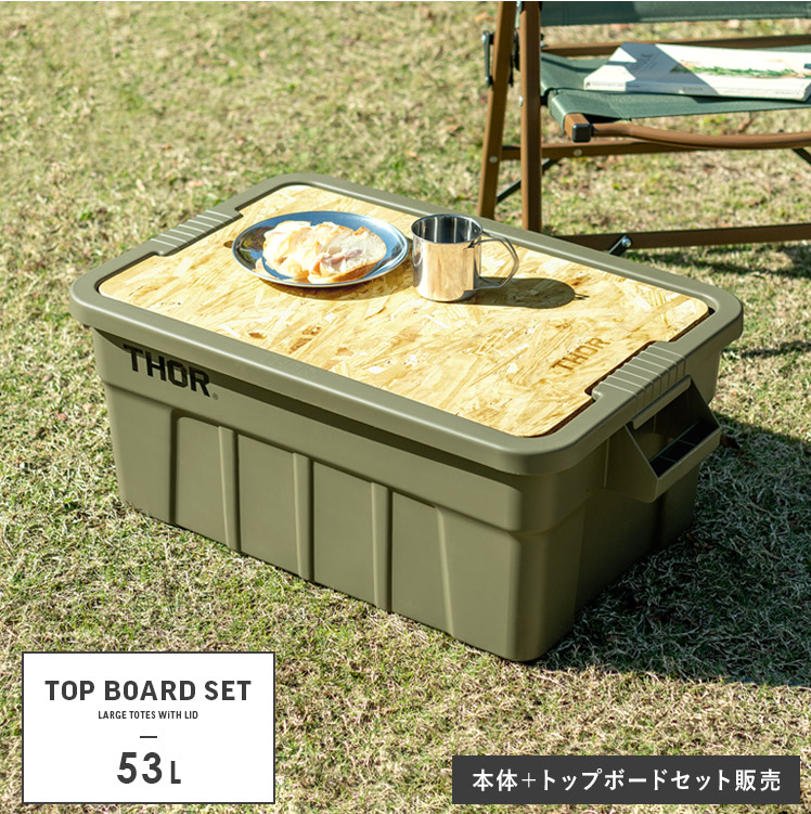 ソーラージトートウィズリッド 53L・トップボードセット販売/お部屋やベランダに映える、ガレージ風デザインの大容量コンテナ“THOR(ソー)”屋外はもちろん、お部屋の中にも取り入れやすいシンプルなデザイン性で、おしゃれなカフェやショップのような雰囲気ある空間を作っていただけます。アウトドアシーンでも人気の“THOR”シリーズは、業務用プラスチックメーカーならではの屋外環境にも適応した頑丈な造り。キャンプ用品、ガーデン用品、非常用ストック、衣類収納など、屋内外問わず幅広い収納物にお使いいただけます。
