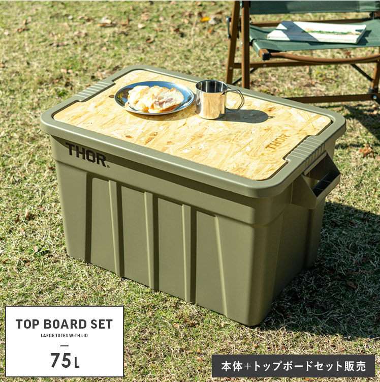 ソーラージトートウィズリッド 75L・トップボードセット販売/お部屋やベランダに映える、ガレージ風デザインの大容量コンテナ“THOR(ソー)”屋外はもちろん、お部屋の中にも取り入れやすいシンプルなデザイン性で、おしゃれなカフェやショップのような雰囲気ある空間を作っていただけます。アウトドアシーンでも人気の“THOR”シリーズは、業務用プラスチックメーカーならではの屋外環境にも適応した頑丈な造り。キャンプ用品、ガーデン用品、非常用ストック、衣類収納など、屋内外問わず幅広い収納物にお使いいただけます。