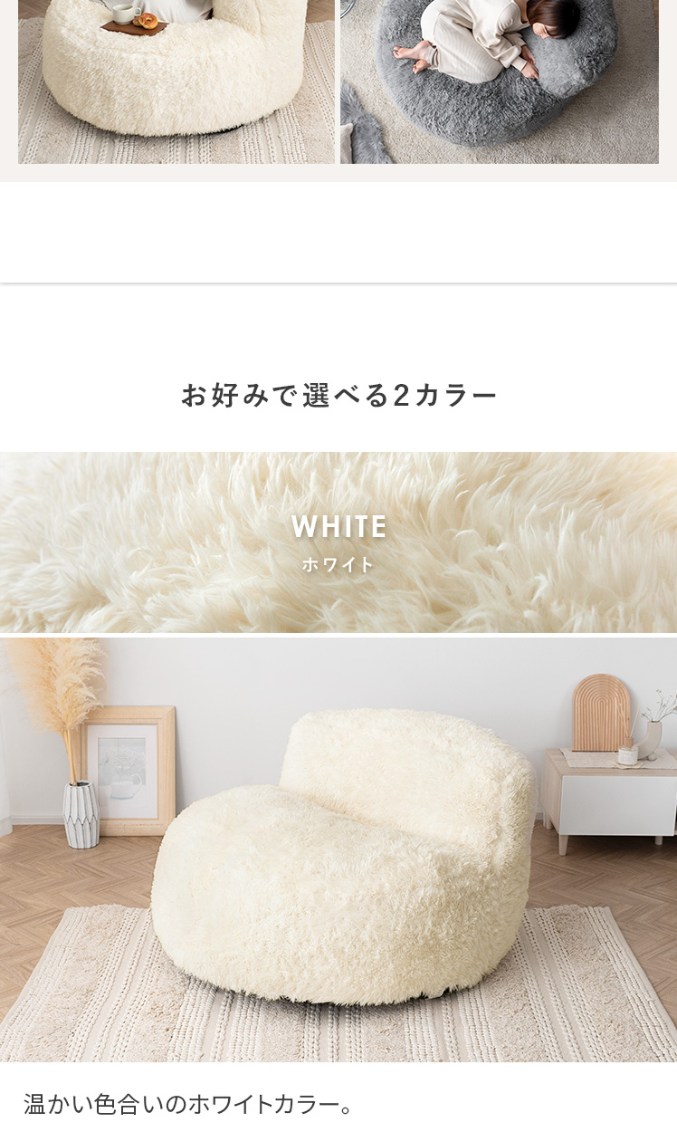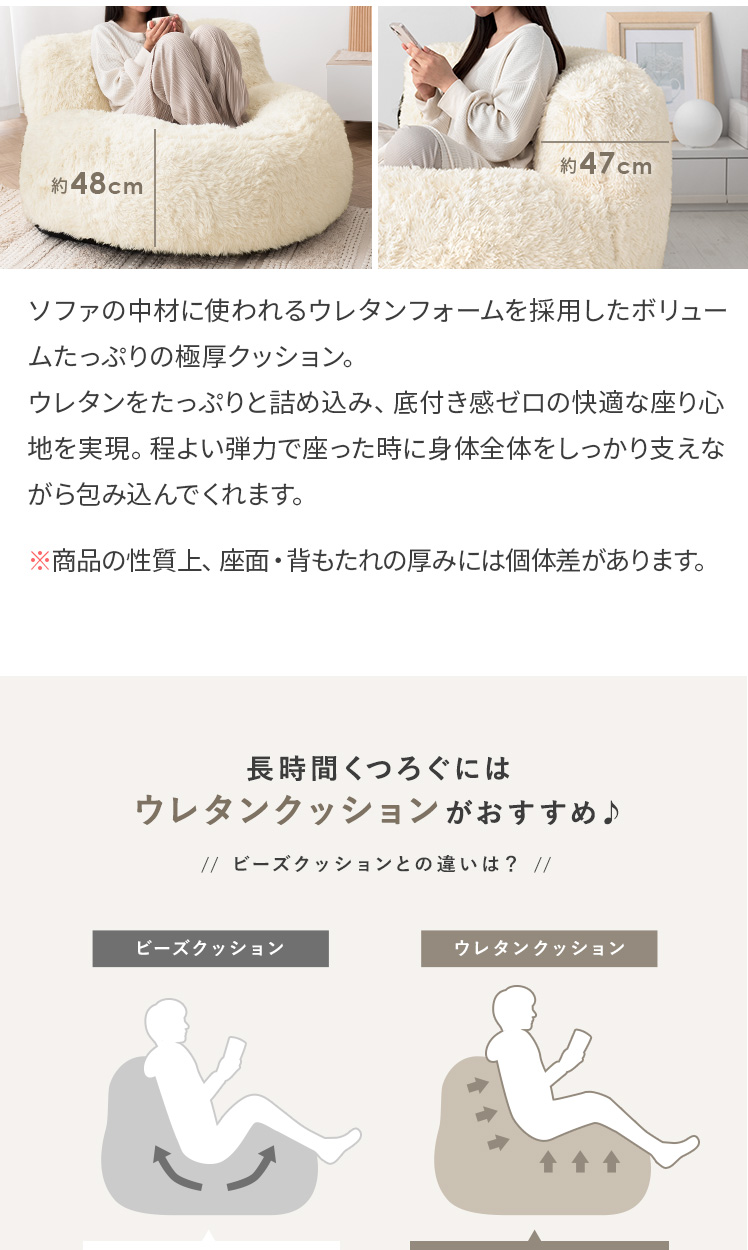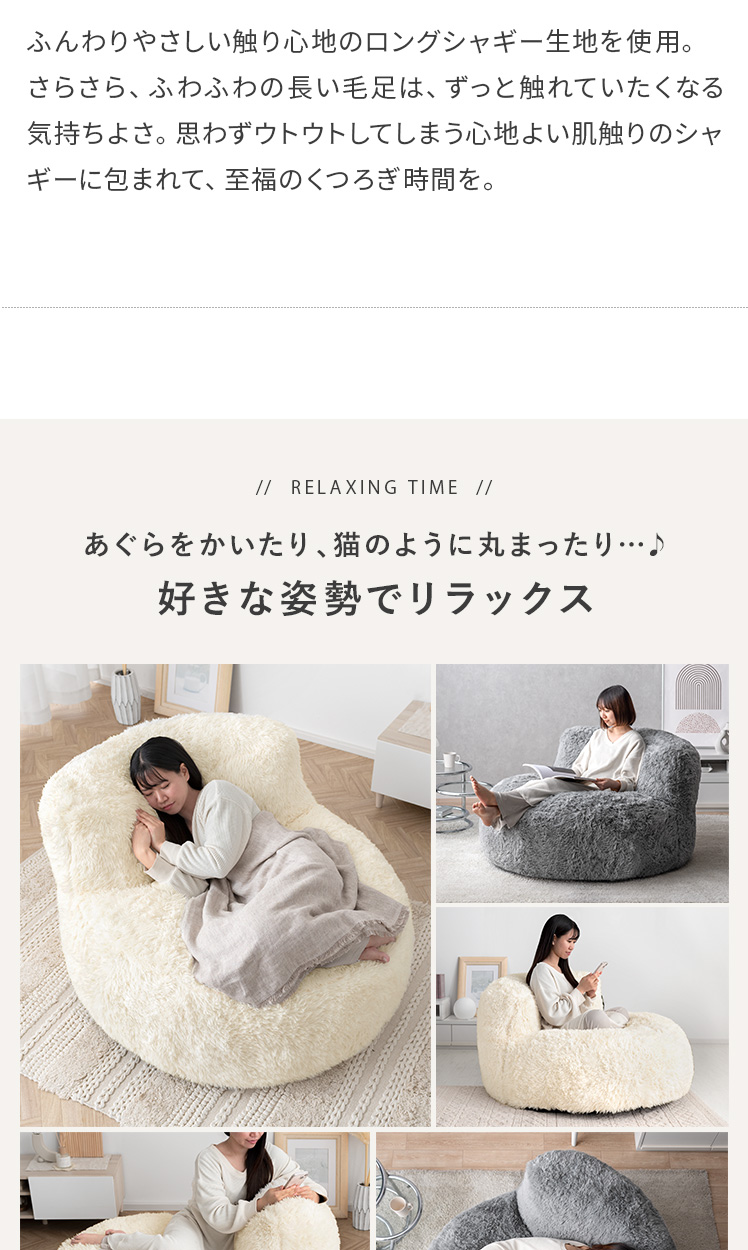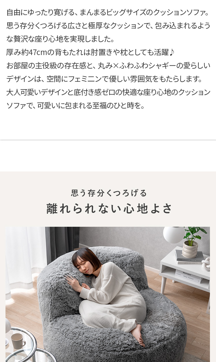 もちもちクッションソファ coco〔ココ〕/自由にゆったり寛げる、まんまるビッグサイズのクッションソファ。思う存分くつろげる広さと極厚なクッションで、包み込まれるような贅沢な座り心地を実現しました。厚み約47cmの背もたれは肘置きや枕としても活躍♪お部屋の主役級の存在感と、丸み×ふわふわシャギーの愛らしいデザインは、空間にフェミ二ンで優しい雰囲気をもたらします。大人可愛いデザインと底付き感ゼロの快適な座り心地のクッションソファで、可愛いに包まれる至福のひと時を。