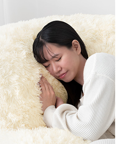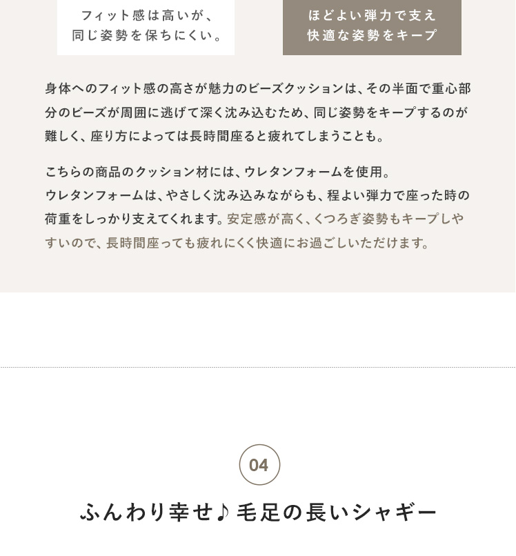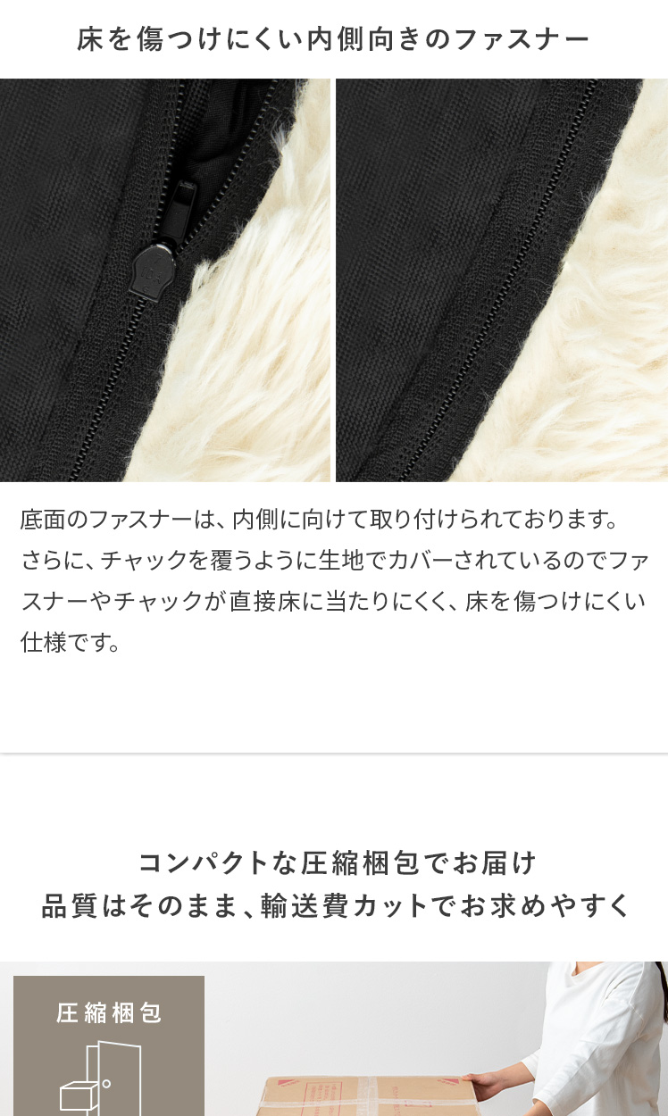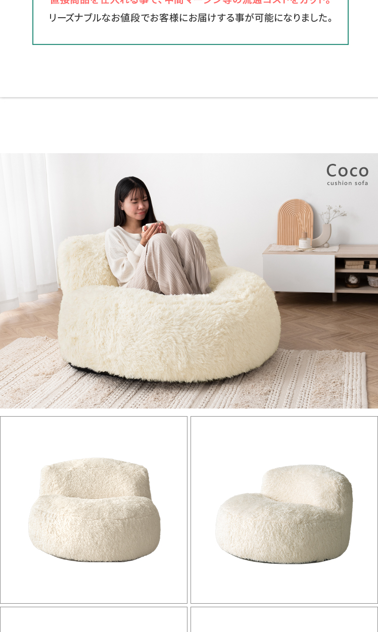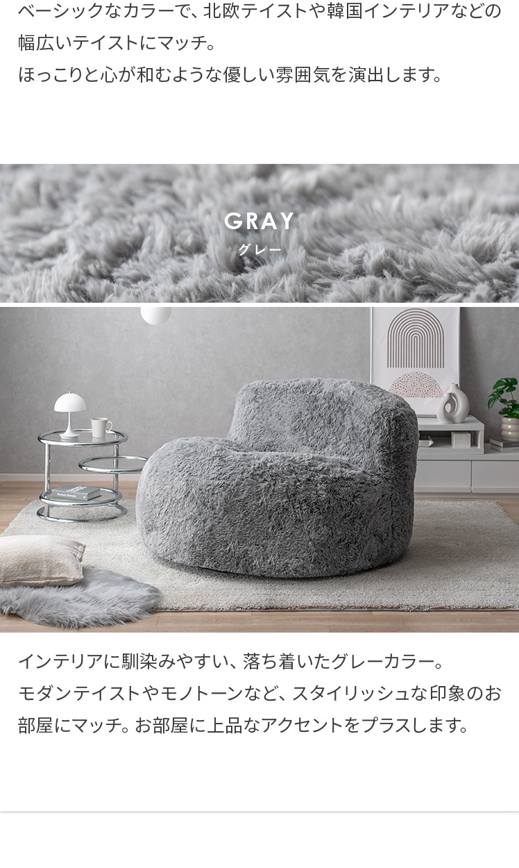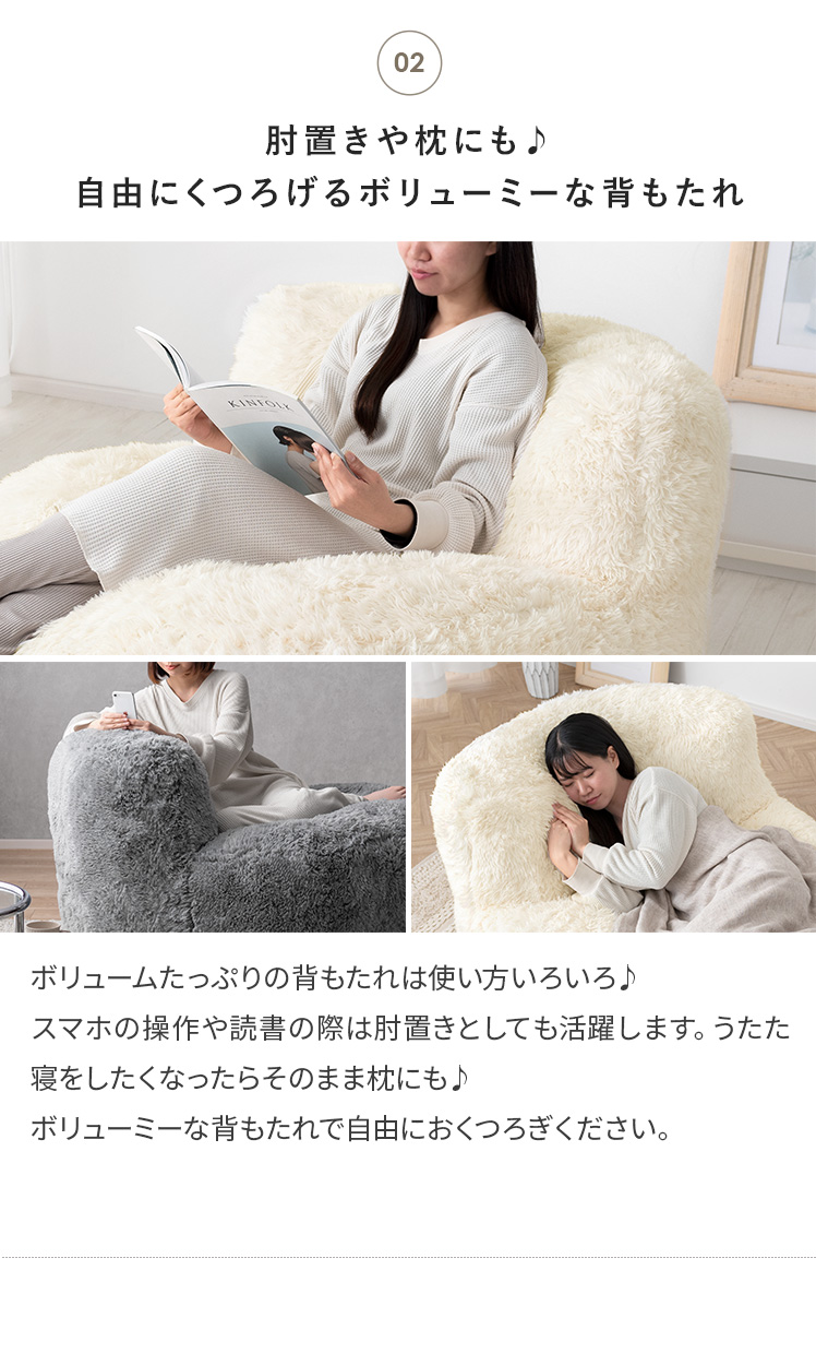 もちもちクッションソファ coco〔ココ〕/自由にゆったり寛げる、まんまるビッグサイズのクッションソファ。思う存分くつろげる広さと極厚なクッションで、包み込まれるような贅沢な座り心地を実現しました。厚み約47cmの背もたれは肘置きや枕としても活躍♪お部屋の主役級の存在感と、丸み×ふわふわシャギーの愛らしいデザインは、空間にフェミ二ンで優しい雰囲気をもたらします。大人可愛いデザインと底付き感ゼロの快適な座り心地のクッションソファで、可愛いに包まれる至福のひと時を。