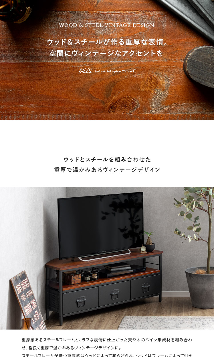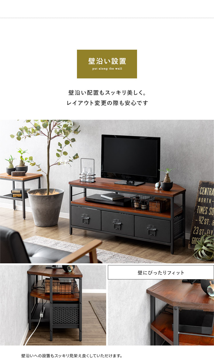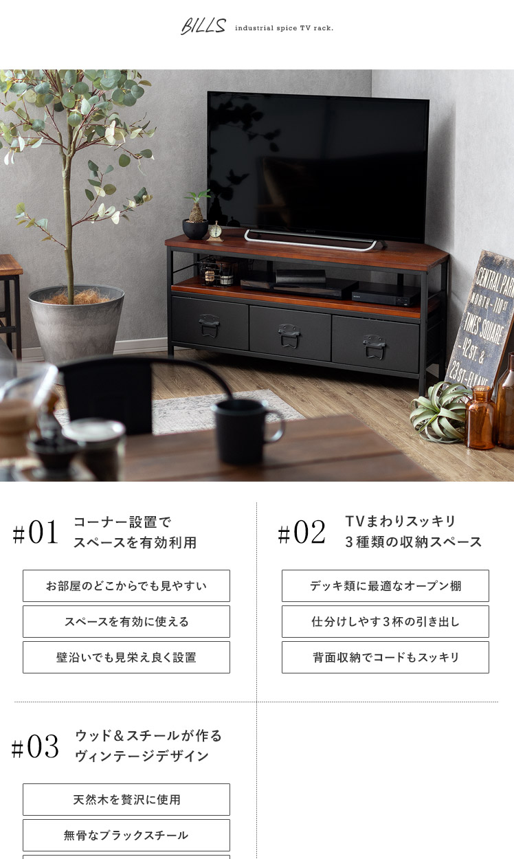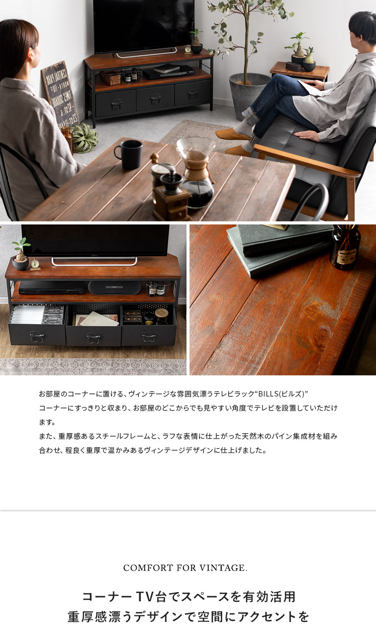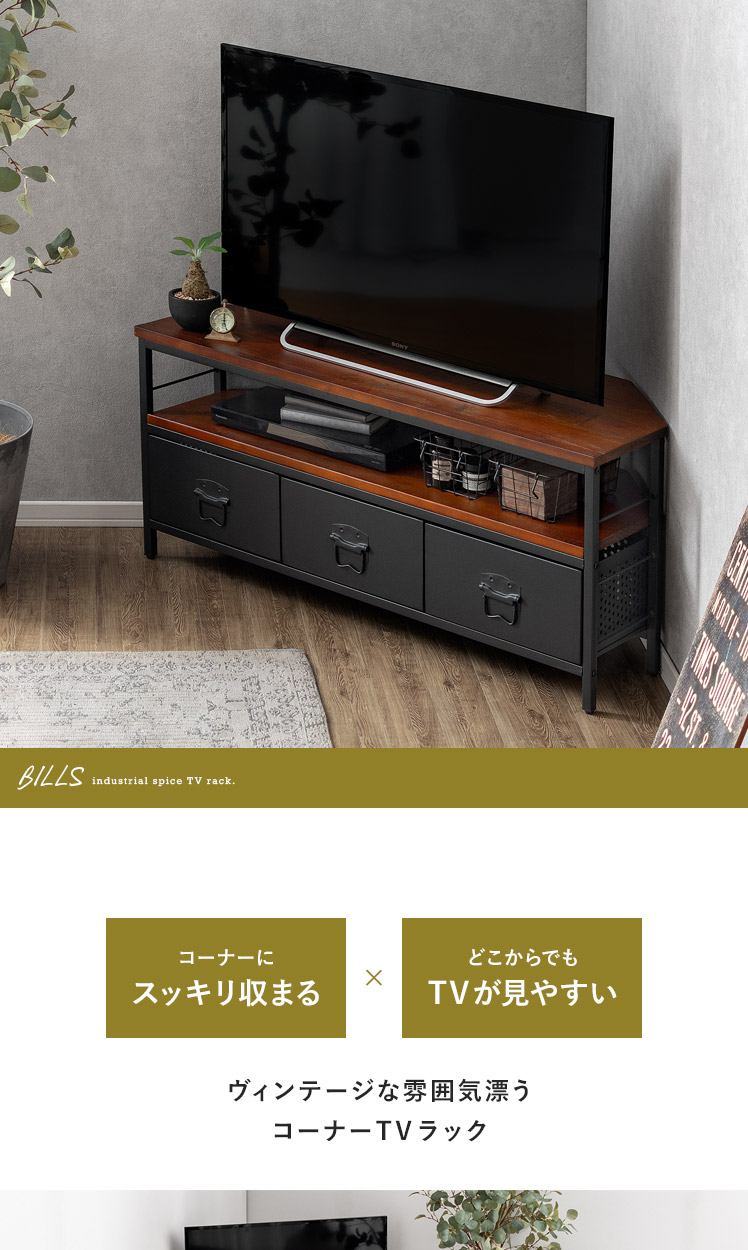 コーナーにすっきりと収まり、お部屋のどこからでも見やすい角度でテレビを設置できる、ヴィンテージな雰囲気漂うコーナーTVラック。