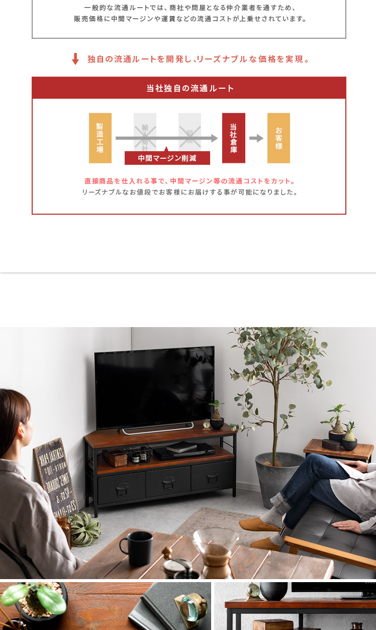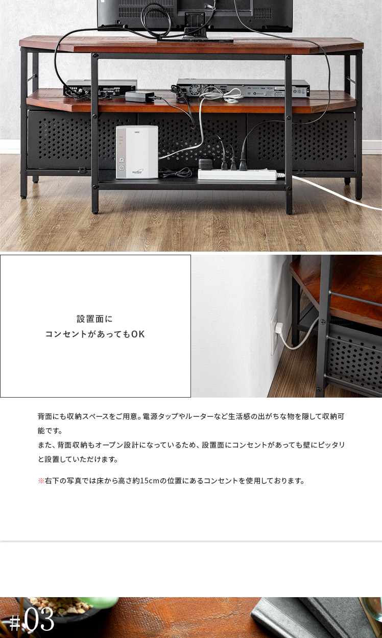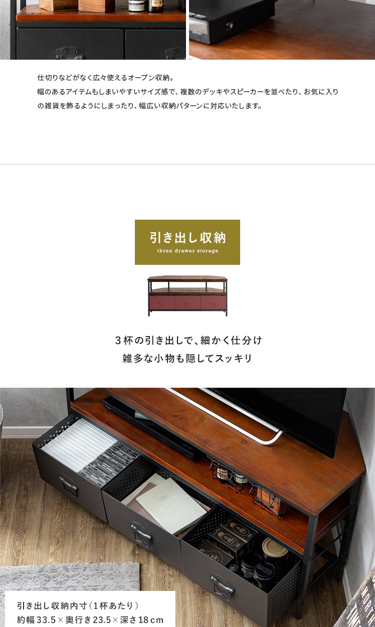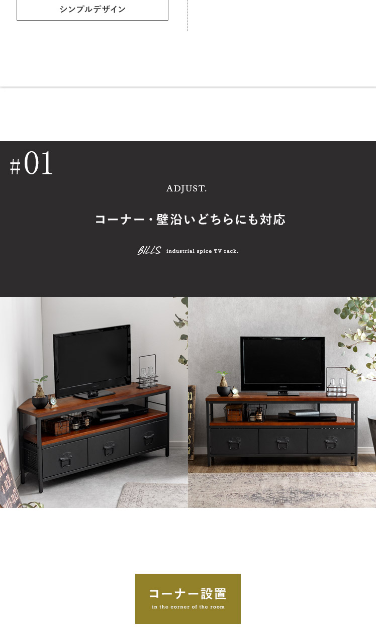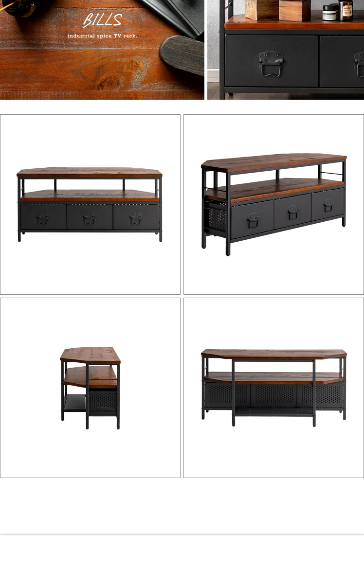 コーナーにすっきりと収まり、お部屋のどこからでも見やすい角度でテレビを設置できる、ヴィンテージな雰囲気漂うコーナーTVラック。