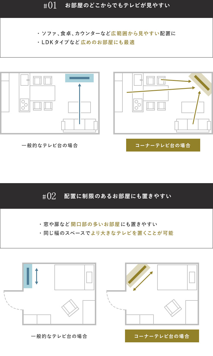 お部屋に対して斜め向きにテレビを置くことで、広範囲からテレビが見やすくなります。
