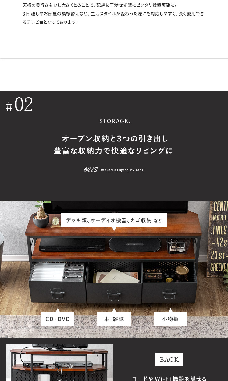 背面にも収納スペースをご用意。電源タップやルーターなど生活感の出がちな物を隠して収納可能です。