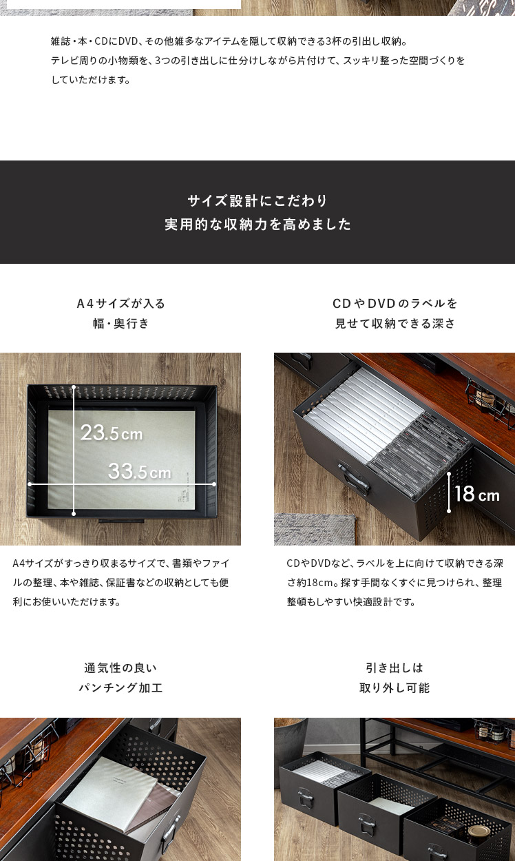 雑誌・本・CDにDVD、その他雑多なアイテムを隠して収納できる3杯の引出し収納。 仕分けしながら片付けて、スッキリ整った空間づくりをしていただけます。