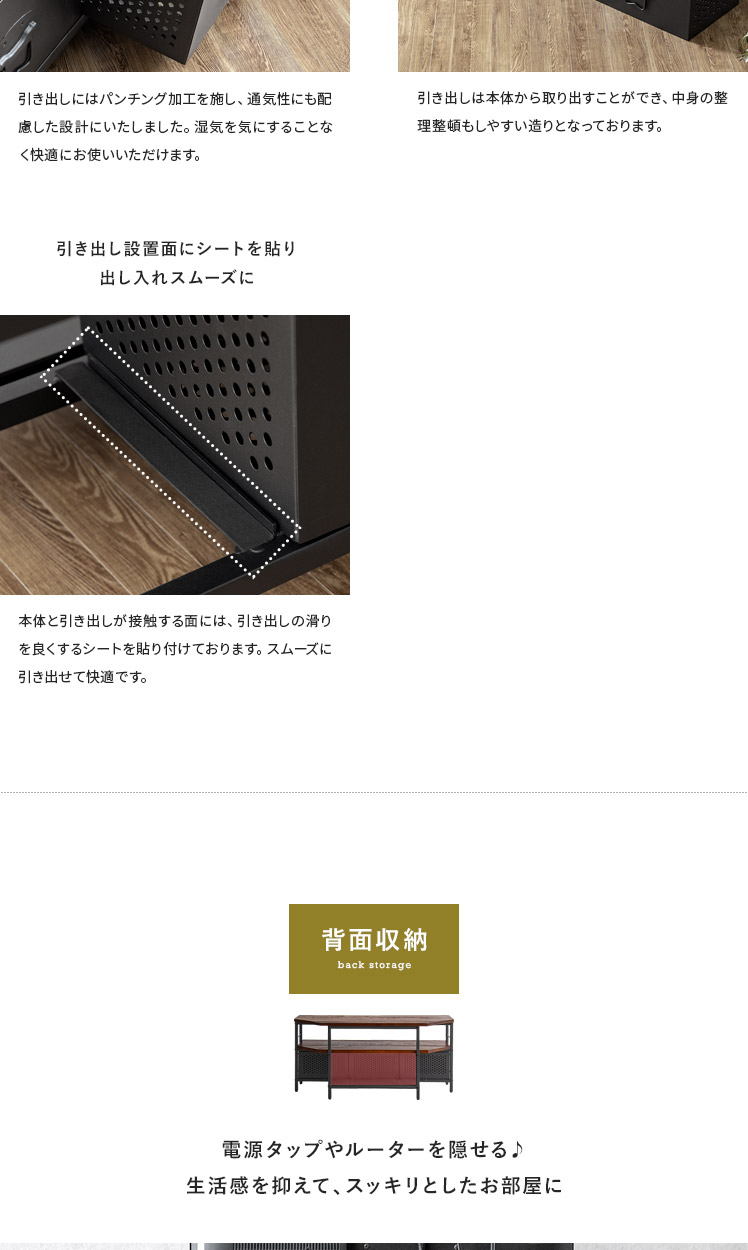 引き出しにはパンチング加工を施し、通気性にも配慮した設計にいたしました。湿気を気にすることなく快適にお使いいただけます。