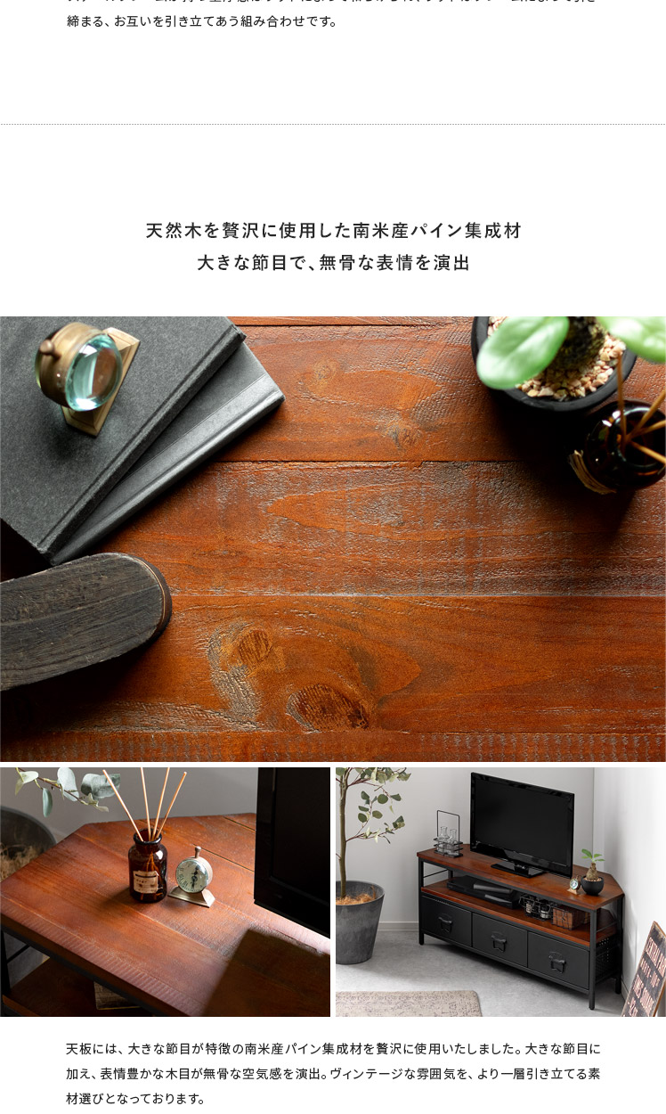 天板には、大きな節目が特徴の南米産パイン集成材を贅沢に使用いたしました。