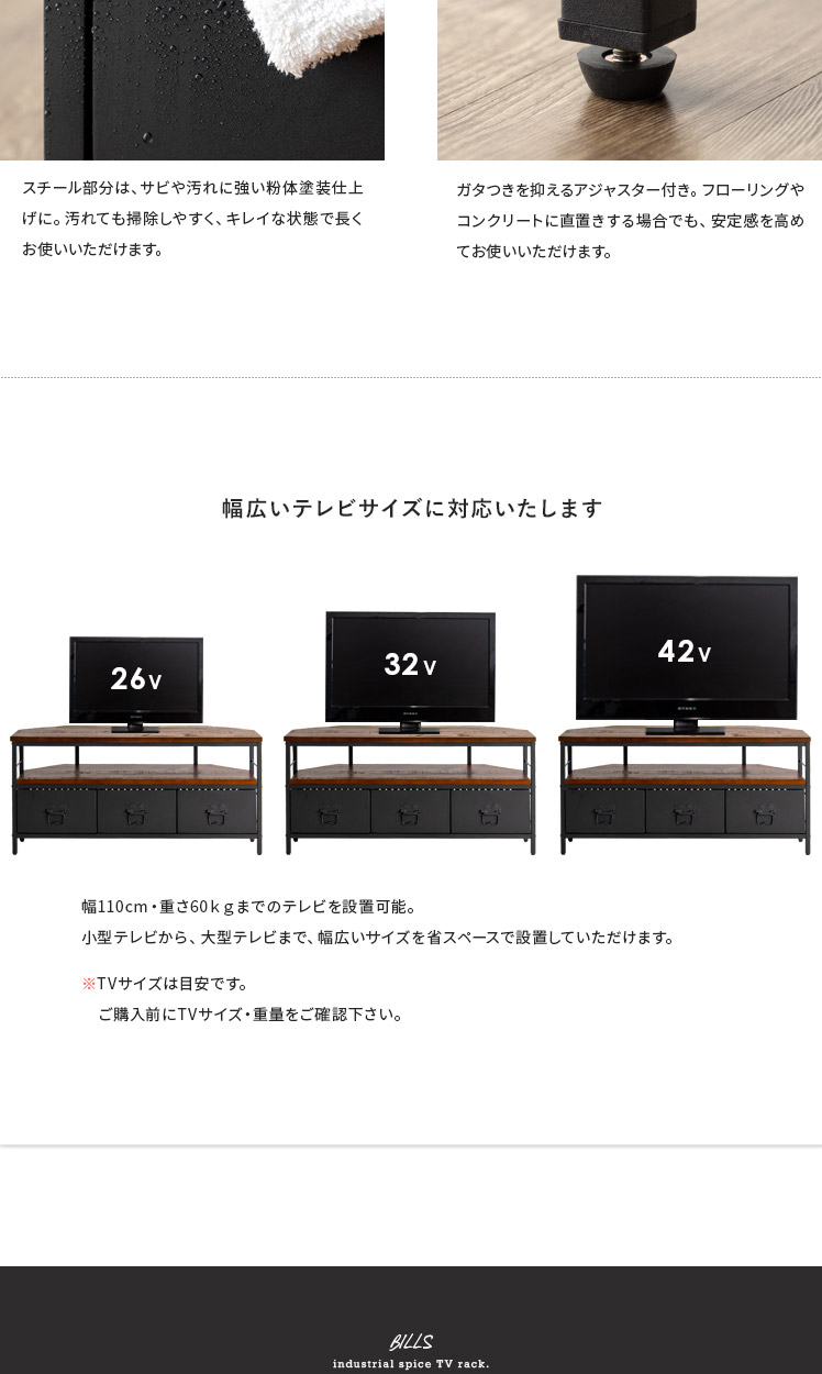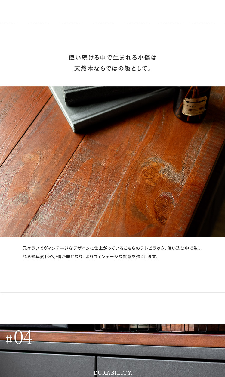 元々ラフでヴィンテージなデザインに仕上がっているこちらのテレビラック。使い込む中で生まれる経年変化や小傷が味となり、よりヴィンテージな質感を強くします