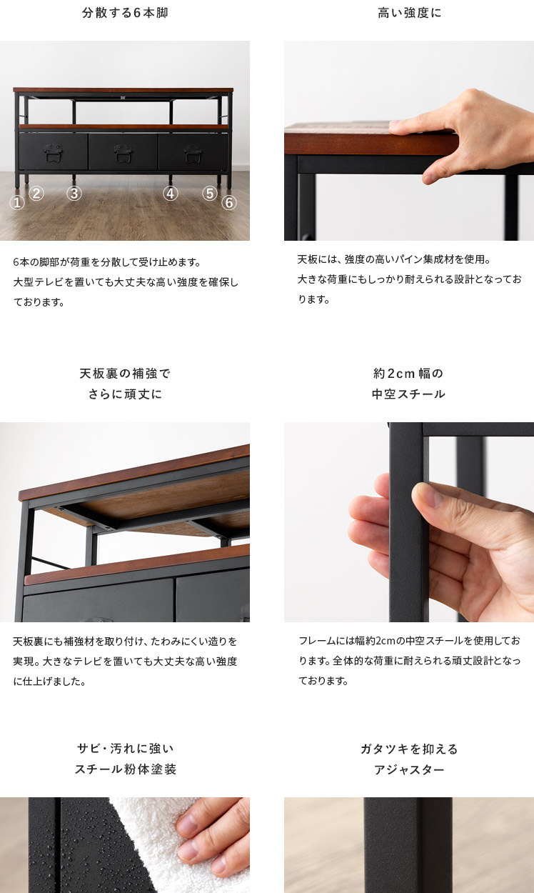 6本の脚部が荷重を分散して受け止めます。大型テレビを置いても大丈夫な高い強度を確保しております。