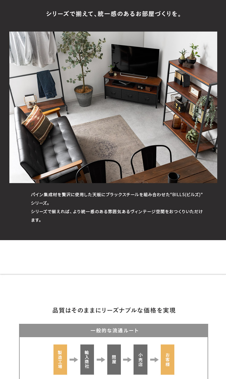 パイン集成材を贅沢に使用した天板にブラックスチールを組み合わせたBILLS(ビルズ)シリーズ。より統一感のあるヴィンテージ空間をおつくりいただけます。