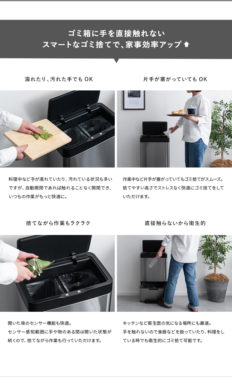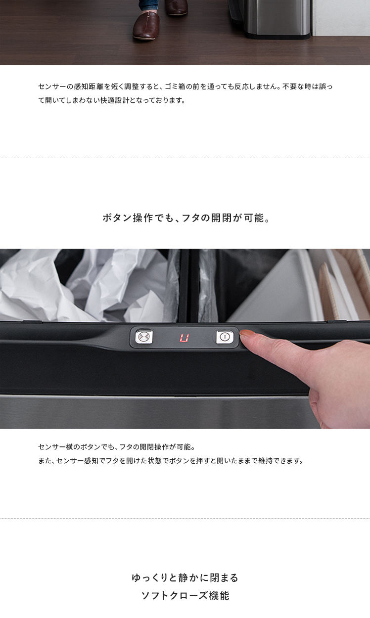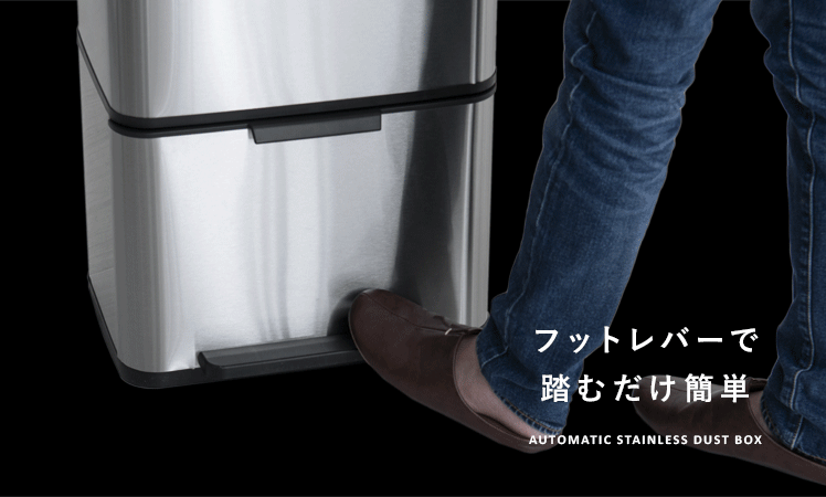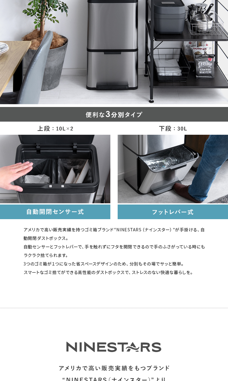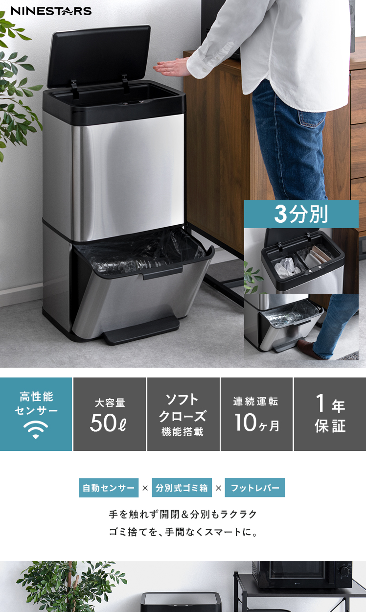 NINE STARS〔ナインスター〕 自動開閉ダストボックス 50L 3分別タイプ/アメリカで高い販売実績を持つゴミ箱ブランド“NINESTARS(ナインスター)”が手掛ける、自動開閉ダストボックス。自動センサーとフットレバーで、手を触れずにフタを開閉できるので手のふさがっている時にもラクラク捨てられます。3つのゴミ箱が1つになった省スペースデザインのため、分別もその場でサッと簡単。スマートなゴミ捨てができる高性能のダストボックスで、ストレスのない快適な暮らしを。