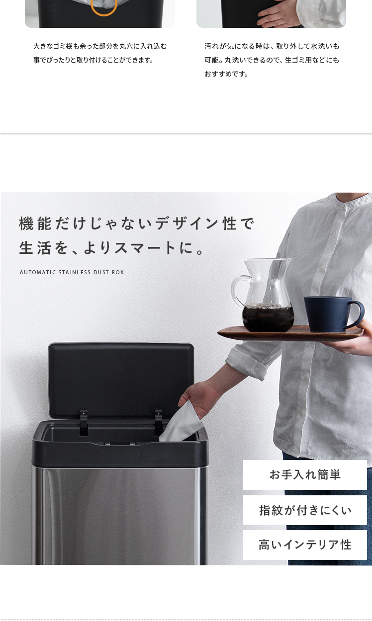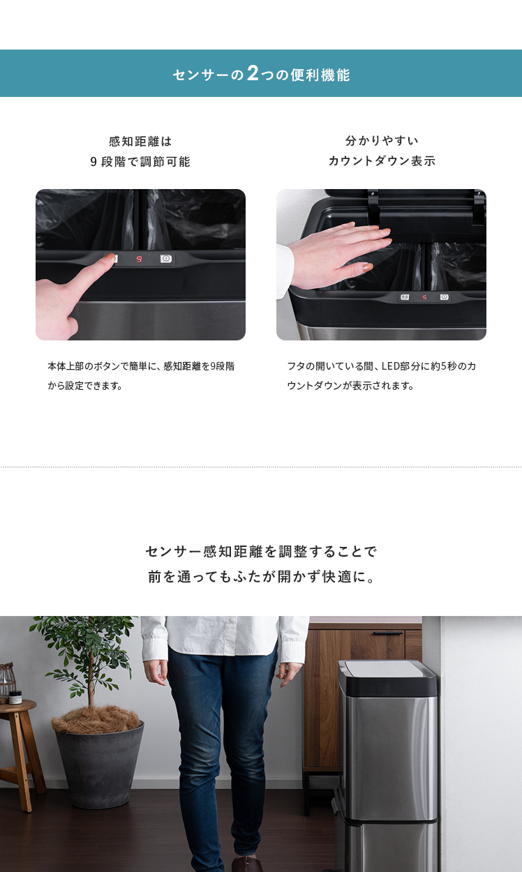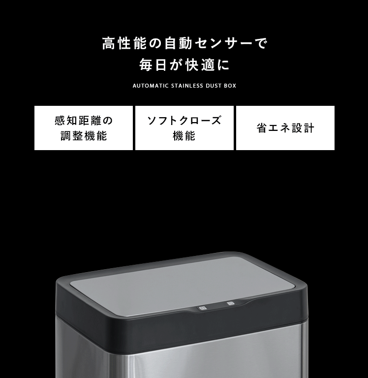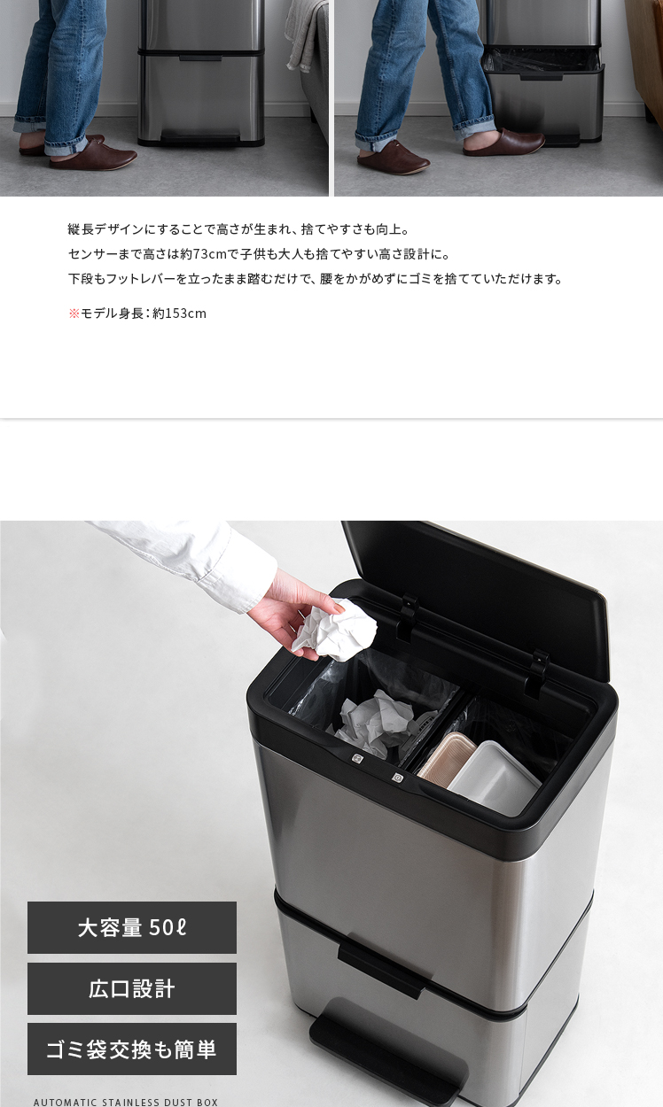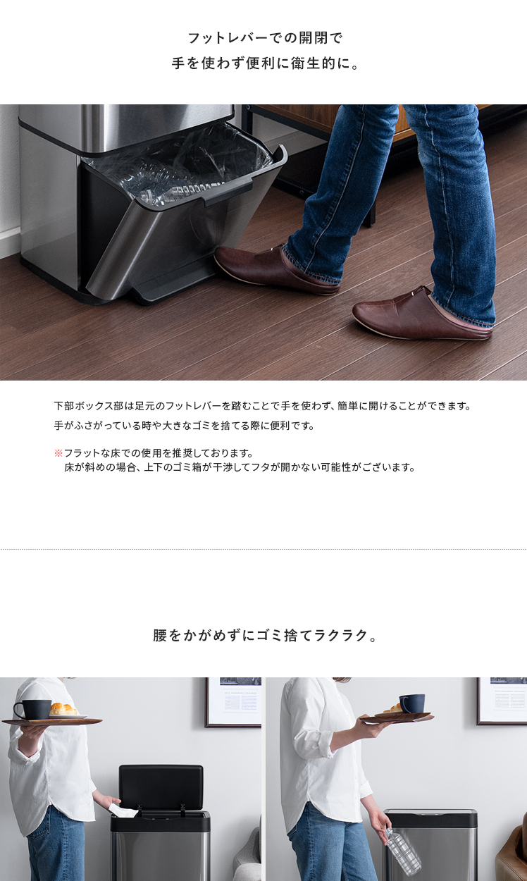 NINE STARS〔ナインスター〕 自動開閉ダストボックス 50L 3分別タイプ/アメリカで高い販売実績を持つゴミ箱ブランド“NINESTARS(ナインスター)”が手掛ける、自動開閉ダストボックス。自動センサーとフットレバーで、手を触れずにフタを開閉できるので手のふさがっている時にもラクラク捨てられます。3つのゴミ箱が1つになった省スペースデザインのため、分別もその場でサッと簡単。スマートなゴミ捨てができる高性能のダストボックスで、ストレスのない快適な暮らしを。
