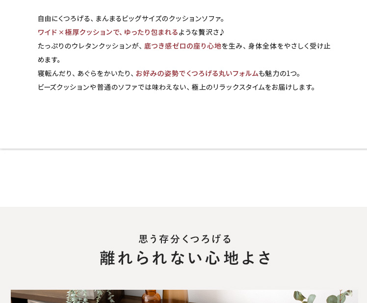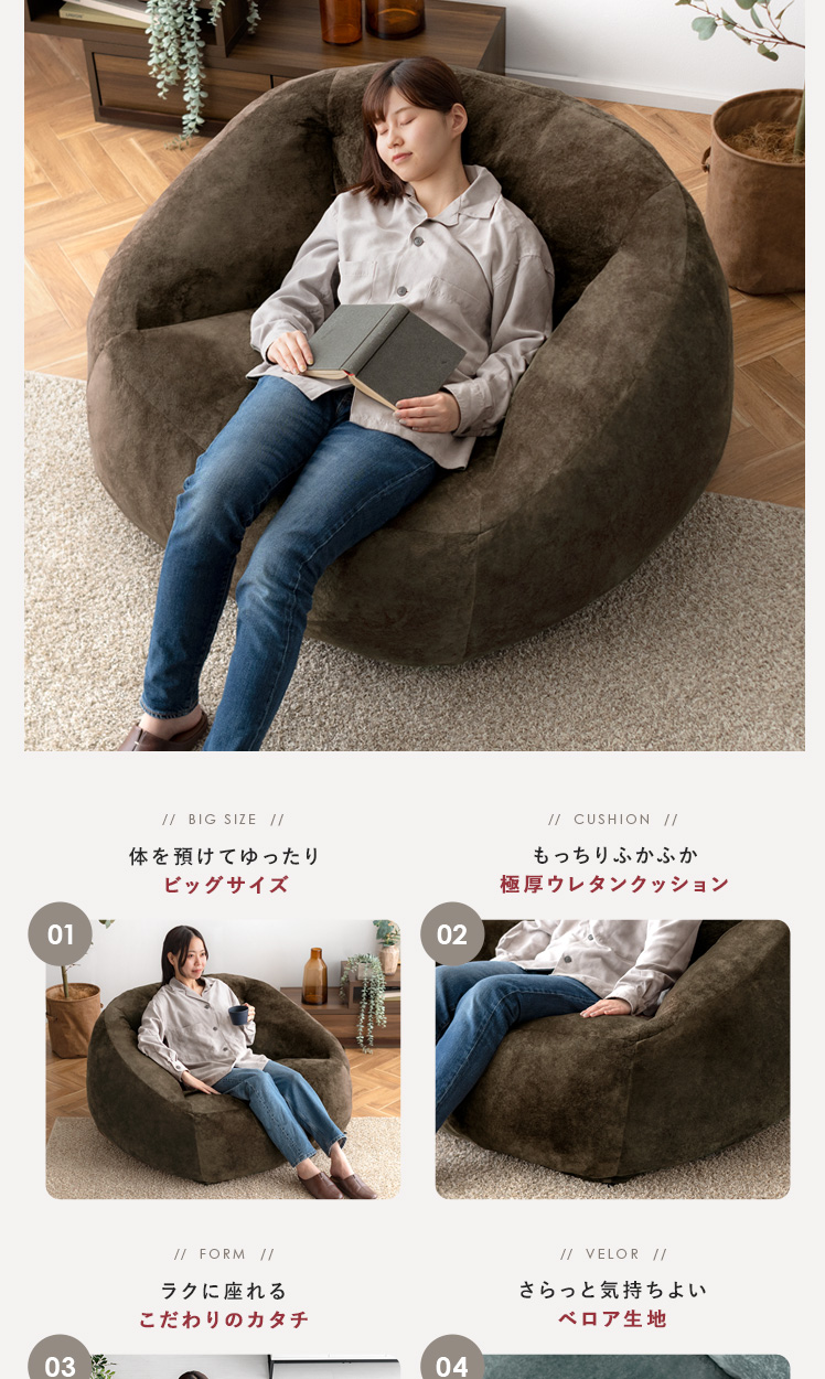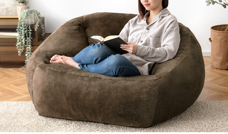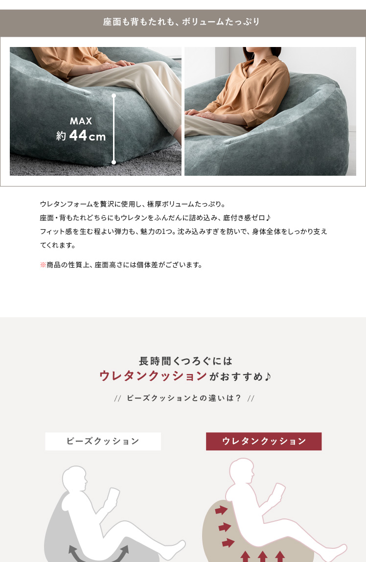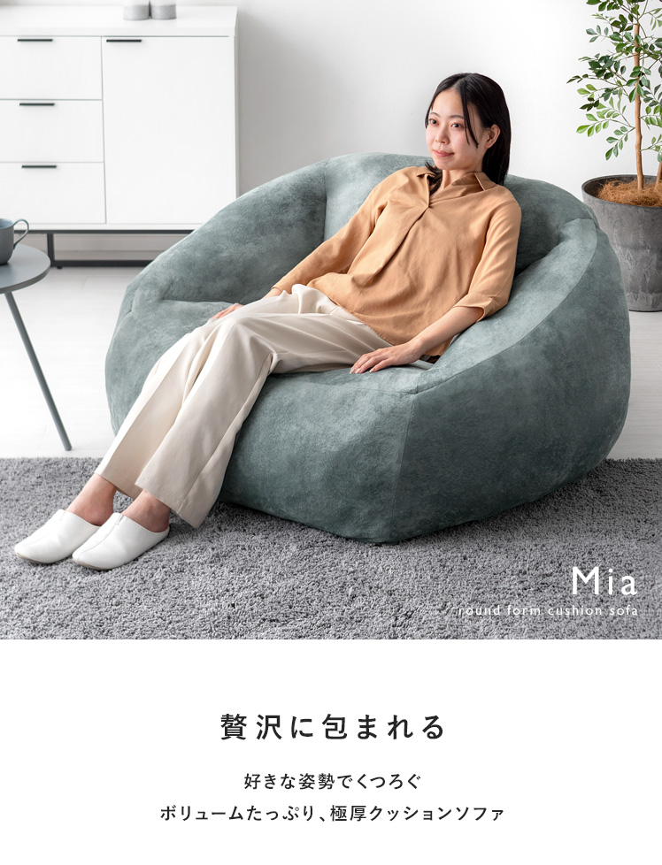 クッションソファ Mia〔ミア〕/自由にくつろげる、まんまるビッグサイズのクッションソファ。ワイド×極厚クッションで、ゆったり包まれるような贅沢さ♪たっぷりのウレタンクッションが、底つき感ゼロの座り心地を生み、身体全体をやさしく受け止めます。寝転んだり、あぐらをかいたり、お好みの姿勢でくつろげる丸いフォルムも魅力の1つ。ビーズクッションや普通のソファでは味わえない、極上のリラックスタイムをお届けします。
