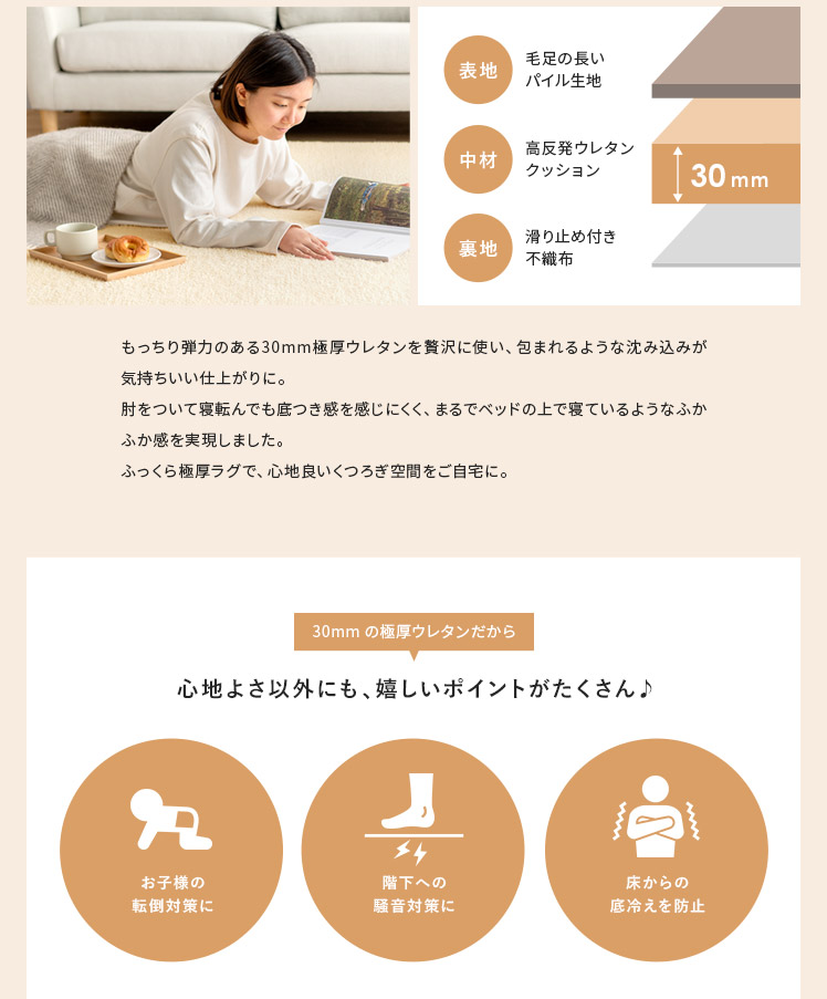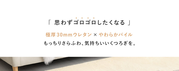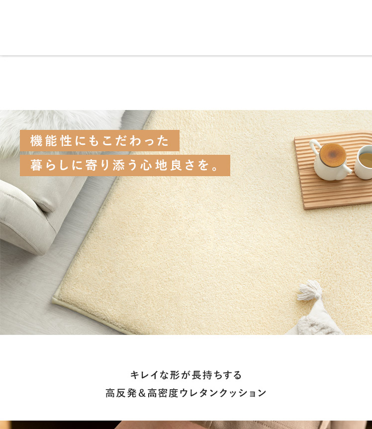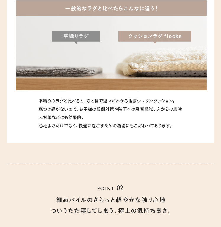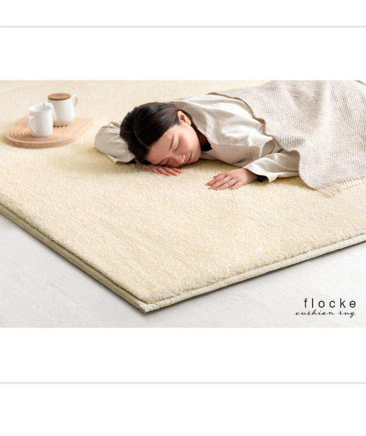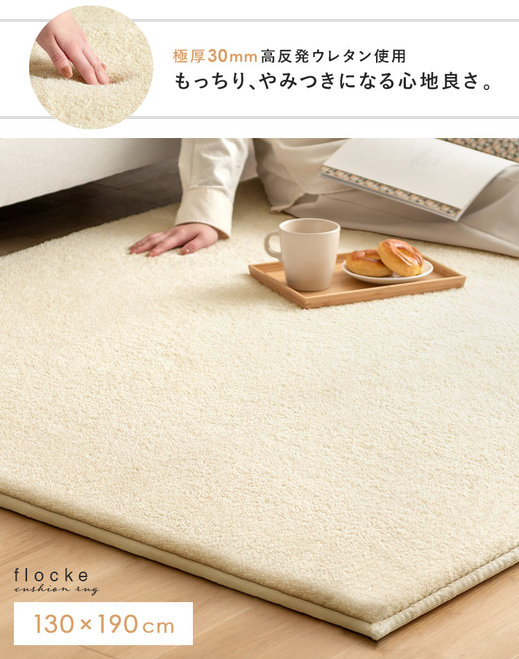 高反発ウレタンクッションラグ flocke〔フロッケ〕130x190cm/もっちりさらふわが気持ちいい。極厚30mmのクッションラグ。まるでベッドの上にいるようなふかふか感に、細めパイルの軽やかな肌触りが合わさり、ついゴロゴロしたくなる気持ちいい仕上がりに。小さなお子さまの転倒対策や、階下への騒音軽減などにも活躍する極厚設計。快適に過ごすための機能も詰め込んだもっちりラグで、ご自宅をもっと居心地のいい空間に。