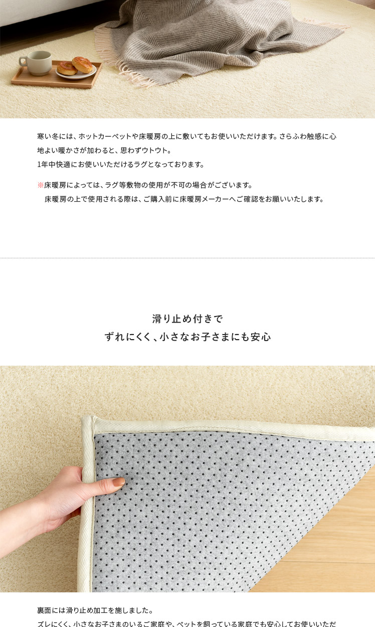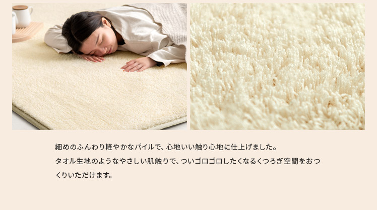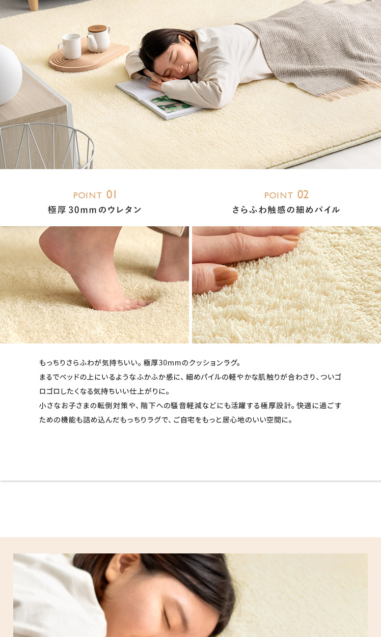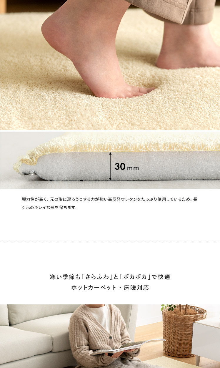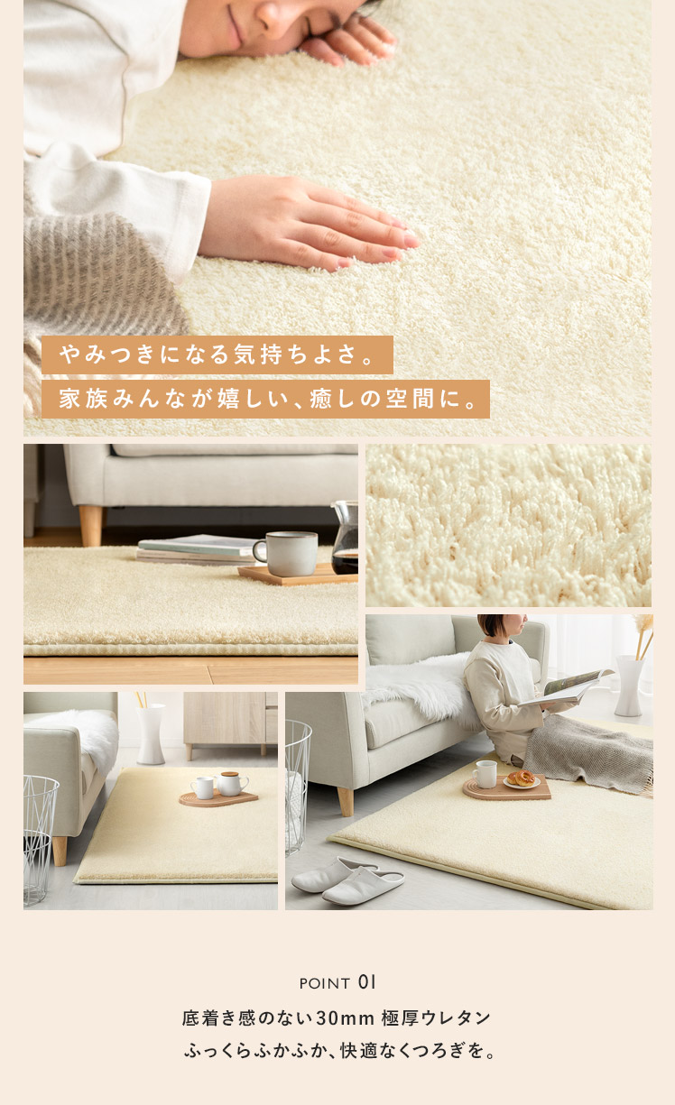 高反発ウレタンクッションラグ flocke〔フロッケ〕130x190cm/もっちりさらふわが気持ちいい。極厚30mmのクッションラグ。まるでベッドの上にいるようなふかふか感に、細めパイルの軽やかな肌触りが合わさり、ついゴロゴロしたくなる気持ちいい仕上がりに。小さなお子さまの転倒対策や、階下への騒音軽減などにも活躍する極厚設計。快適に過ごすための機能も詰め込んだもっちりラグで、ご自宅をもっと居心地のいい空間に。