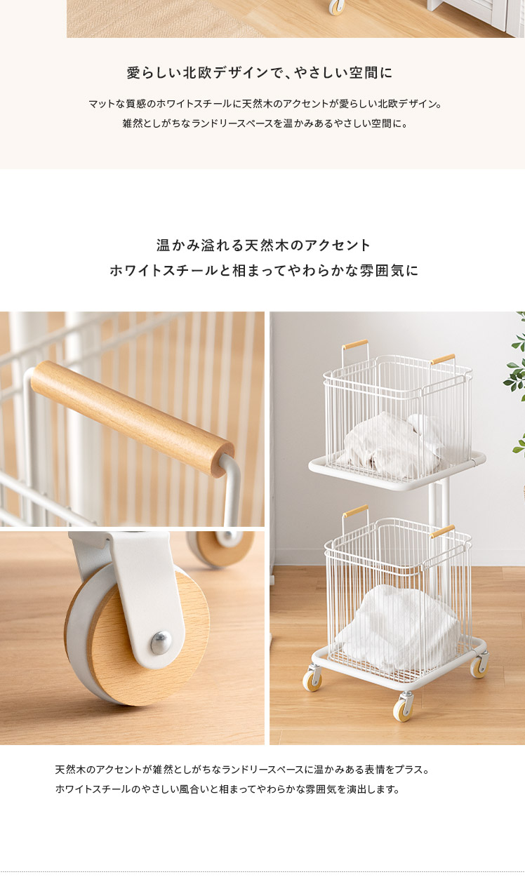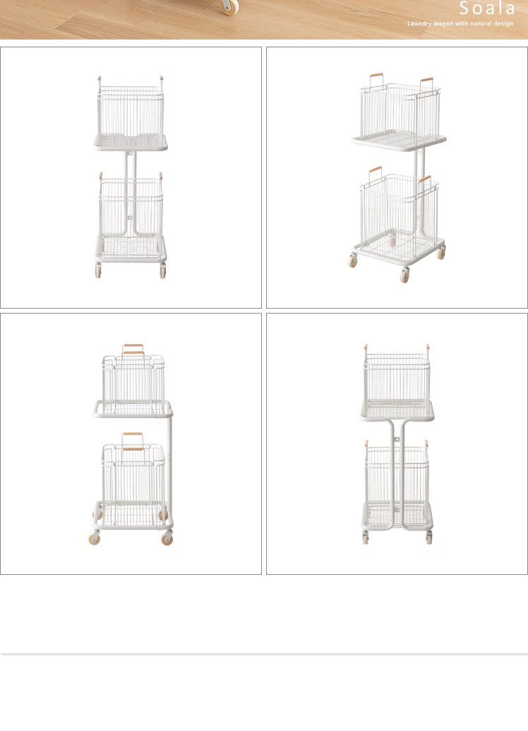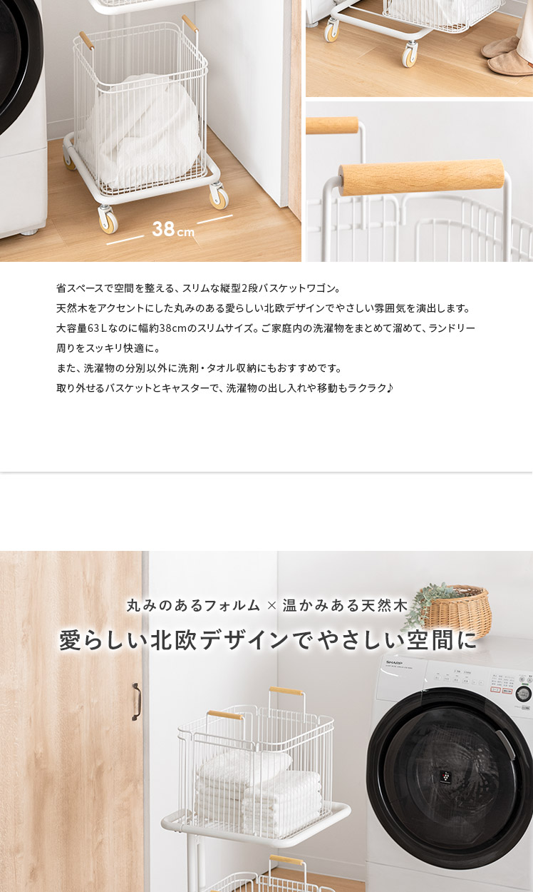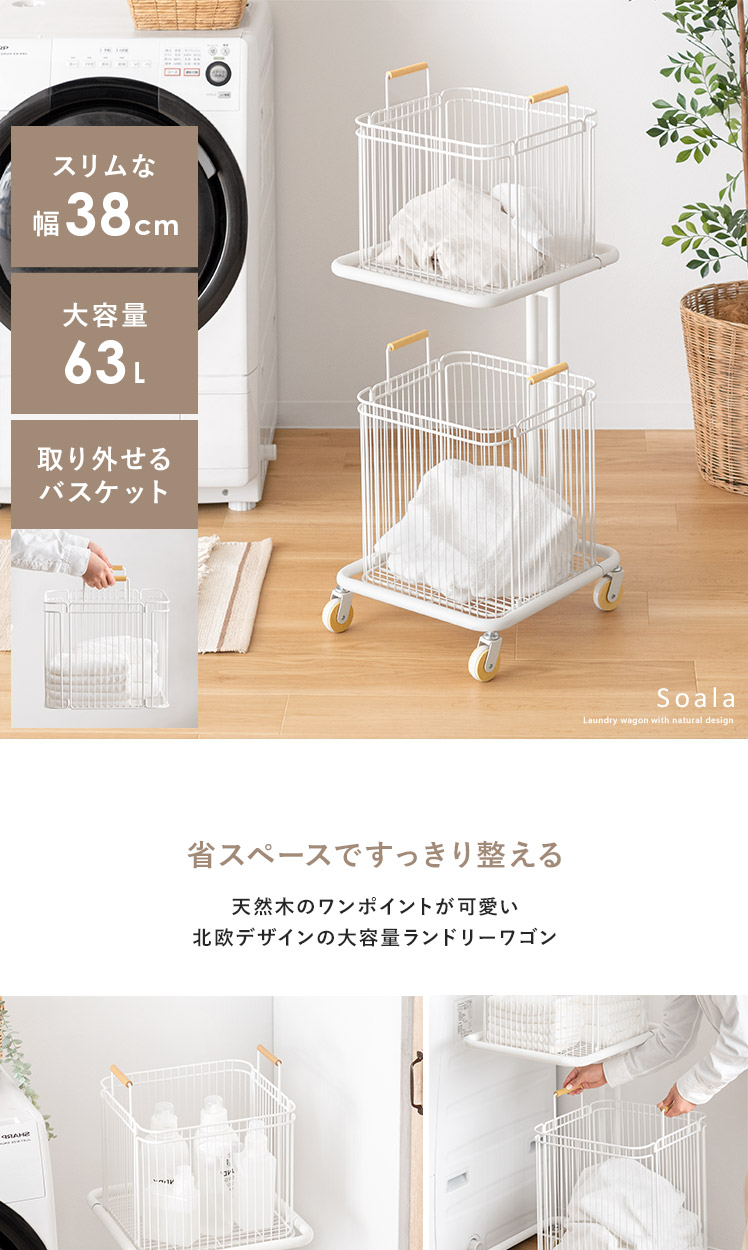 ランドリーワゴン Soala〔ソアラ〕/省スペースで空間を整える、スリムな縦型2段バスケットワゴン。天然木をアクセントにした丸みのある愛らしい北欧デザインでやさしい雰囲気を演出します。大容量63Lなのに幅約38cmのスリムサイズ。ご家庭内の洗濯物をまとめて溜めて、ランドリー周りをスッキリ快適に。また、洗濯物の分別以外に洗剤・タオル収納にもおすすめです。取り外せるバスケットとキャスターで、洗濯物の出し入れや移動もラクラク♪