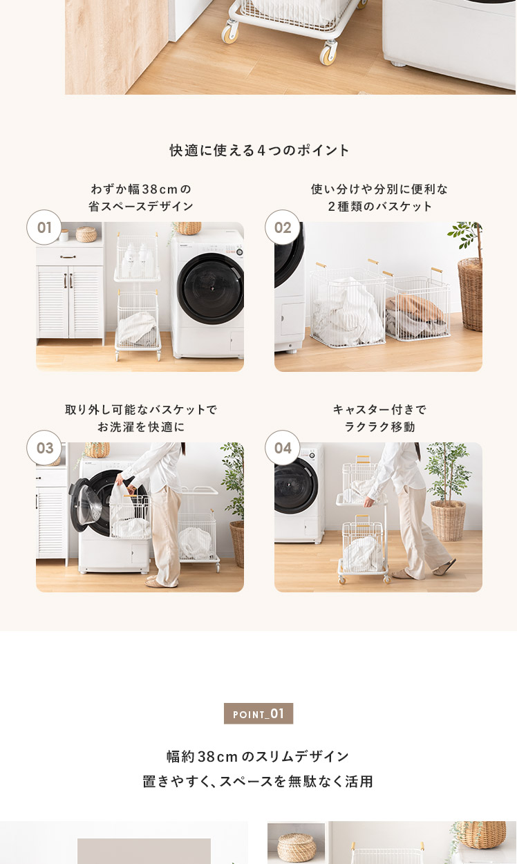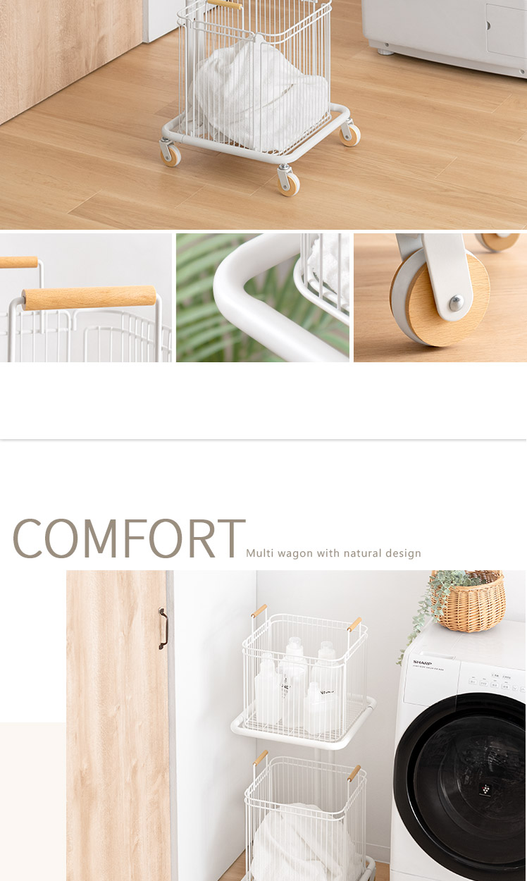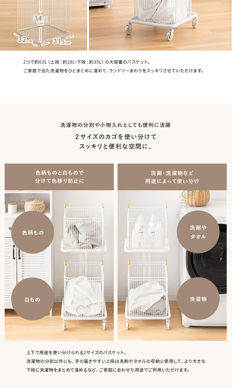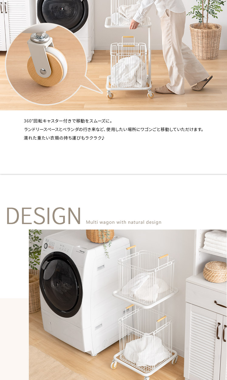 ランドリーワゴン Soala〔ソアラ〕/省スペースで空間を整える、スリムな縦型2段バスケットワゴン。天然木をアクセントにした丸みのある愛らしい北欧デザインでやさしい雰囲気を演出します。大容量63Lなのに幅約38cmのスリムサイズ。ご家庭内の洗濯物をまとめて溜めて、ランドリー周りをスッキリ快適に。また、洗濯物の分別以外に洗剤・タオル収納にもおすすめです。取り外せるバスケットとキャスターで、洗濯物の出し入れや移動もラクラク♪