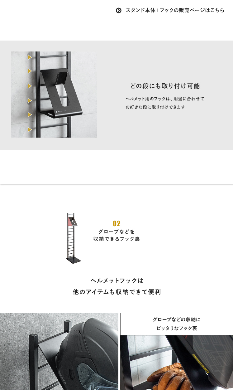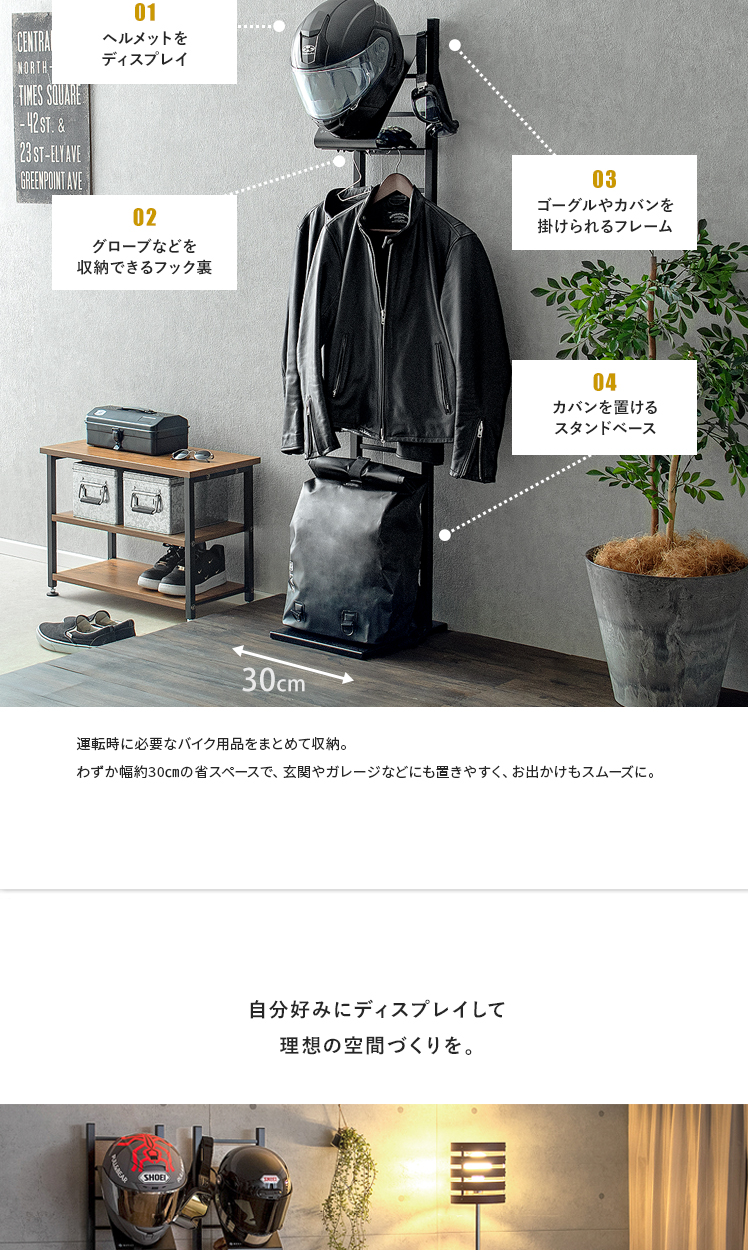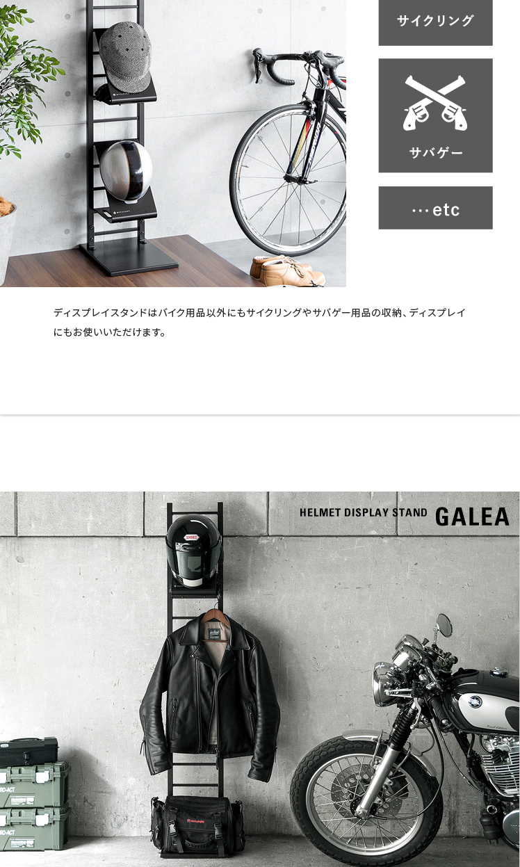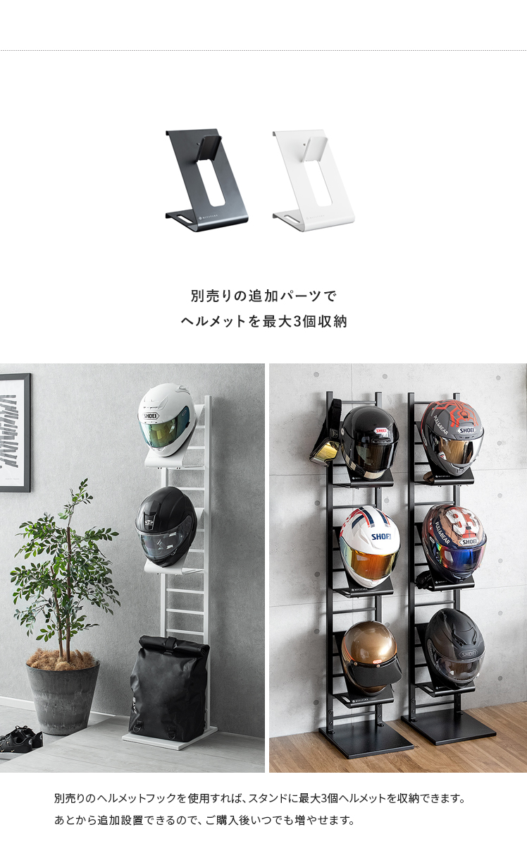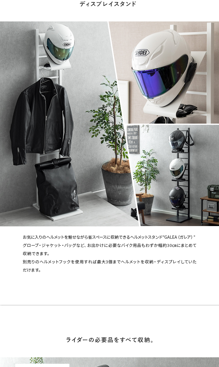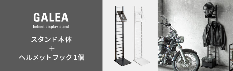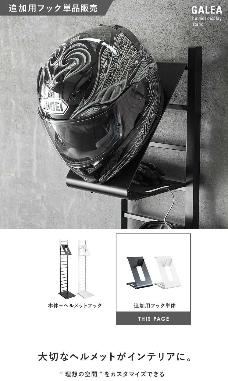 ヘルメットディスプレイスタンドGALEA〔ガレア〕追加用フック単体/お気に入りのヘルメットを魅せながら省スペースに収納できるヘルメットスタンド“GALEA(ガレア)”グローブ・ジャケット・バッグなど、お出かけに必要なバイク用品もわずか幅約30cmにまとめて収納できます。別売りのヘルメットフックを使用すれば最大3個までヘルメットを収納・ディスプレイしていただけます。