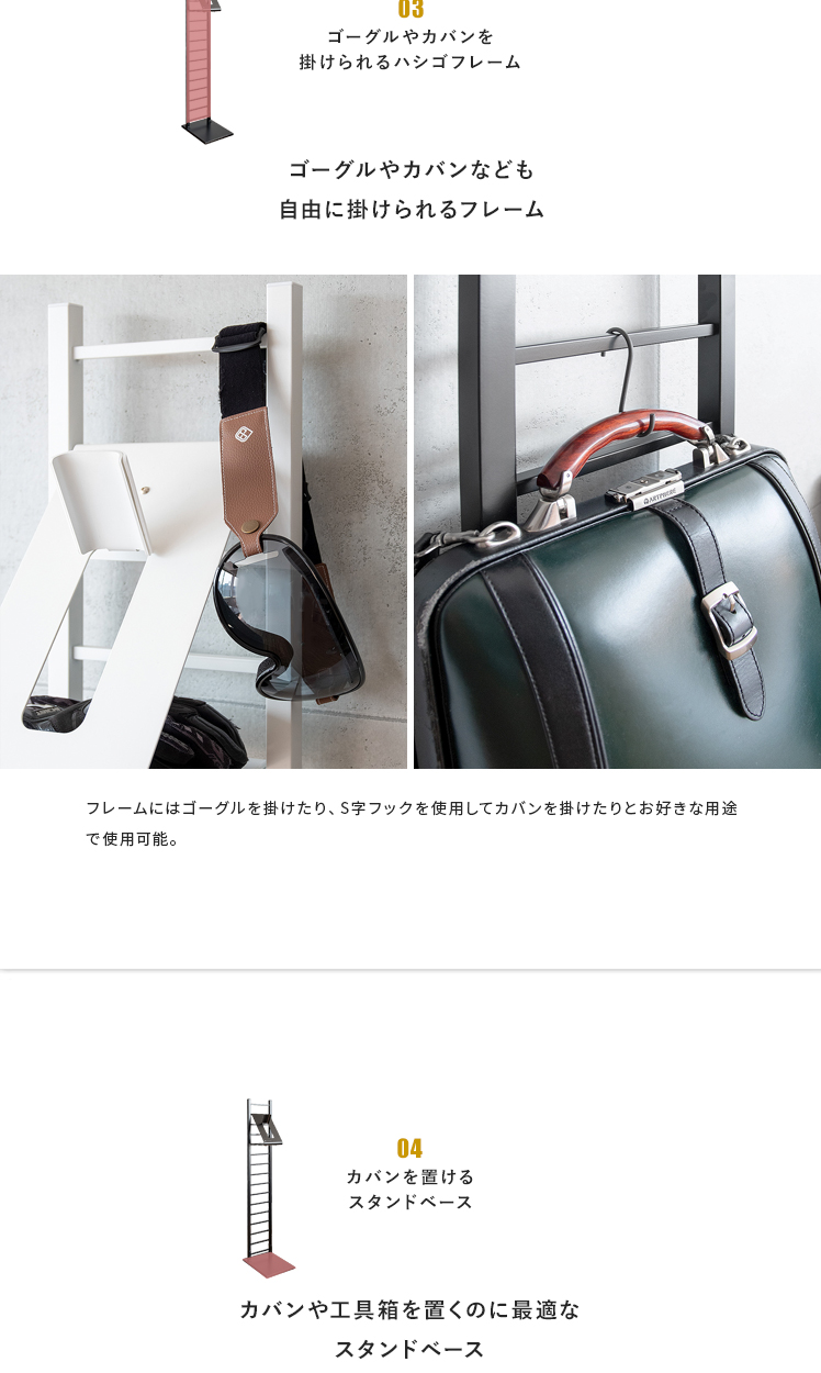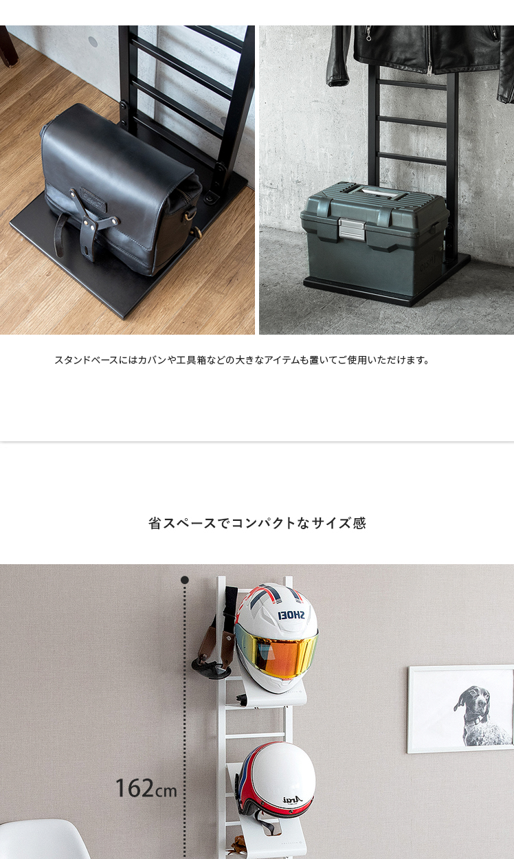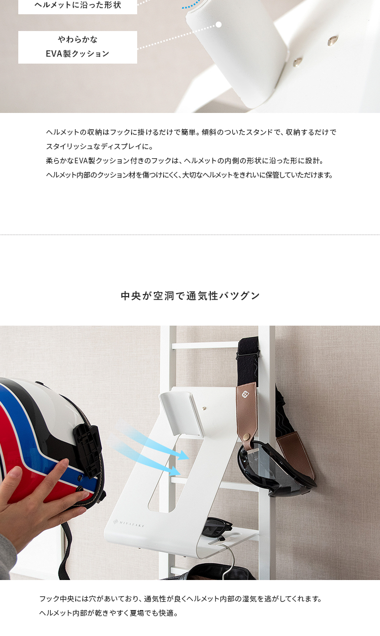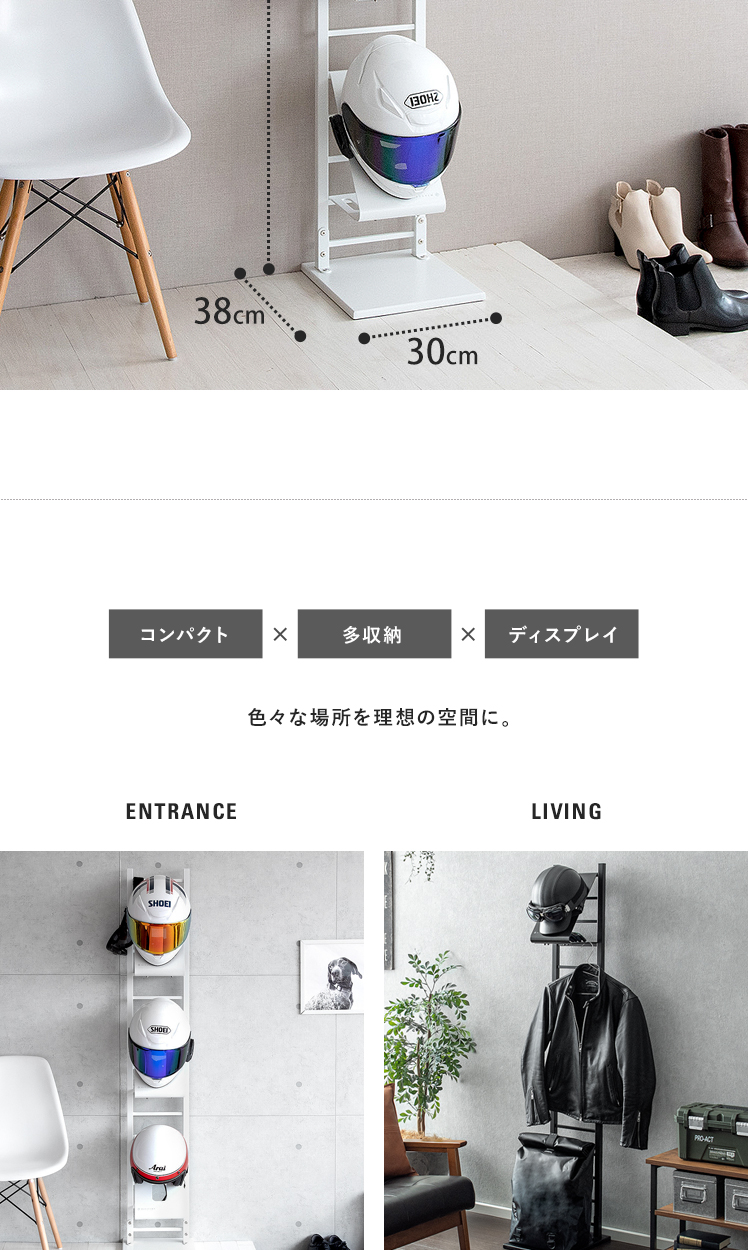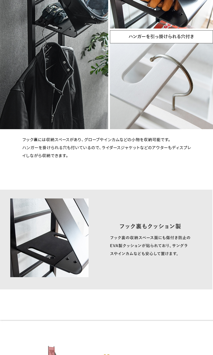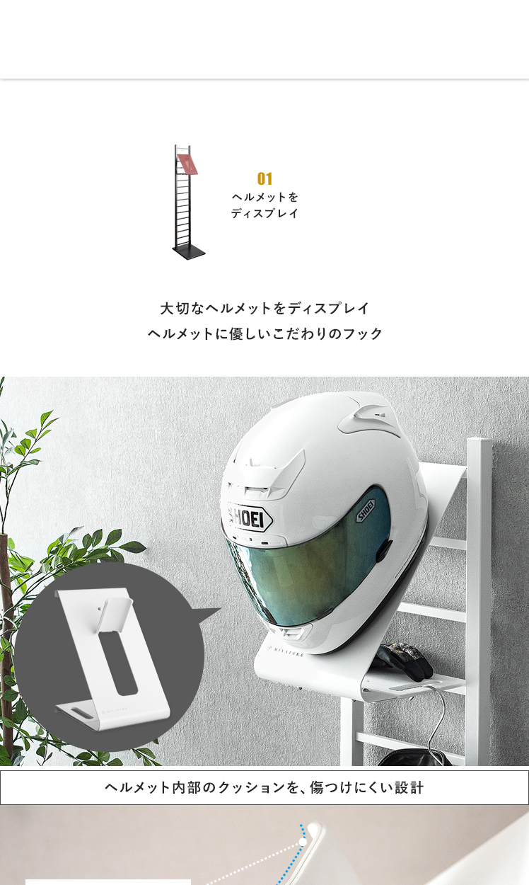 ヘルメットディスプレイスタンドGALEA〔ガレア〕追加用フック単体/お気に入りのヘルメットを魅せながら省スペースに収納できるヘルメットスタンド“GALEA(ガレア)”グローブ・ジャケット・バッグなど、お出かけに必要なバイク用品もわずか幅約30cmにまとめて収納できます。別売りのヘルメットフックを使用すれば最大3個までヘルメットを収納・ディスプレイしていただけます。