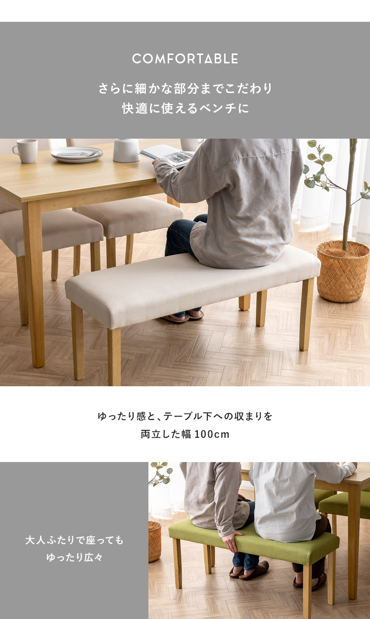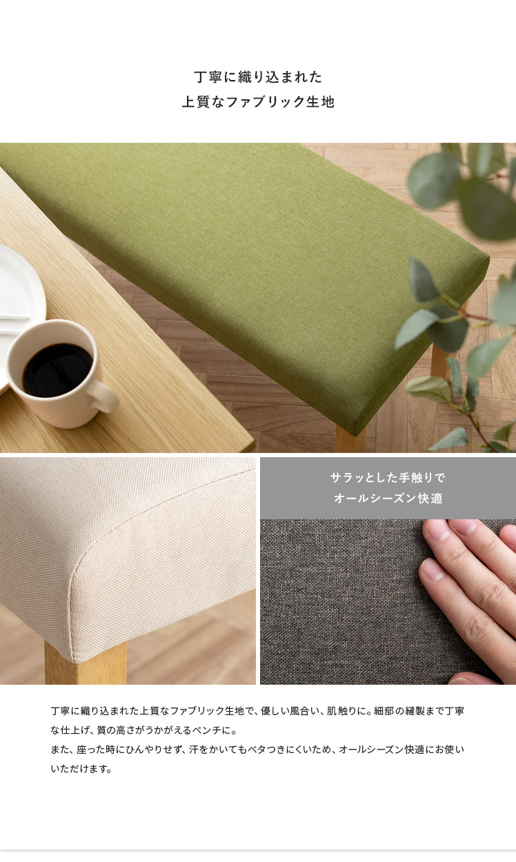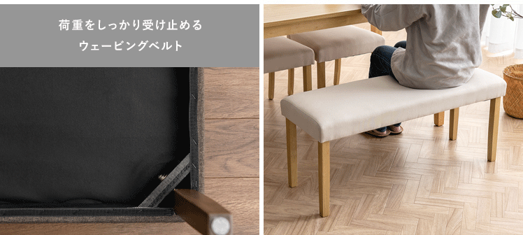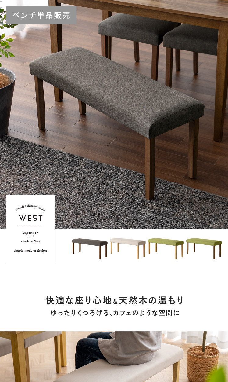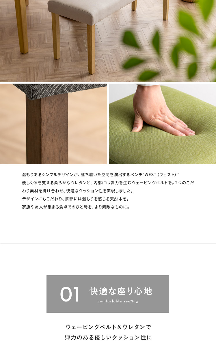 シンプルデザインベンチ WEST〔ウェスト〕ベンチ単品販売/温もりあるシンプルデザインが、落ち着いた空間を演出するベンチ“WEST(ウェスト)”優しく体を支える柔らかなウレタンと、内部には弾力を生むウェービングベルトを。2つのこだわり素材を掛け合わせ、快適なクッション性を実現しました。デザインにもこだわり、脚部には温もりを感じる天然木を。家族や友人が集まる食卓でのひと時を、より素敵なものに。