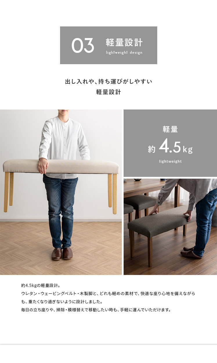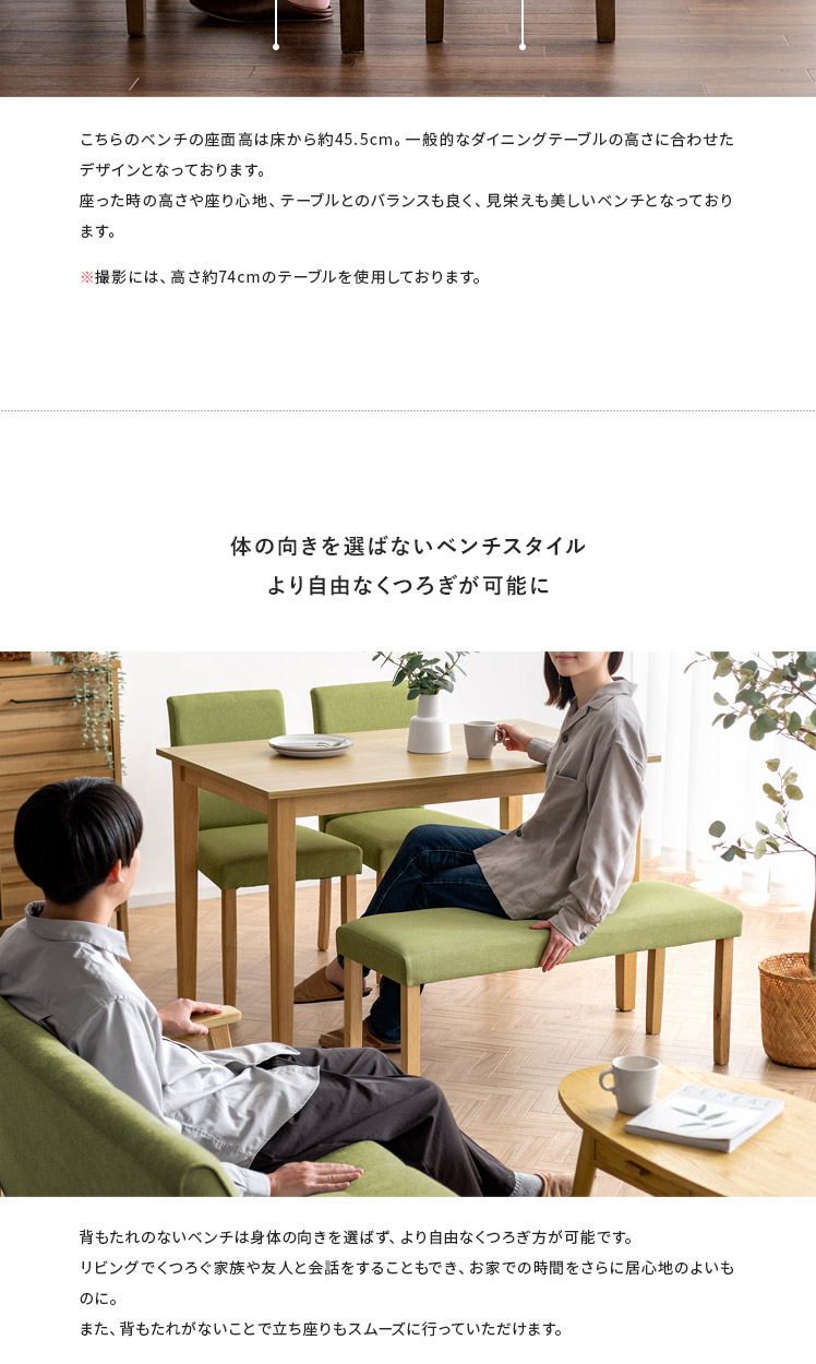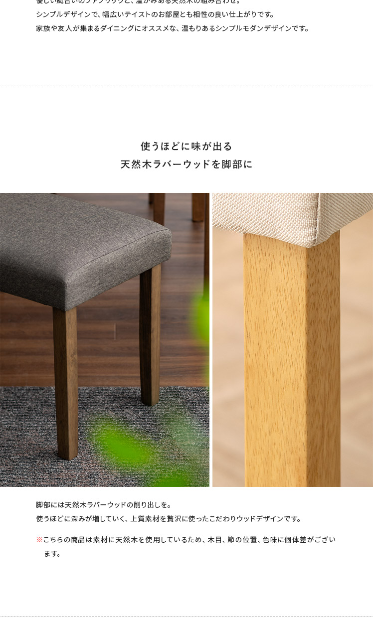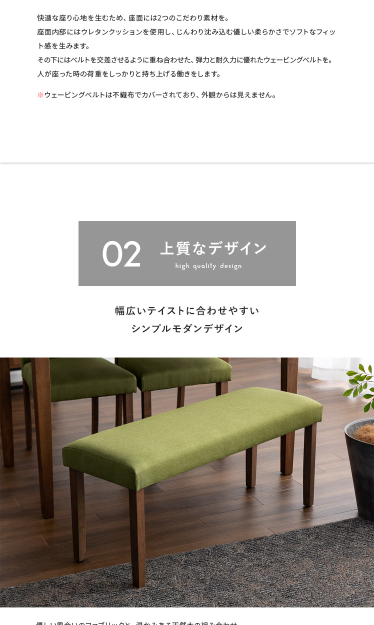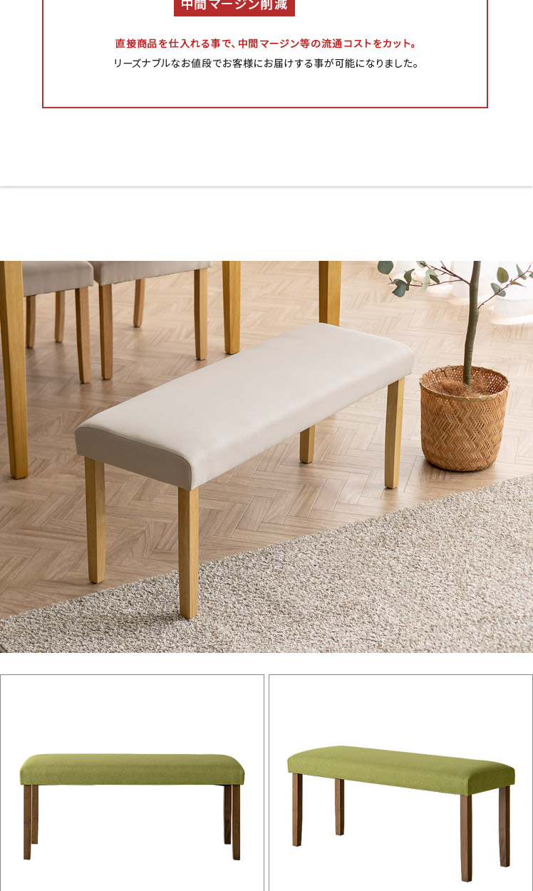 シンプルデザインベンチ WEST〔ウェスト〕ベンチ単品販売/温もりあるシンプルデザインが、落ち着いた空間を演出するベンチ“WEST(ウェスト)”優しく体を支える柔らかなウレタンと、内部には弾力を生むウェービングベルトを。2つのこだわり素材を掛け合わせ、快適なクッション性を実現しました。デザインにもこだわり、脚部には温もりを感じる天然木を。家族や友人が集まる食卓でのひと時を、より素敵なものに。