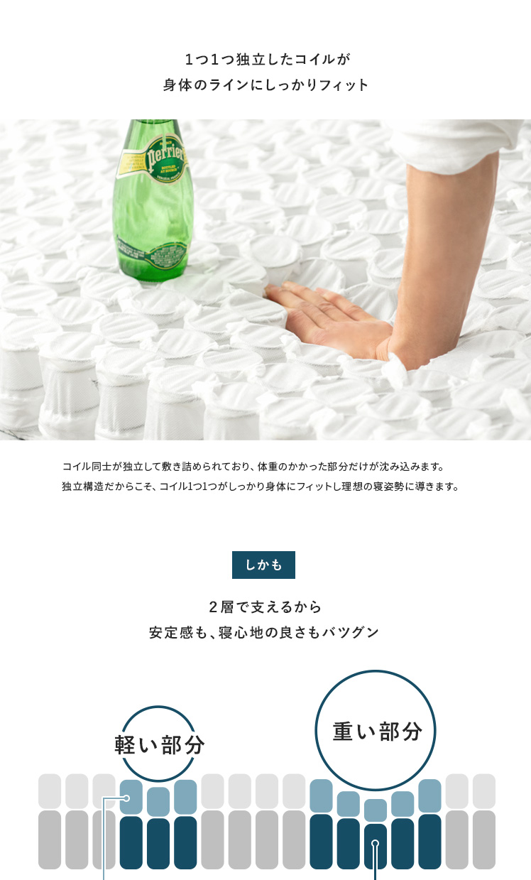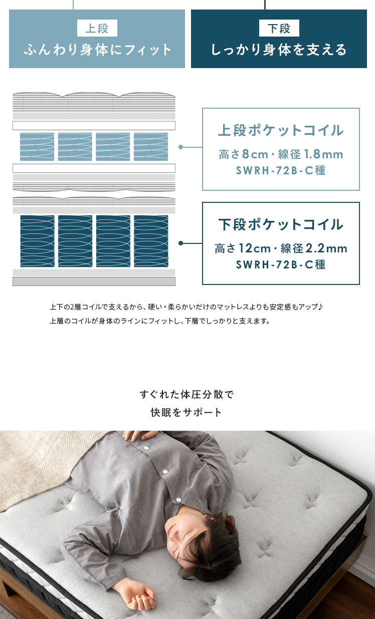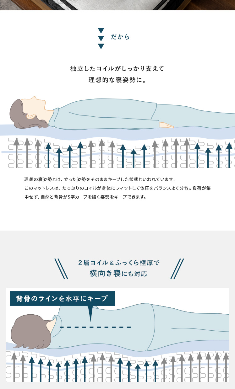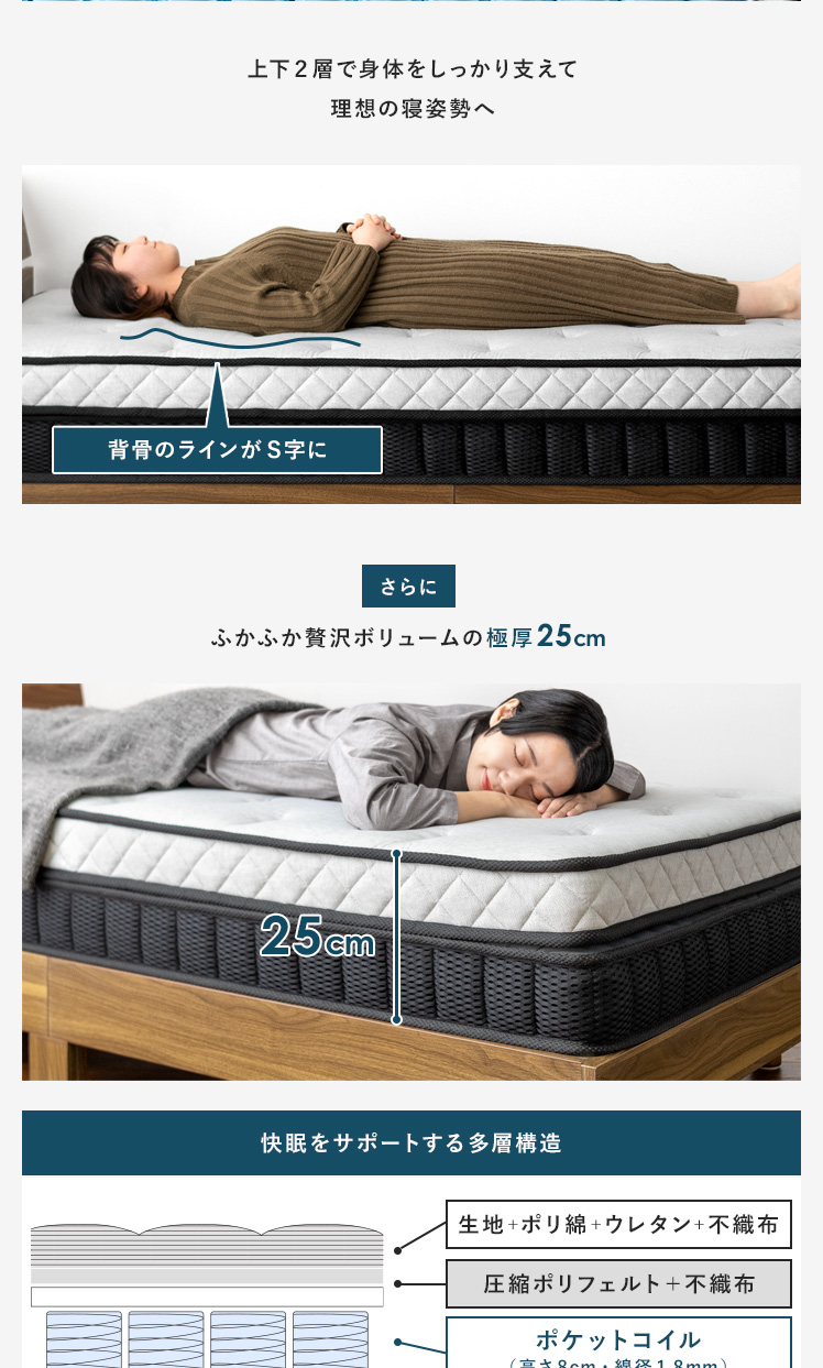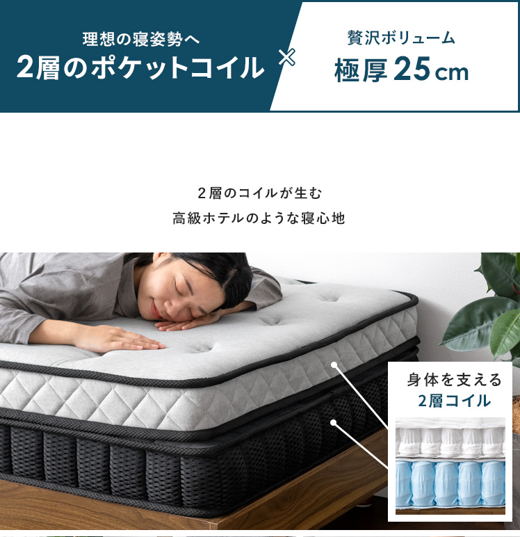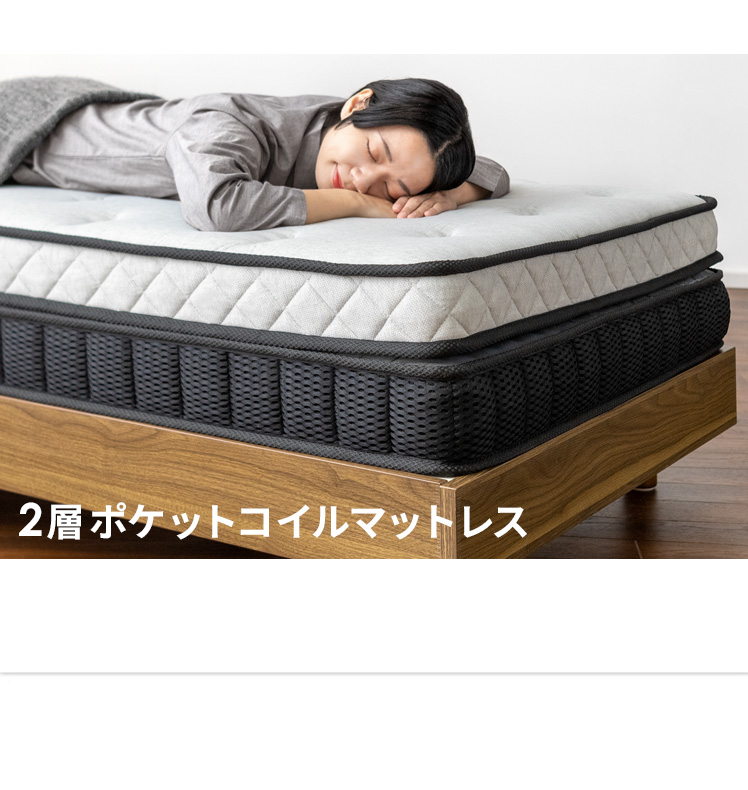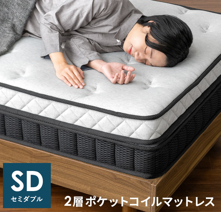 2層式ポケットコイルマットレス セミダブルサイズ/質の高い睡眠は、いい寝姿勢から。このマットレスは上下2層で身体をしっかり支えるポケットコイルを採用。自然と背骨のラインをS字にキープし、理想の寝姿勢をつくります。さらに、厚さは約25cmと贅沢ボリューム♪ふかふかの多層構造で、朝までぐっすりの快眠をサポートします。