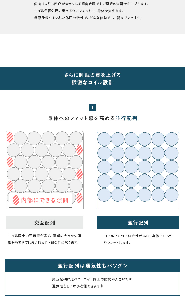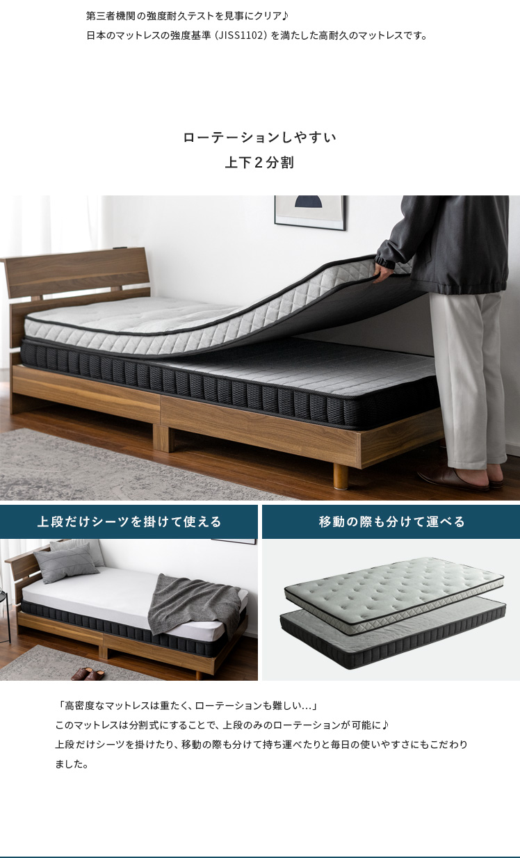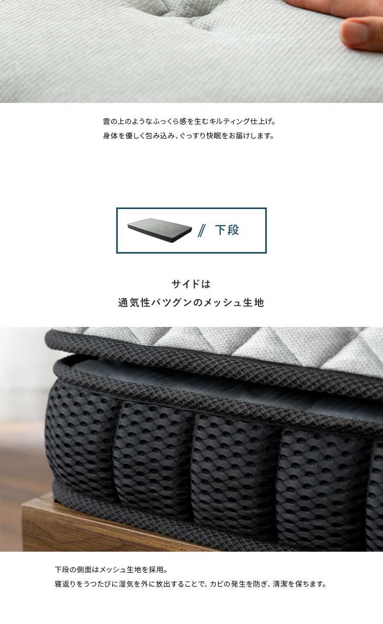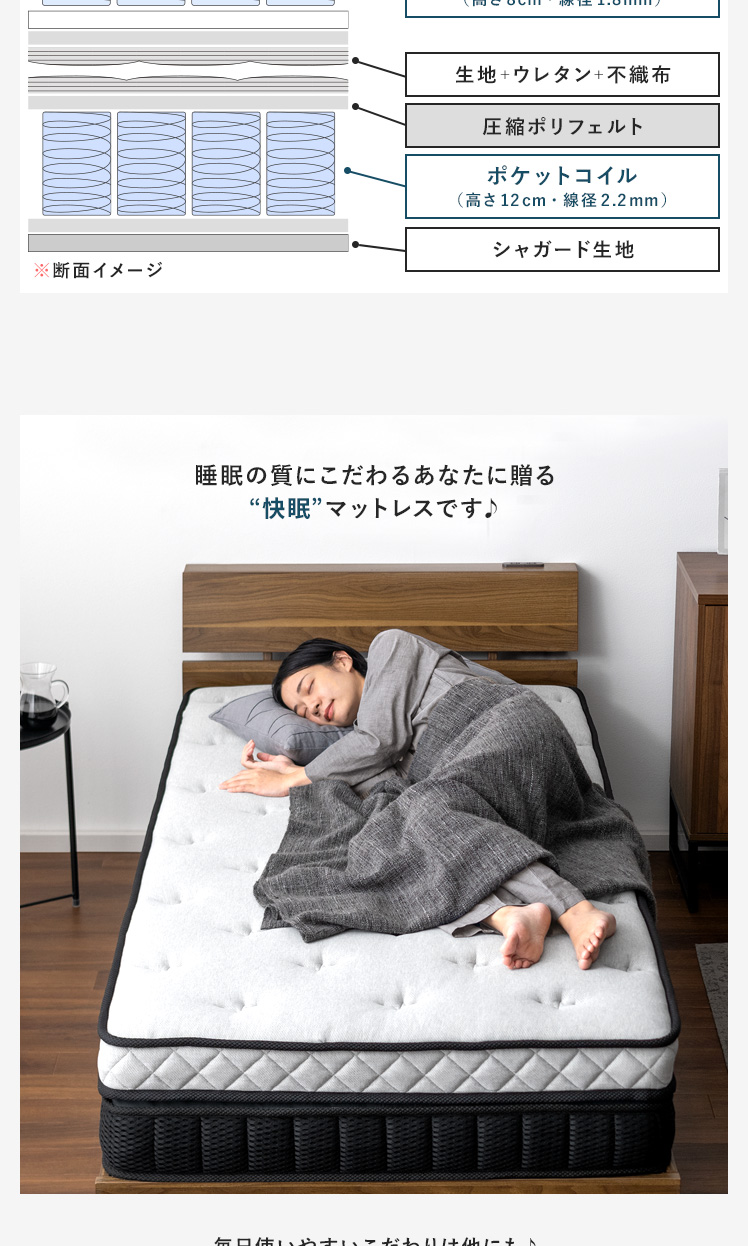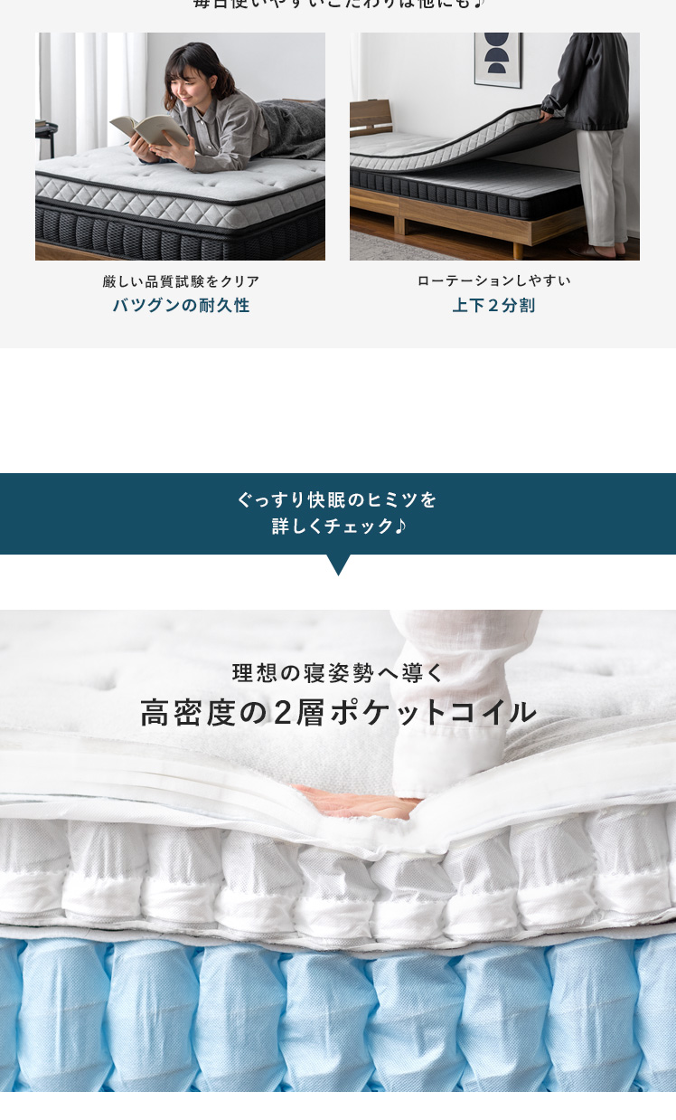 2層式ポケットコイルマットレス セミダブルサイズ/質の高い睡眠は、いい寝姿勢から。このマットレスは上下2層で身体をしっかり支えるポケットコイルを採用。自然と背骨のラインをS字にキープし、理想の寝姿勢をつくります。さらに、厚さは約25cmと贅沢ボリューム♪ふかふかの多層構造で、朝までぐっすりの快眠をサポートします。