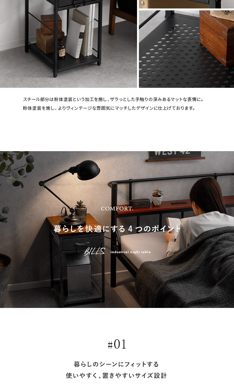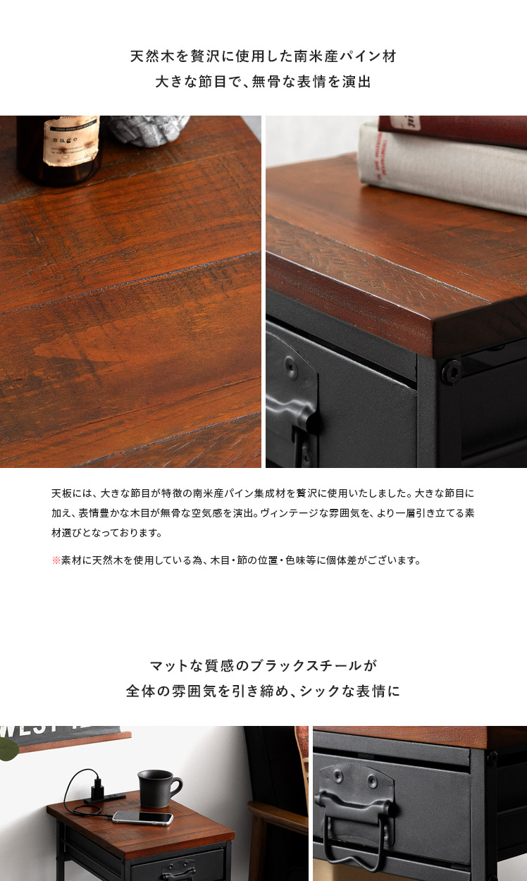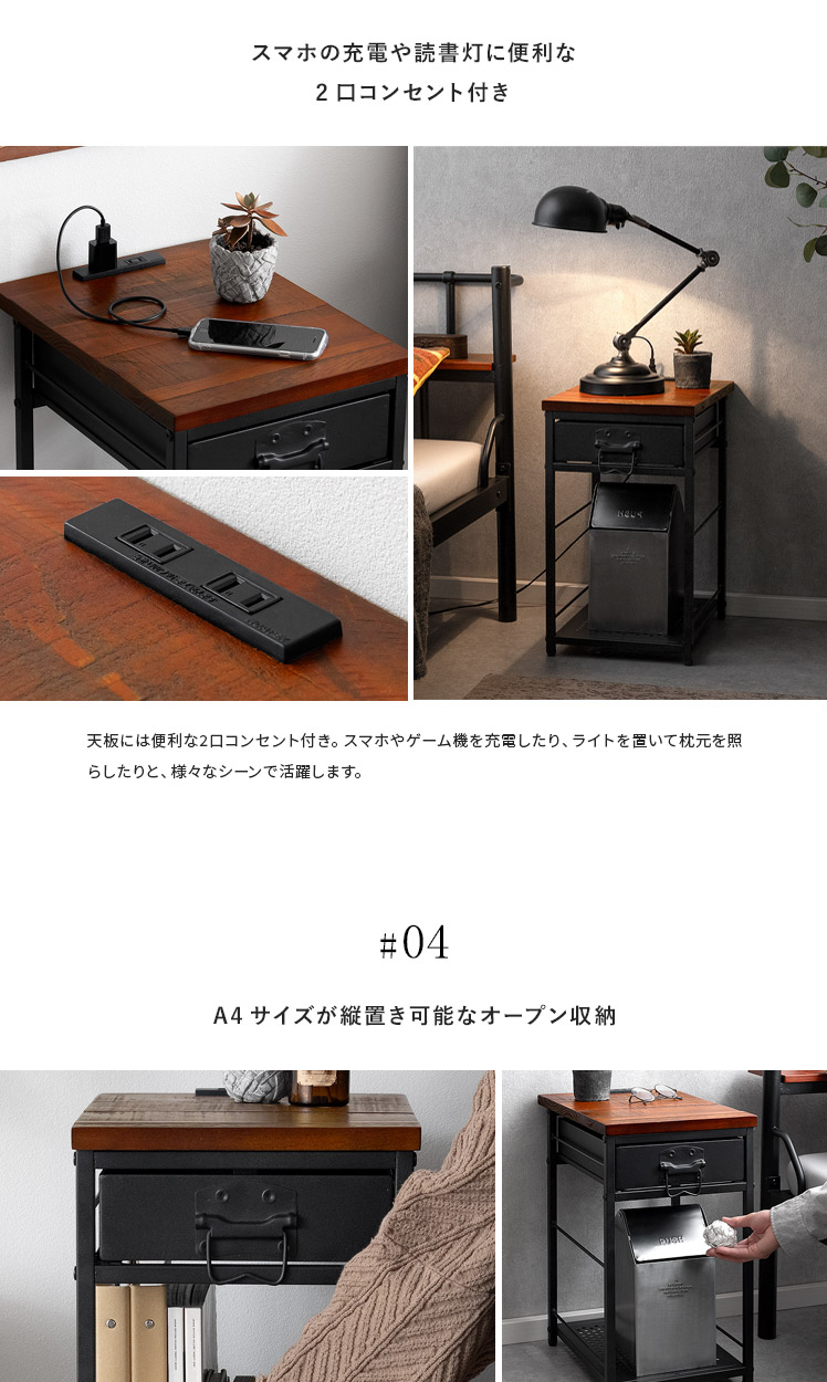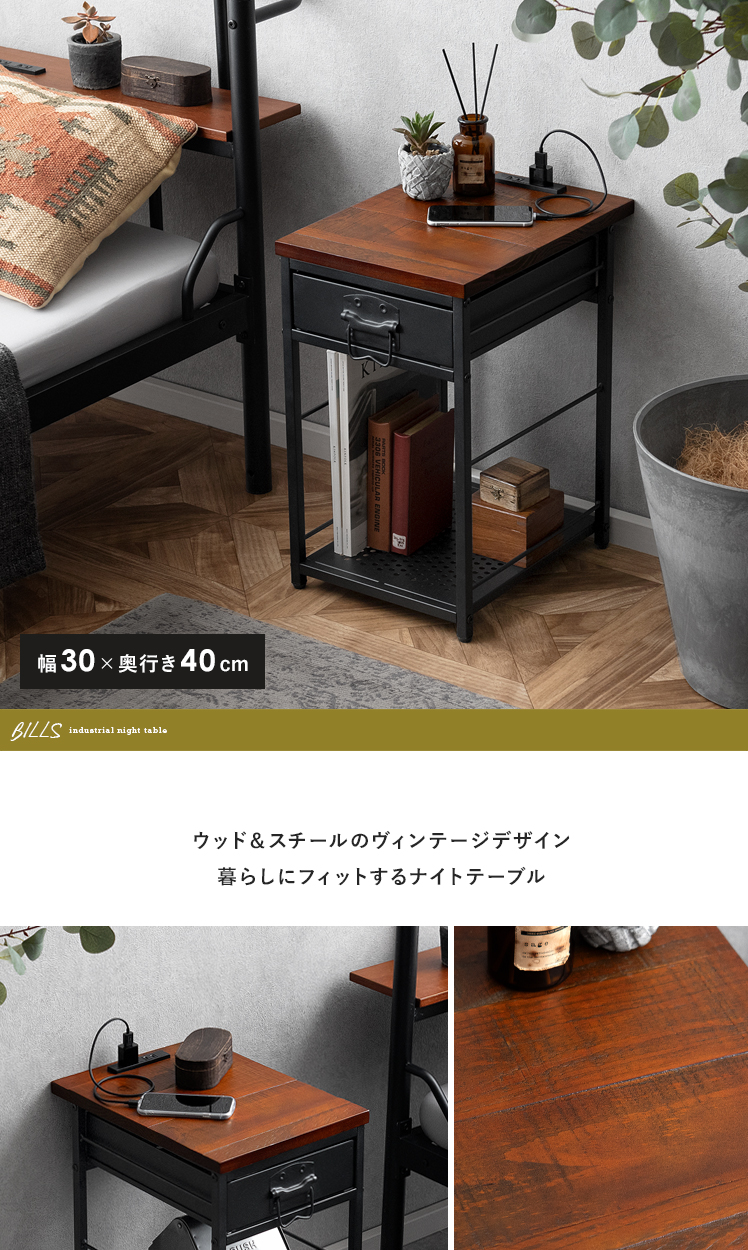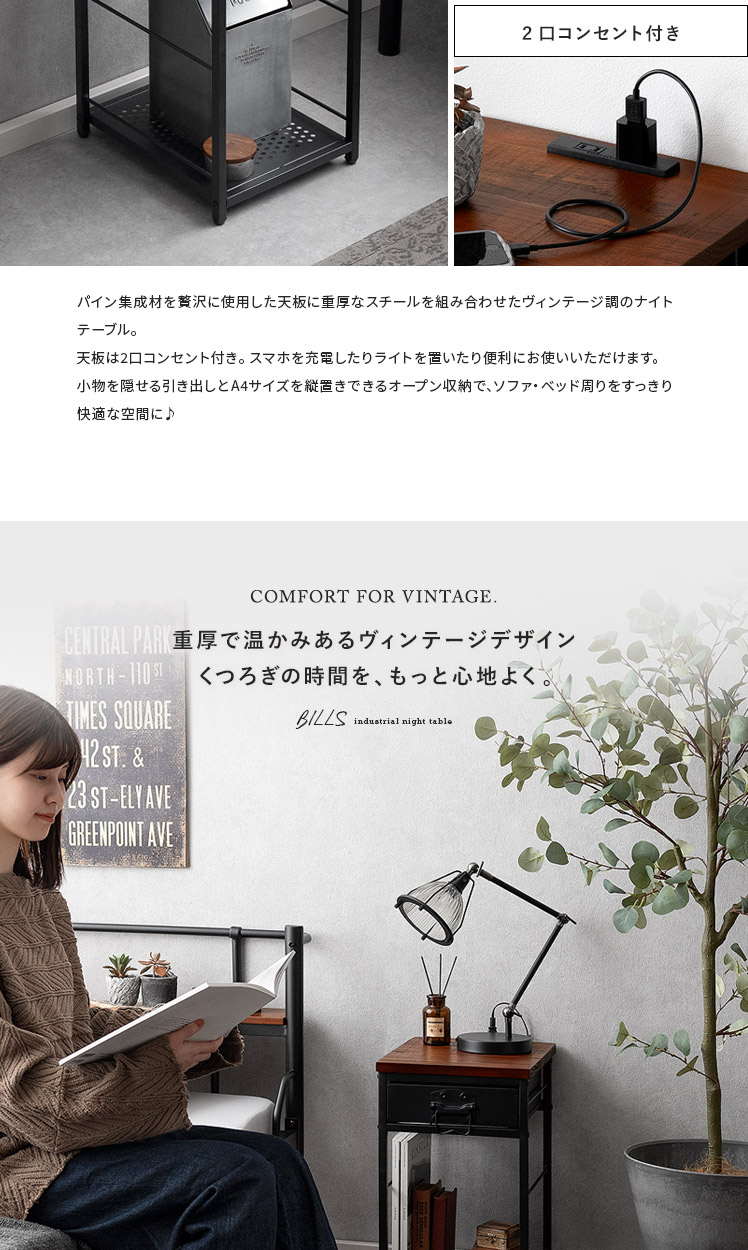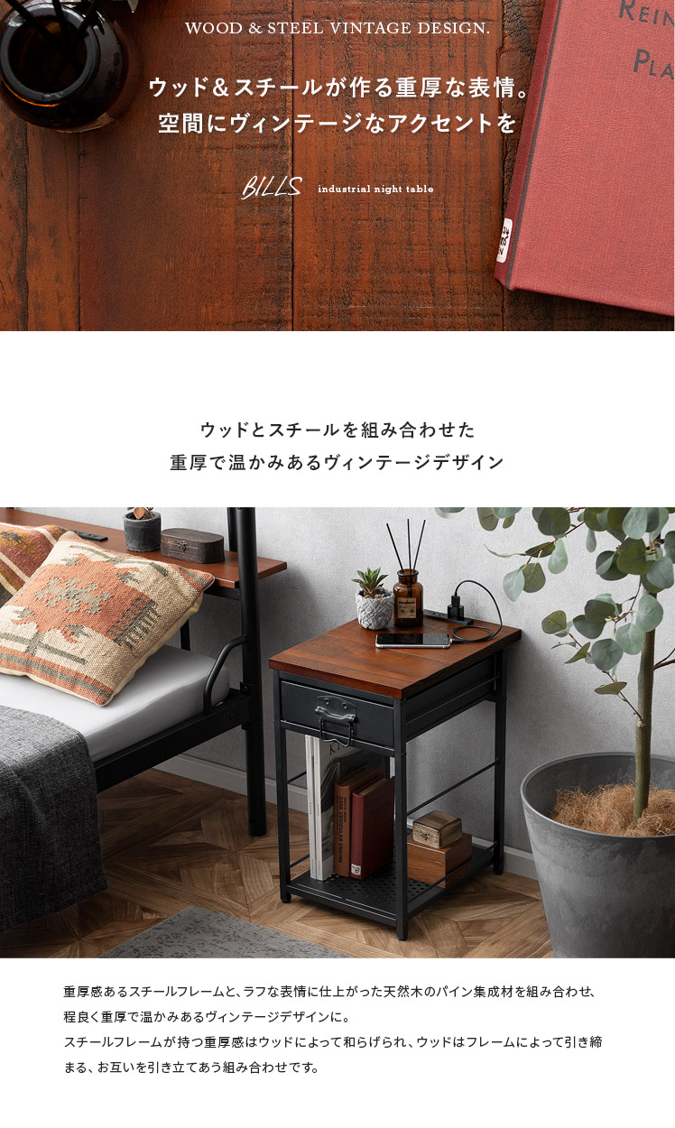 ヴィンテージ調ナイトテーブル BILLS〔ビルズ〕/パイン集成材を贅沢に使用した天板に重厚なスチールを組み合わせたヴィンテージ調のナイトテーブル。天板は2口コンセント付き。スマホを充電したりライトを置いたり便利にお使いいただけます。小物を隠せる引き出しとA4サイズを縦置きできるオープン収納で、ソファ・ベッド周りをすっきり快適な空間に♪