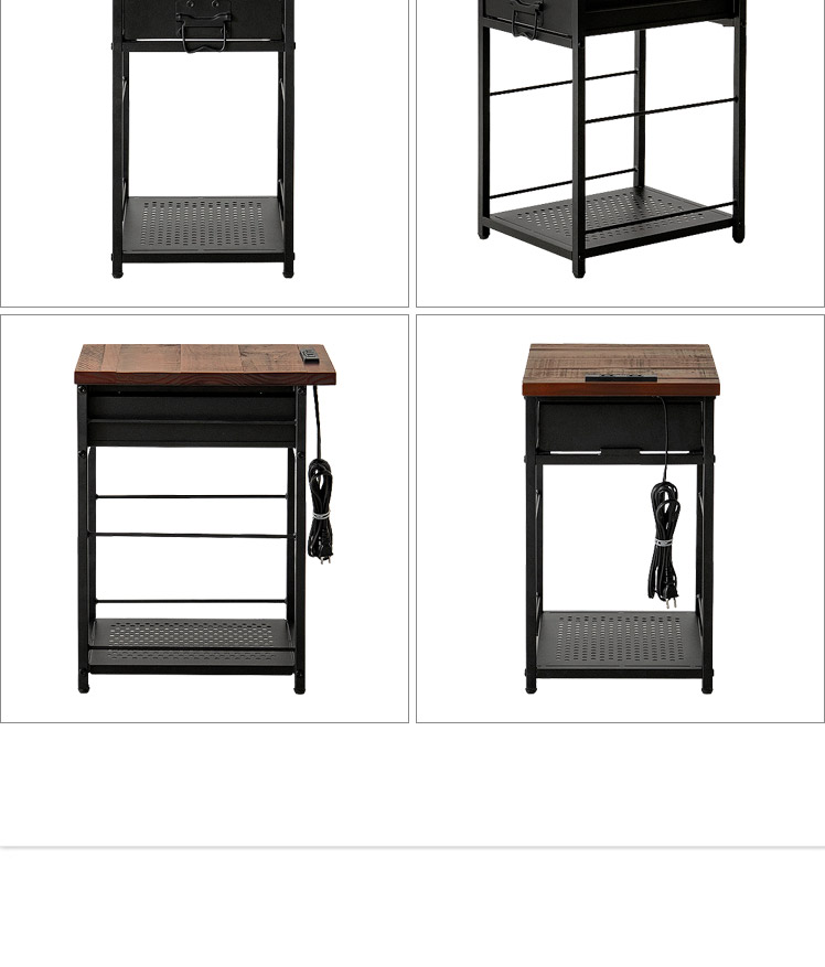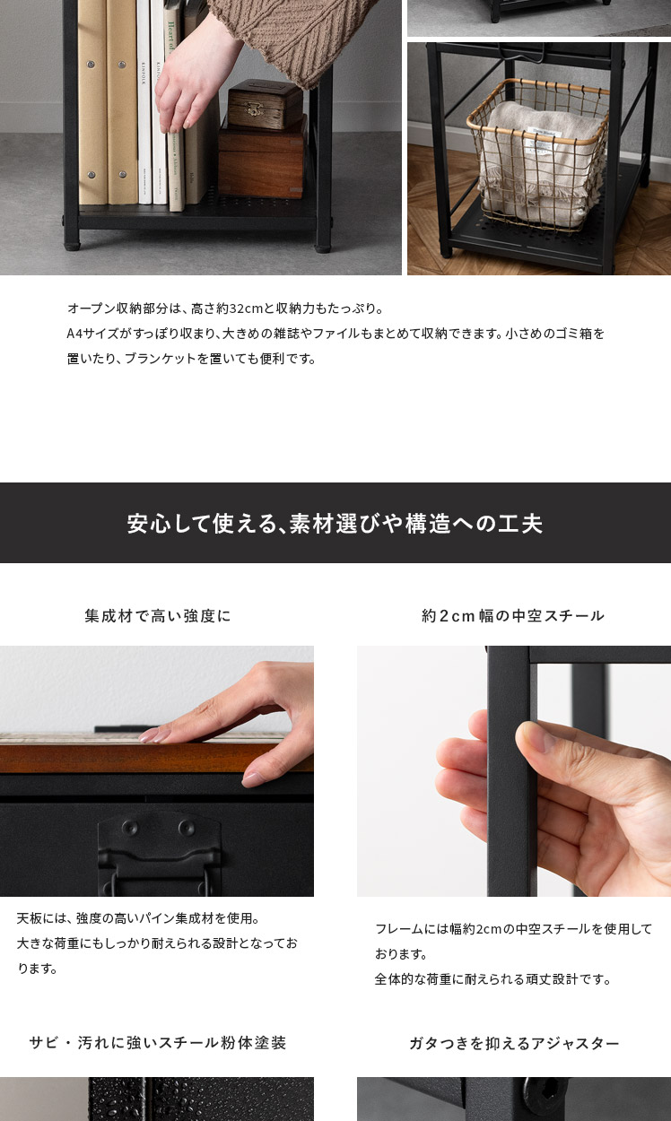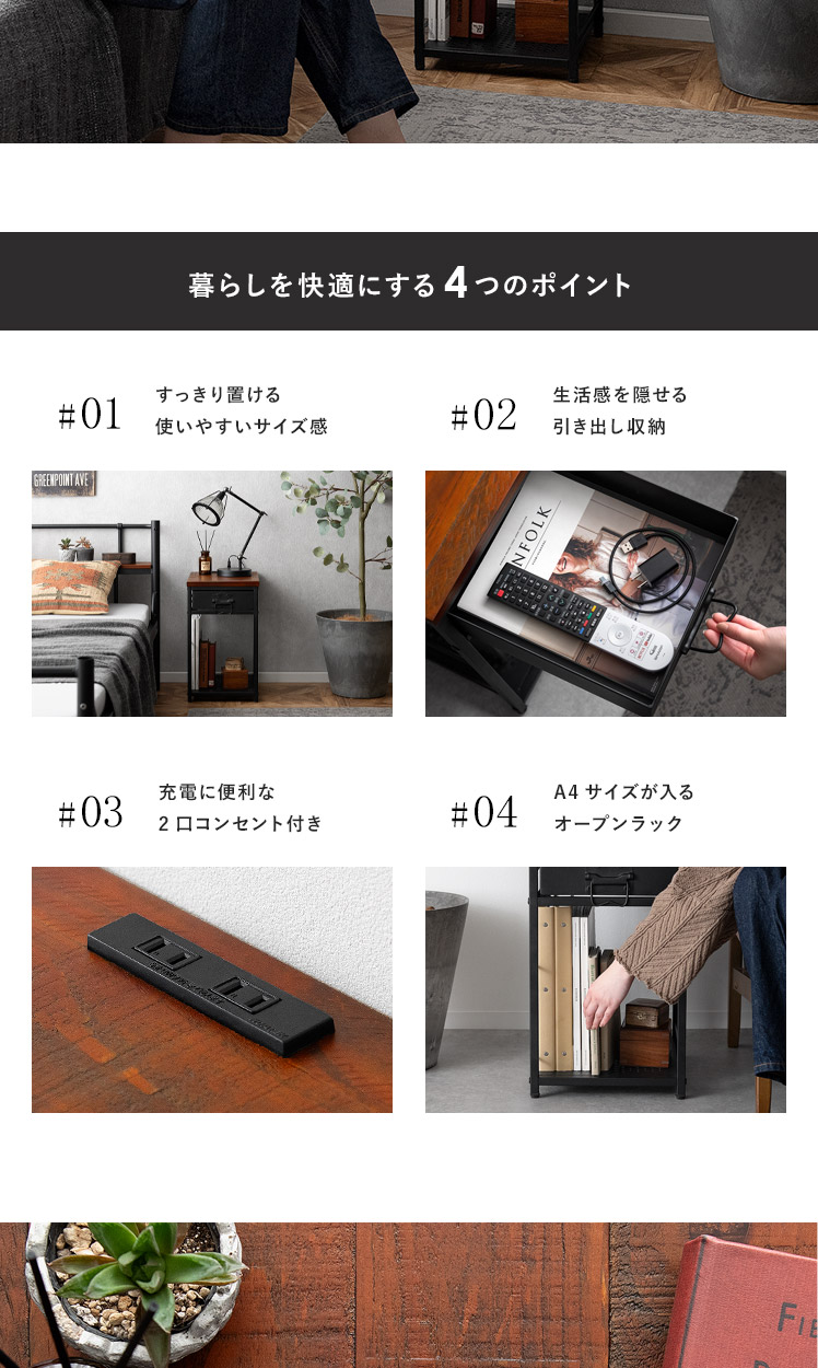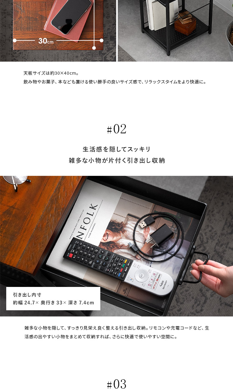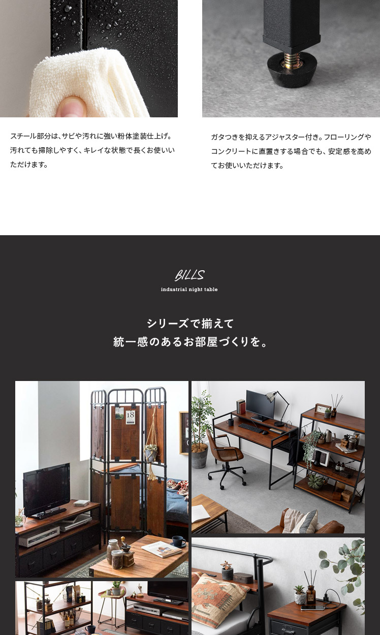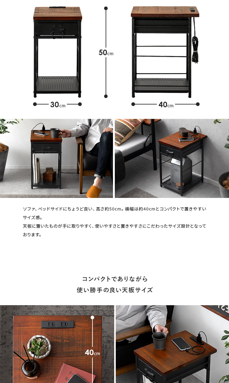 ヴィンテージ調ナイトテーブル BILLS〔ビルズ〕/パイン集成材を贅沢に使用した天板に重厚なスチールを組み合わせたヴィンテージ調のナイトテーブル。天板は2口コンセント付き。スマホを充電したりライトを置いたり便利にお使いいただけます。小物を隠せる引き出しとA4サイズを縦置きできるオープン収納で、ソファ・ベッド周りをすっきり快適な空間に♪