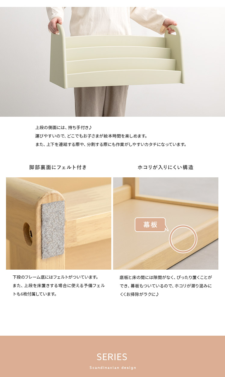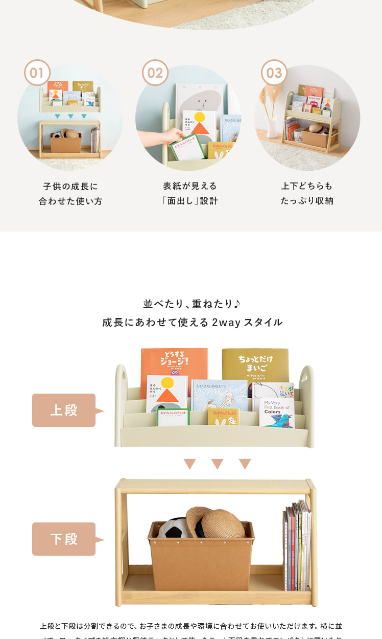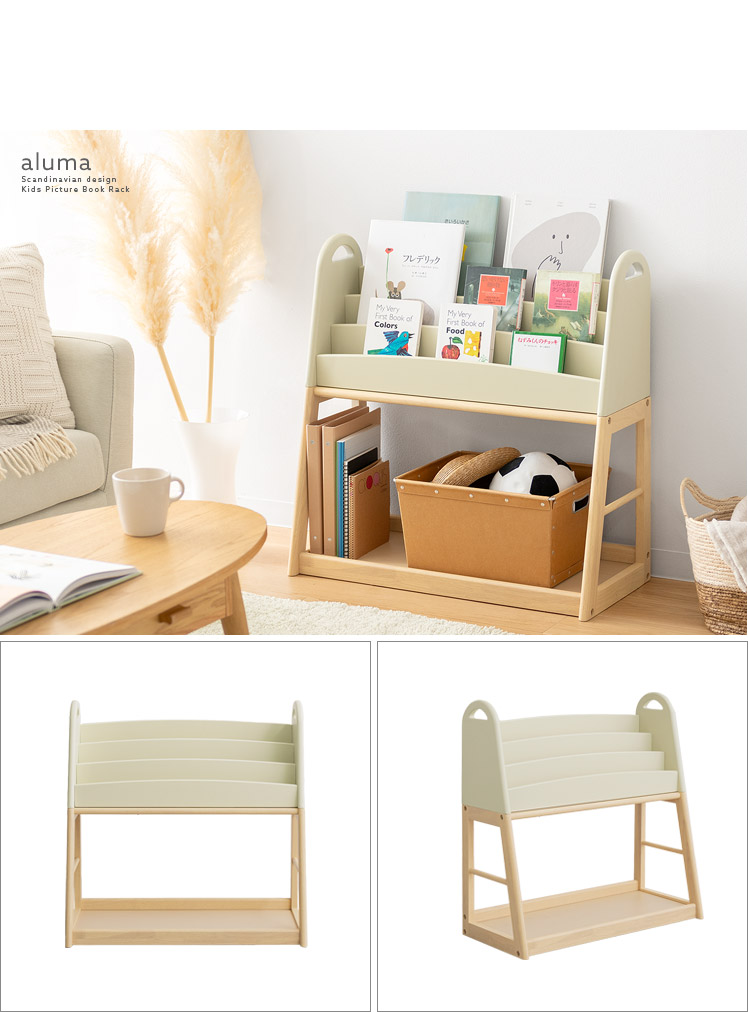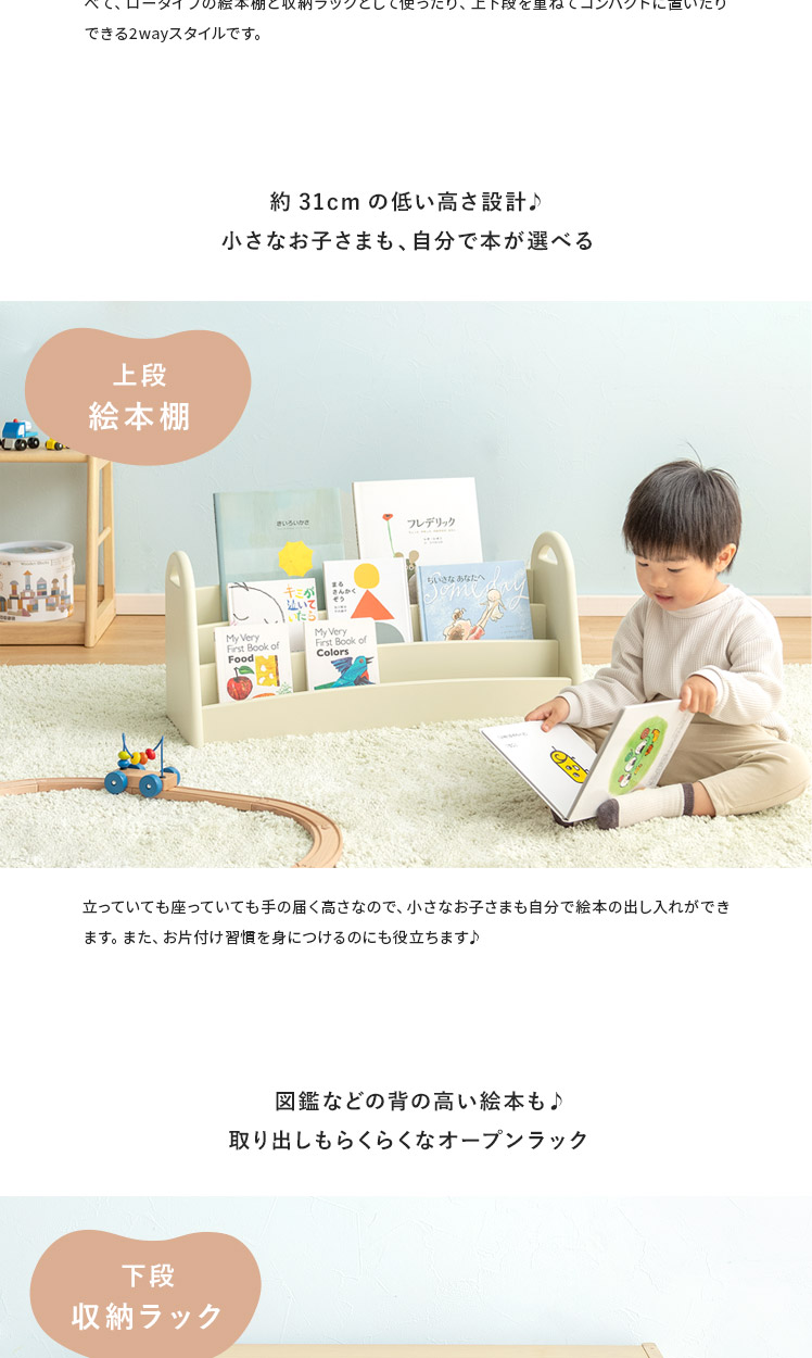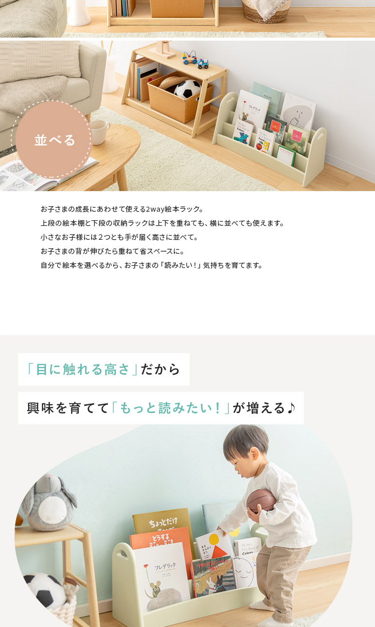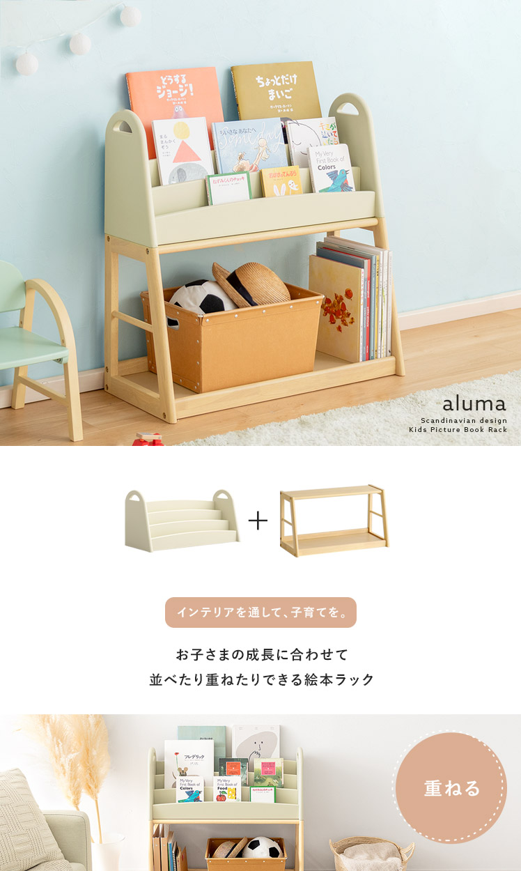 絵本ラック aluma〔アルマ〕/お子さまの成長にあわせて使える2way絵本ラック。上段の絵本棚と下段の収納ラックは上下を重ねても、横に並べても使えます。小さなお子様には2つとも手が届く高さに並べて。お子さまの背が伸びたら重ねて省スペースに。自分で絵本を選べるから、お子さまの「読みたい!」気持ちを育てます。