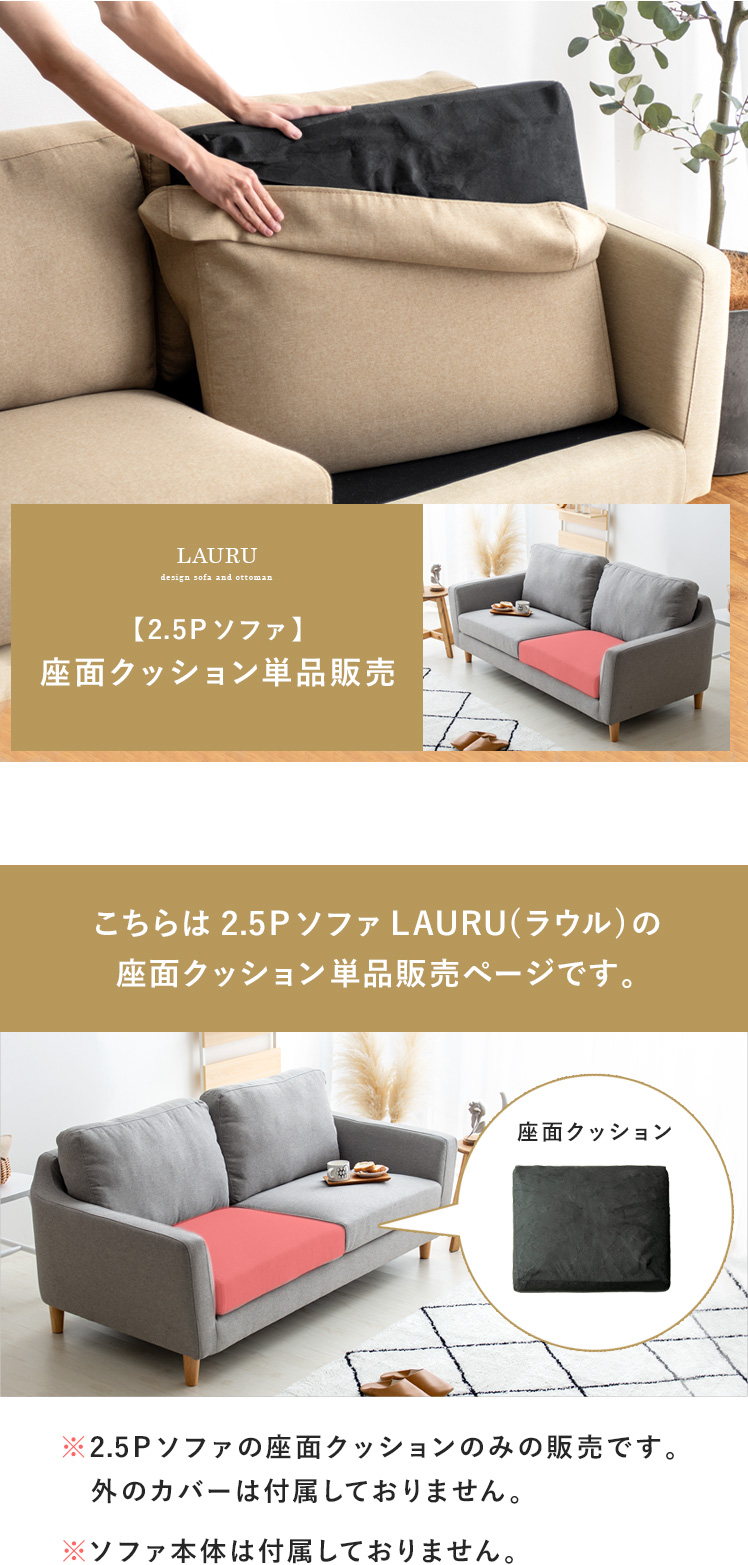 2.5Pデザインソファ LAURU〔ラウル〕 座面クッション単品販売/ソファを長く使っていると、こんなお悩みありませんか?・汚れやキズが気になる・クッションがへたってきた・模様替えしたいけど、ソファを買い替えるのは大変そうしたお悩みを解決する、アフターサービスを始めました♪座面と背もたれのカバー・クッション・脚部といった、気になる部分だけをお買い求めいただけます。本体を買い替えずに、当店のソファを長くご愛用いただけます。