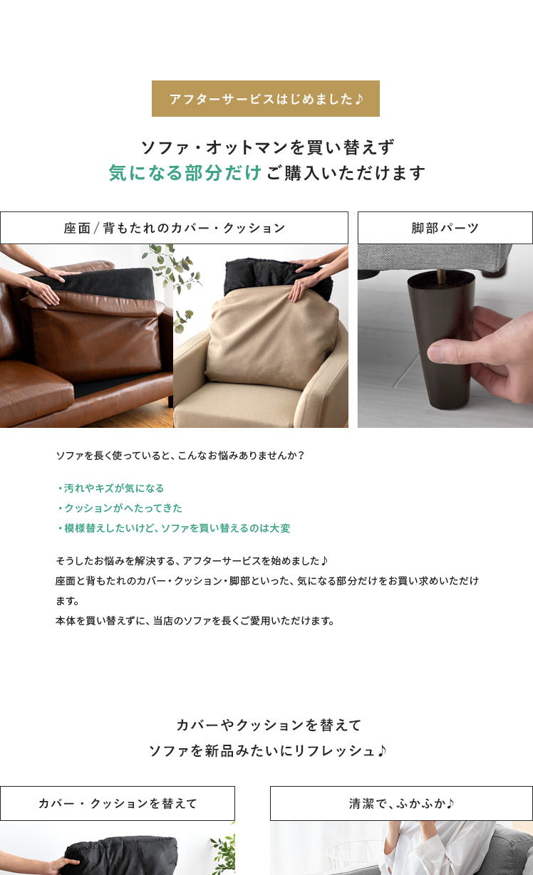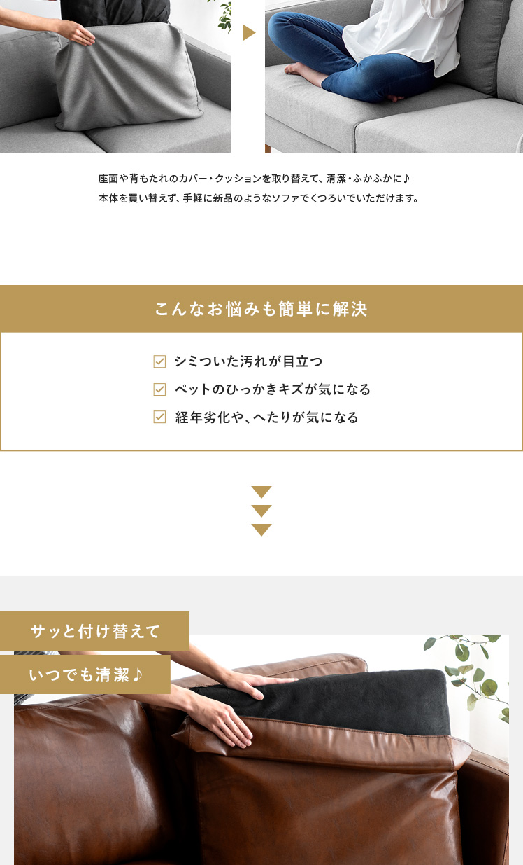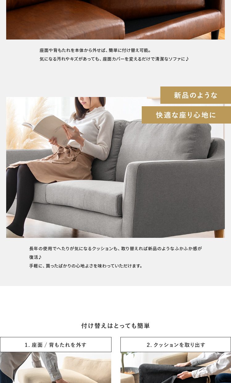 2.5Pデザインソファ LAURU〔ラウル〕 座面カバー&クッション単品販売/ソファを長く使っていると、こんなお悩みありませんか?・汚れやキズが気になる・クッションがへたってきた・模様替えしたいけど、ソファを買い替えるのは大変そうしたお悩みを解決する、アフターサービスを始めました♪座面と背もたれのカバー・クッション・脚部といった、気になる部分だけをお買い求めいただけます。本体を買い替えずに、当店のソファを長くご愛用いただけます。