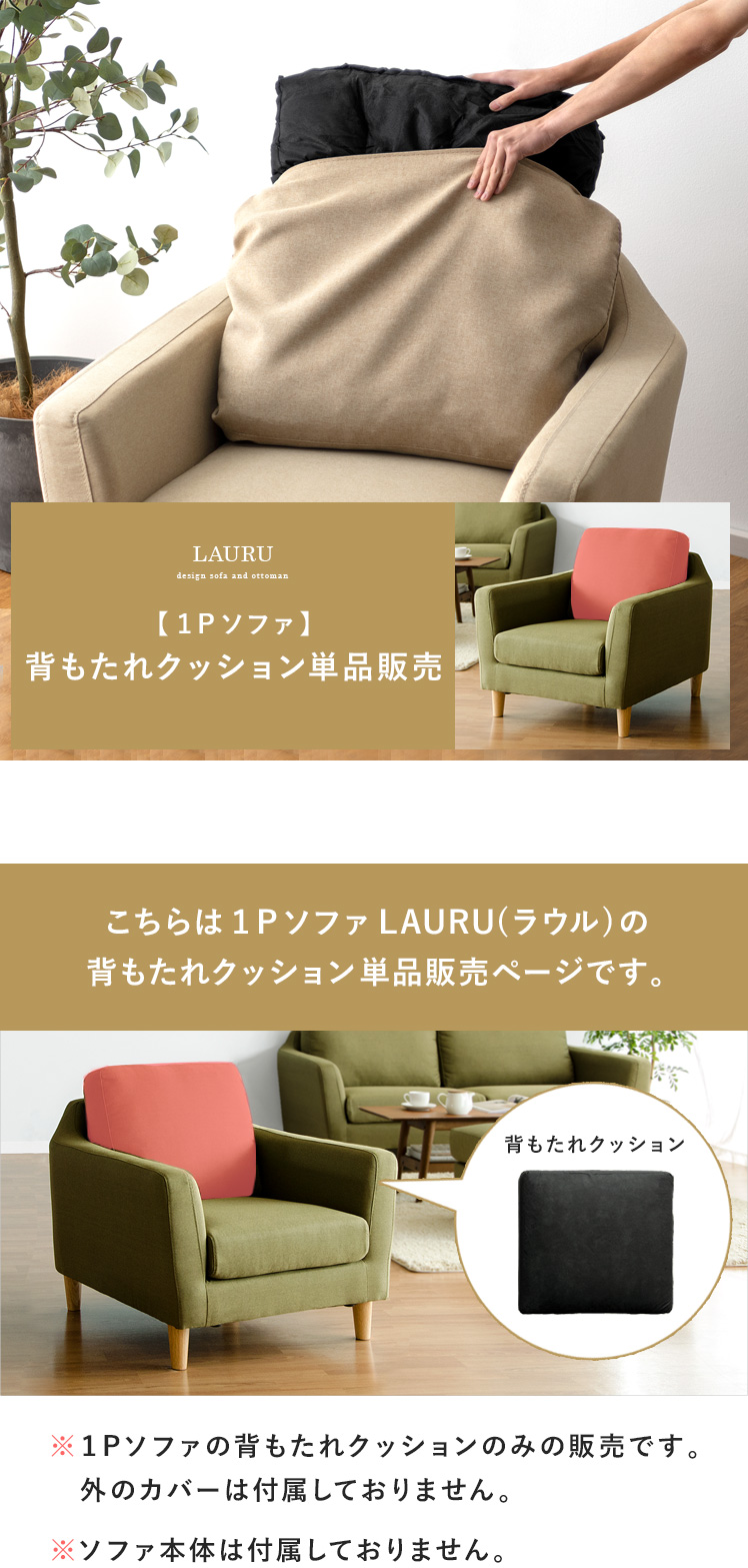 1Pソファ LAURU〔ラウル〕背もたれクッション単品販売/ソファを長く使っていると、こんなお悩みありませんか?・汚れやキズが気になる・クッションがへたってきた・模様替えしたいけど、ソファを買い替えるのは大変そうしたお悩みを解決する、アフターサービスを始めました♪座面と背もたれのカバー・クッション・脚部といった、気になる部分だけをお買い求めいただけます。本体を買い替えずに、当店のソファを長くご愛用いただけます。