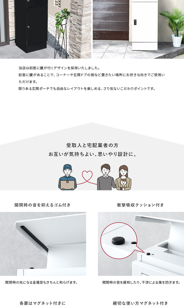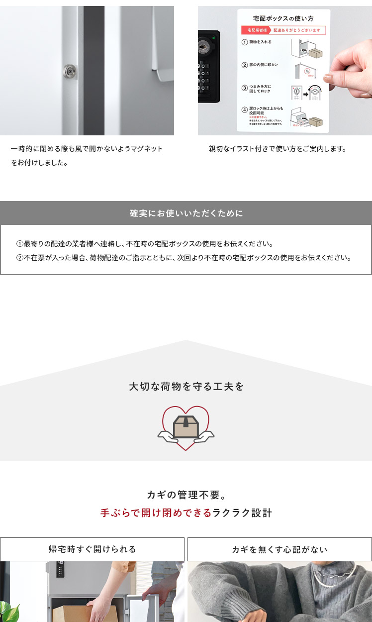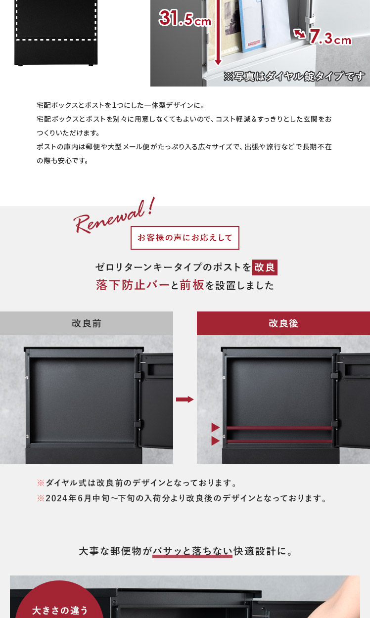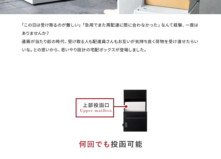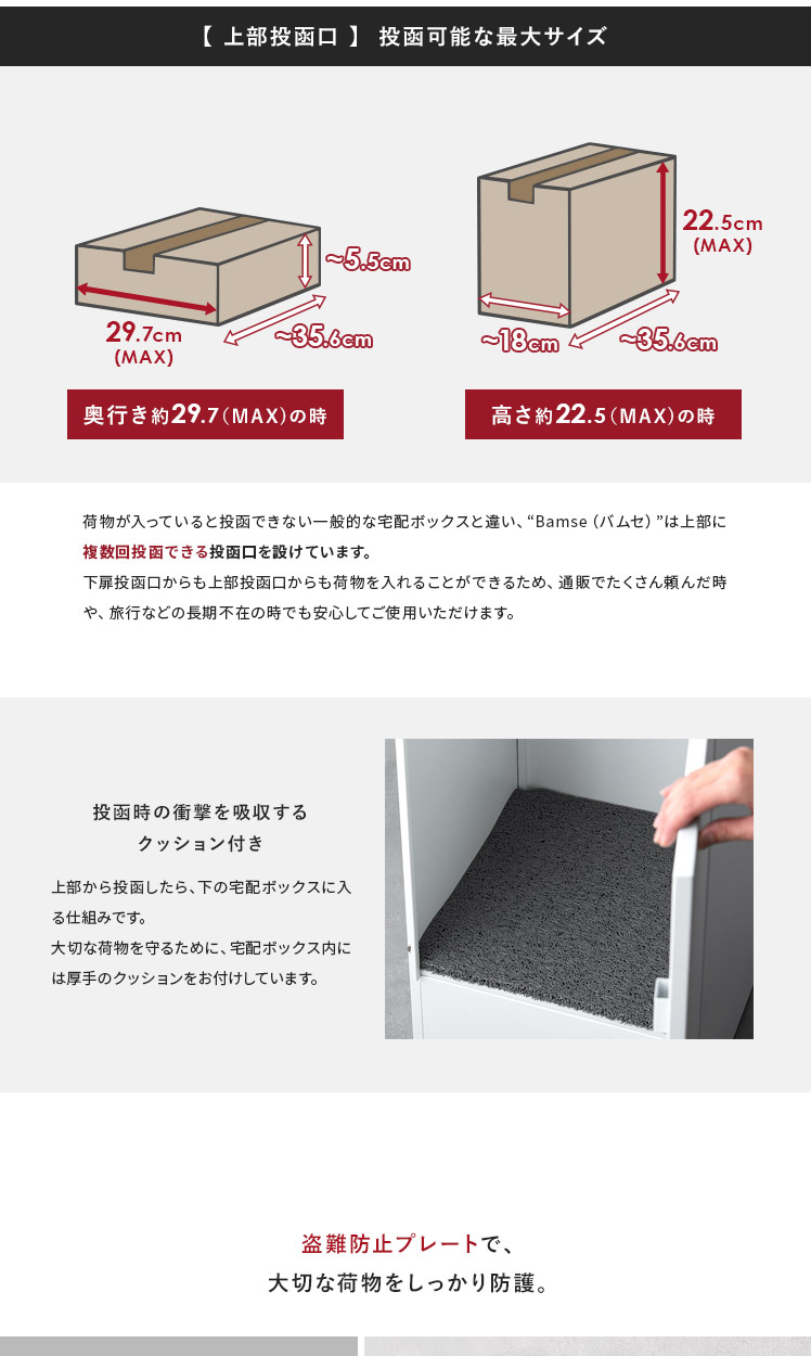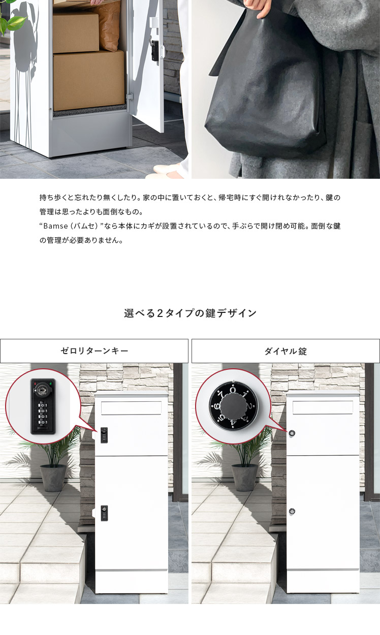 複数投函できるポスト一体型宅配ボックス Bamse〔バムセ〕 ゼロリターンキータイプ/「この日は受け取るのが難しい」「急用でまた再配達に間に合わなかった」なんて経験、一度はありませんか?通販が当たり前の時代、受け取る人も配達員さんもお互いが気持ち良く荷物を受け渡せたらいいな。との思いから、思いやり設計の宅配ボックスが登場しました。