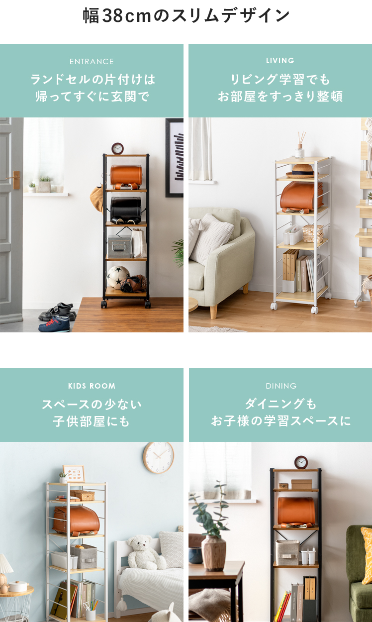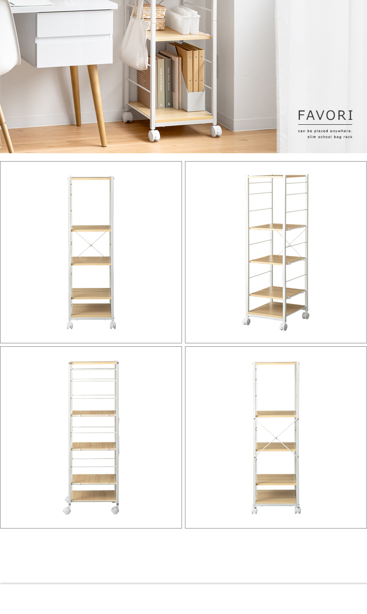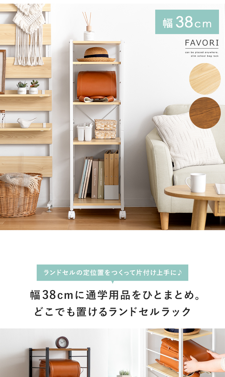 ランドセルラック FAVORI〔ファボリ〕 幅38cm/スリムな幅38cm。玄関やお部屋の片隅など、どこでも置けるランドセルラックができました。オープン収納だから、ランドセルのお片付けはサッと置くだけ♪棚板の高さを調整して、教科書や学校用品もまとめて収納♪簡単にできるからこそ、毎日のお片付けの習慣が身につきます。シンプルなデザインで、卒業後もお部屋のラックとして長くお使いいただけます。