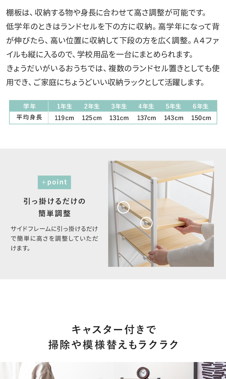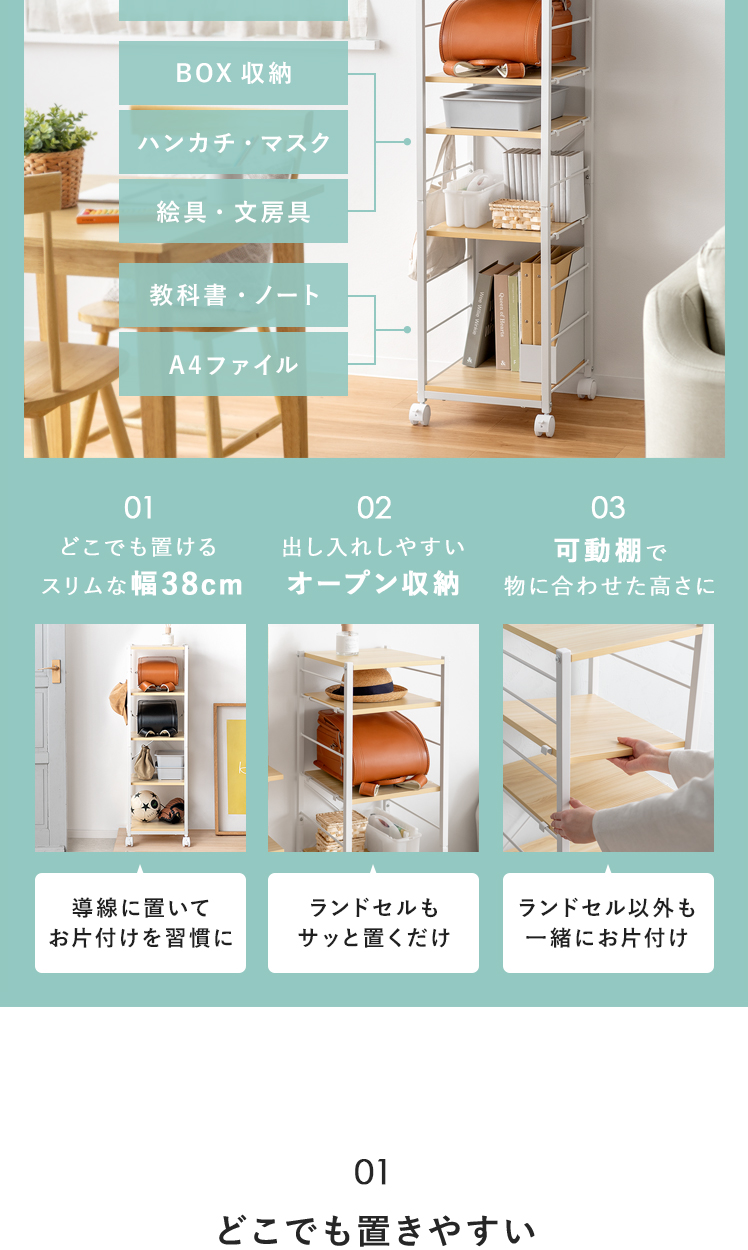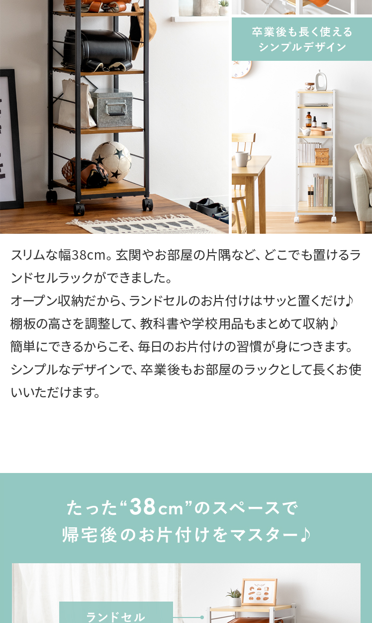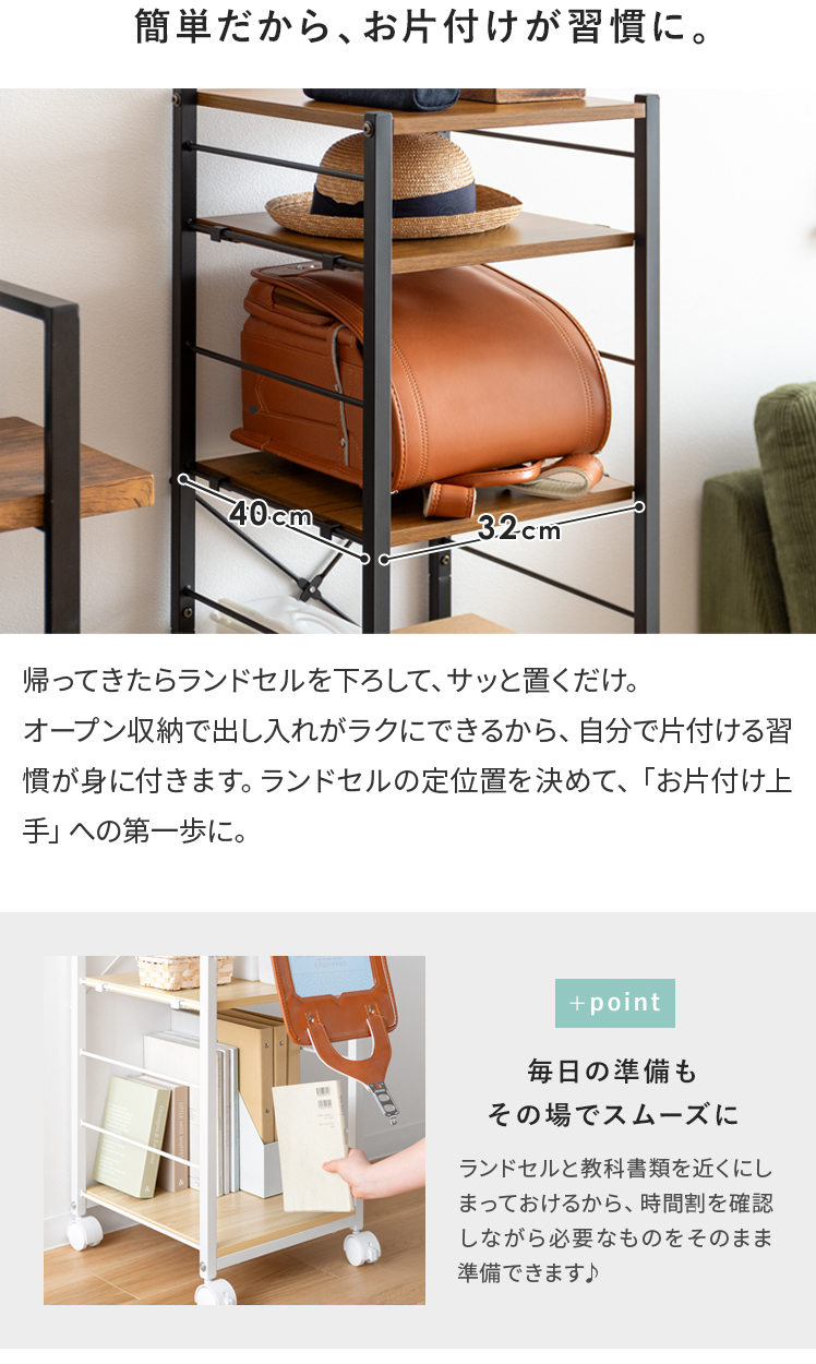 ランドセルラック FAVORI〔ファボリ〕 幅38cm/スリムな幅38cm。玄関やお部屋の片隅など、どこでも置けるランドセルラックができました。オープン収納だから、ランドセルのお片付けはサッと置くだけ♪棚板の高さを調整して、教科書や学校用品もまとめて収納♪簡単にできるからこそ、毎日のお片付けの習慣が身につきます。シンプルなデザインで、卒業後もお部屋のラックとして長くお使いいただけます。