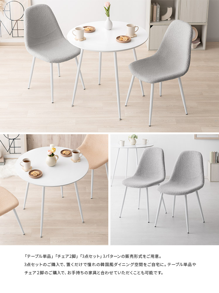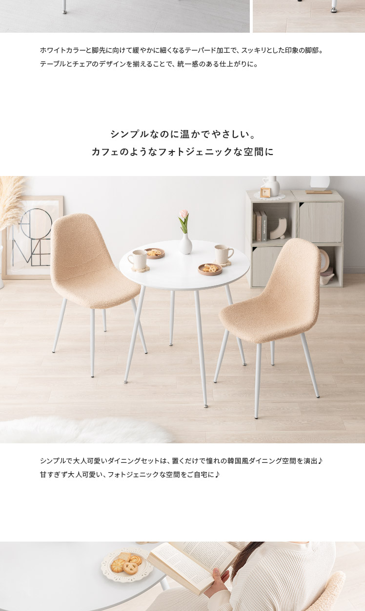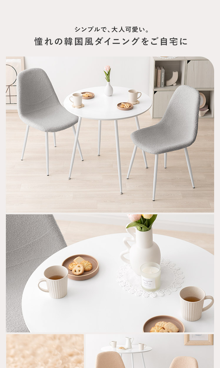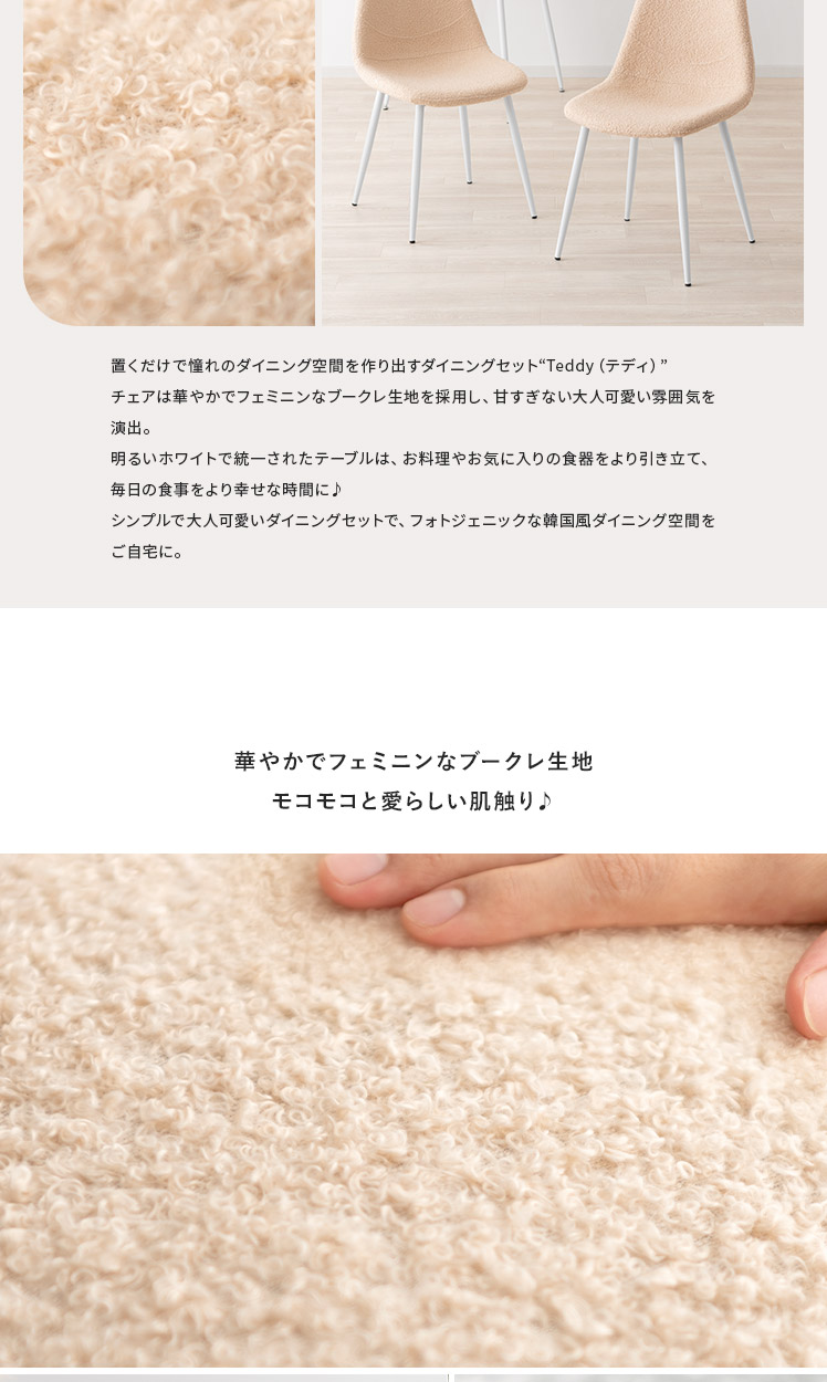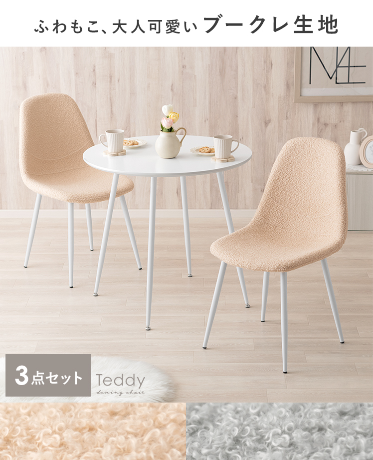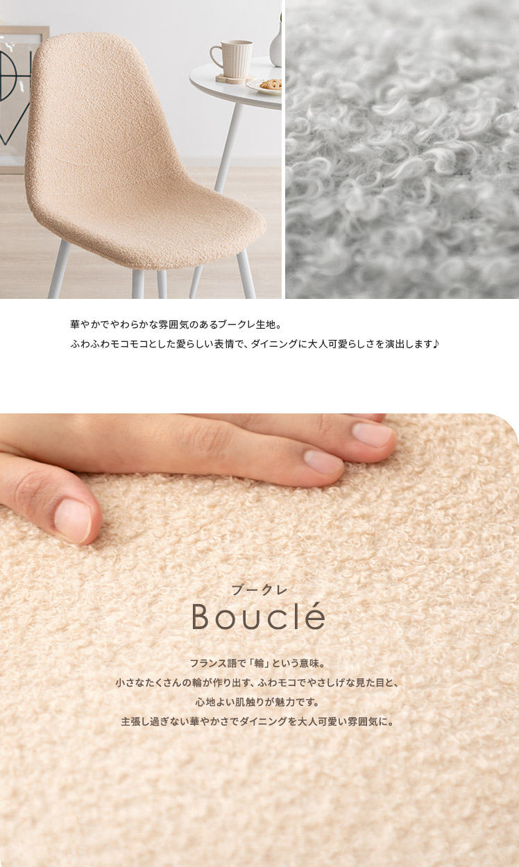 ダイニングテーブル&チェア3点セット Teddy〔テディ〕/置くだけで憧れのダイニング空間を作り出すダイニングセット“Teddy(テディ)”チェアは華やかでフェミニンなブークレ生地を採用し、甘すぎない大人可愛い雰囲気を演出。明るいホワイトで統一されたテーブルは、お料理やお気に入りの食器をより引き立て、毎日の食事をより幸せな時間に♪シンプルで大人可愛いダイニングセットで、フォトジェニックな韓国風ダイニング空間をご自宅に。