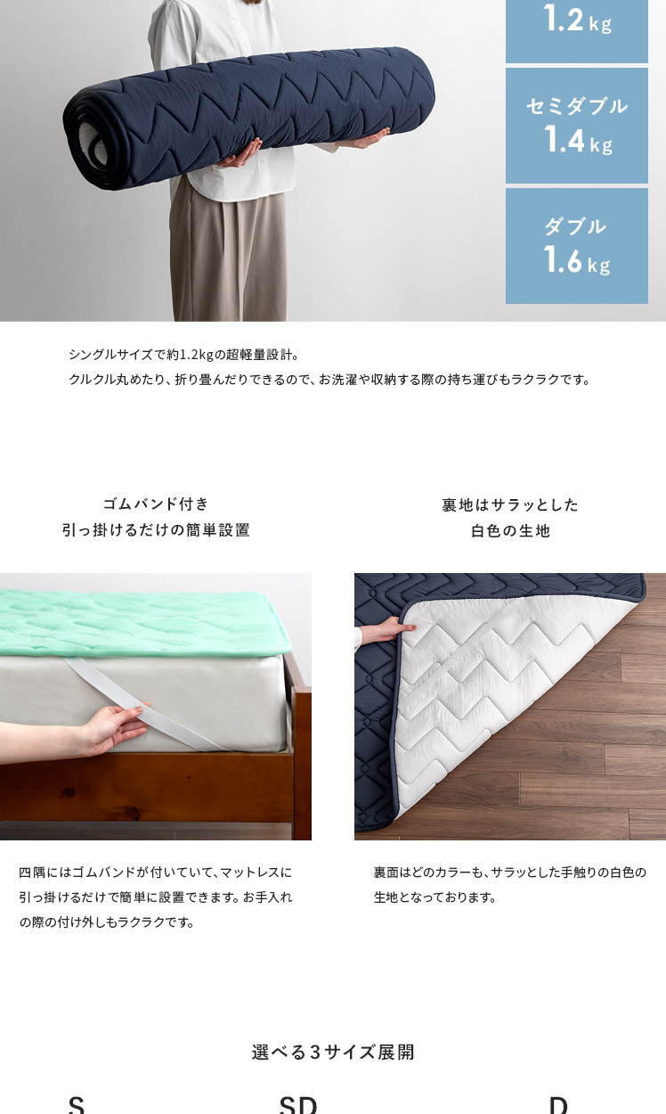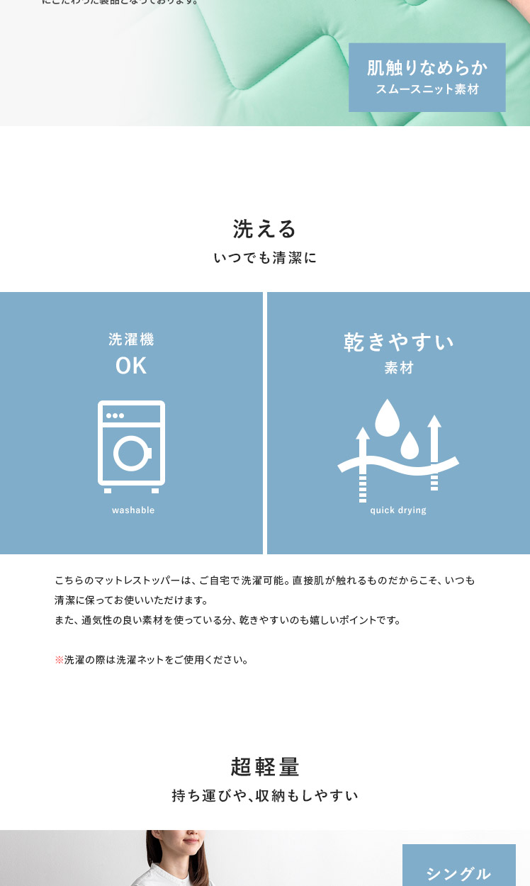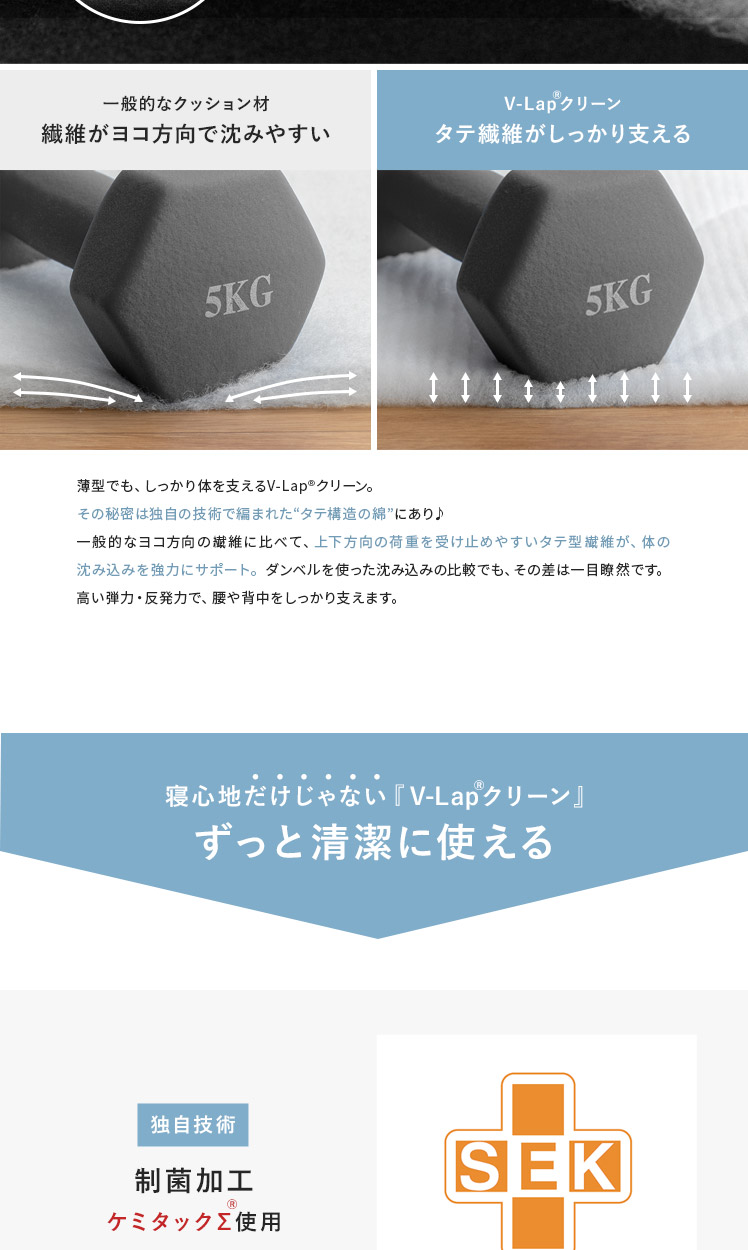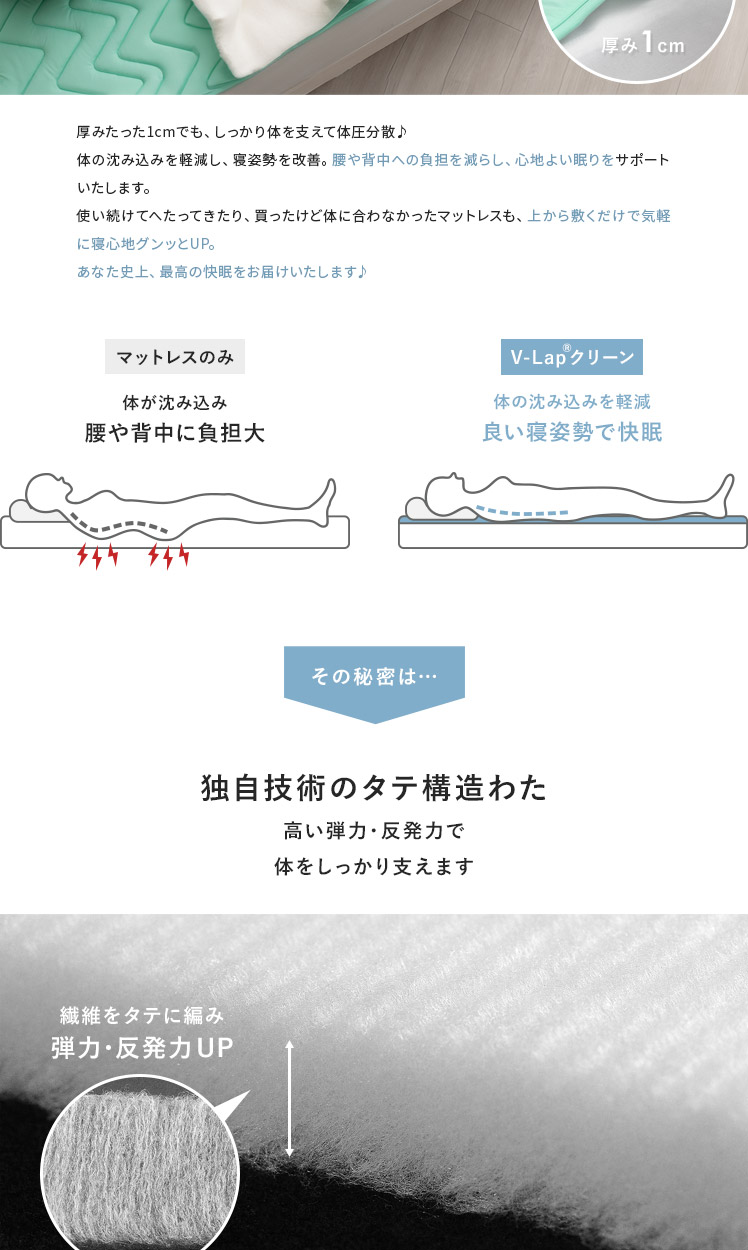 Tcomfort 快適サポートトッパー プレミアムクリーンPlus セミダブルサイズ/厚みたった1cmでも、しっかり体を支えて体圧分散♪体の沈み込みを軽減し、寝姿勢を改善。腰や背中への負担を減らし、心地よい眠りをサポートいたします。使い続けてへたってきたり、買ったけど体に合わなかったマットレスも、上から敷くだけで気軽に寝心地グンッとUP。あなた史上、最高の快眠をお届けいたします♪