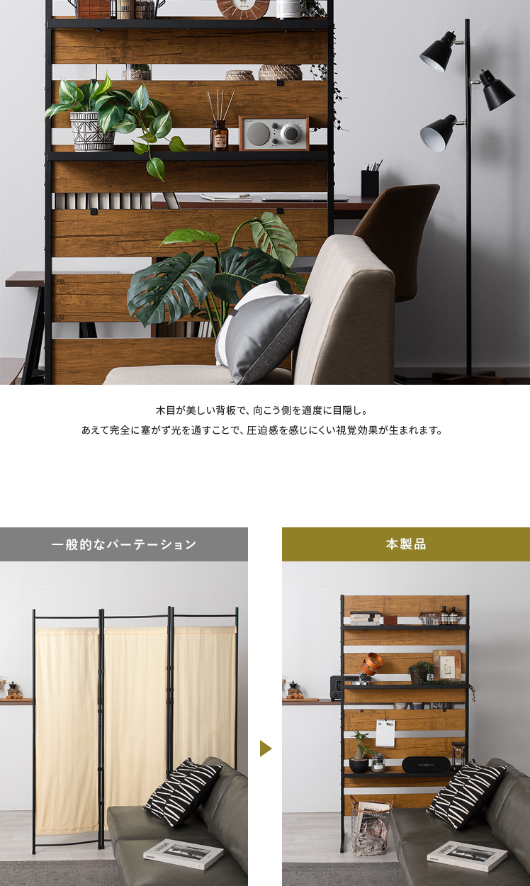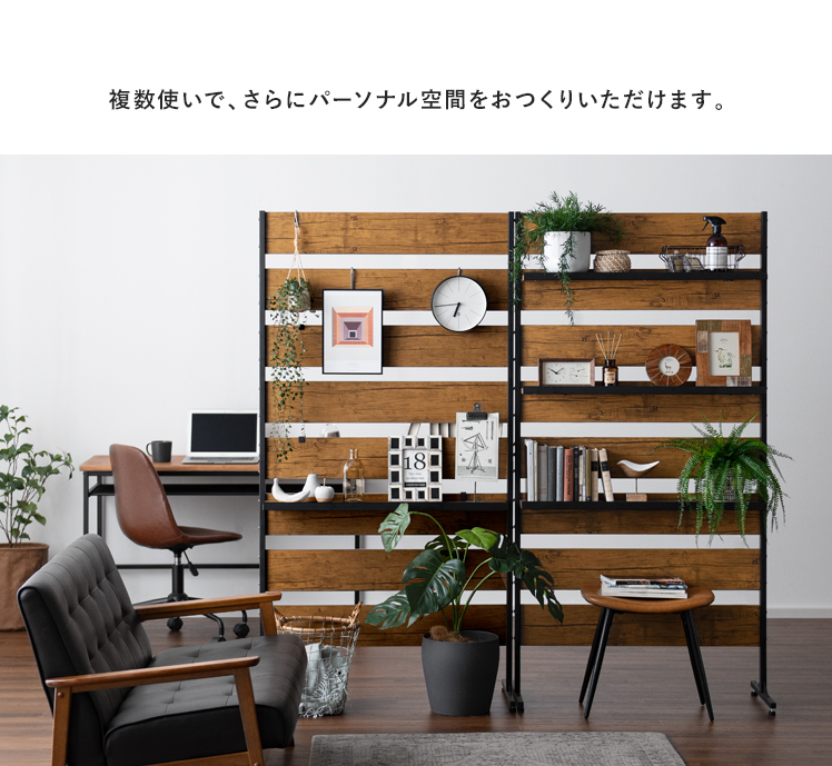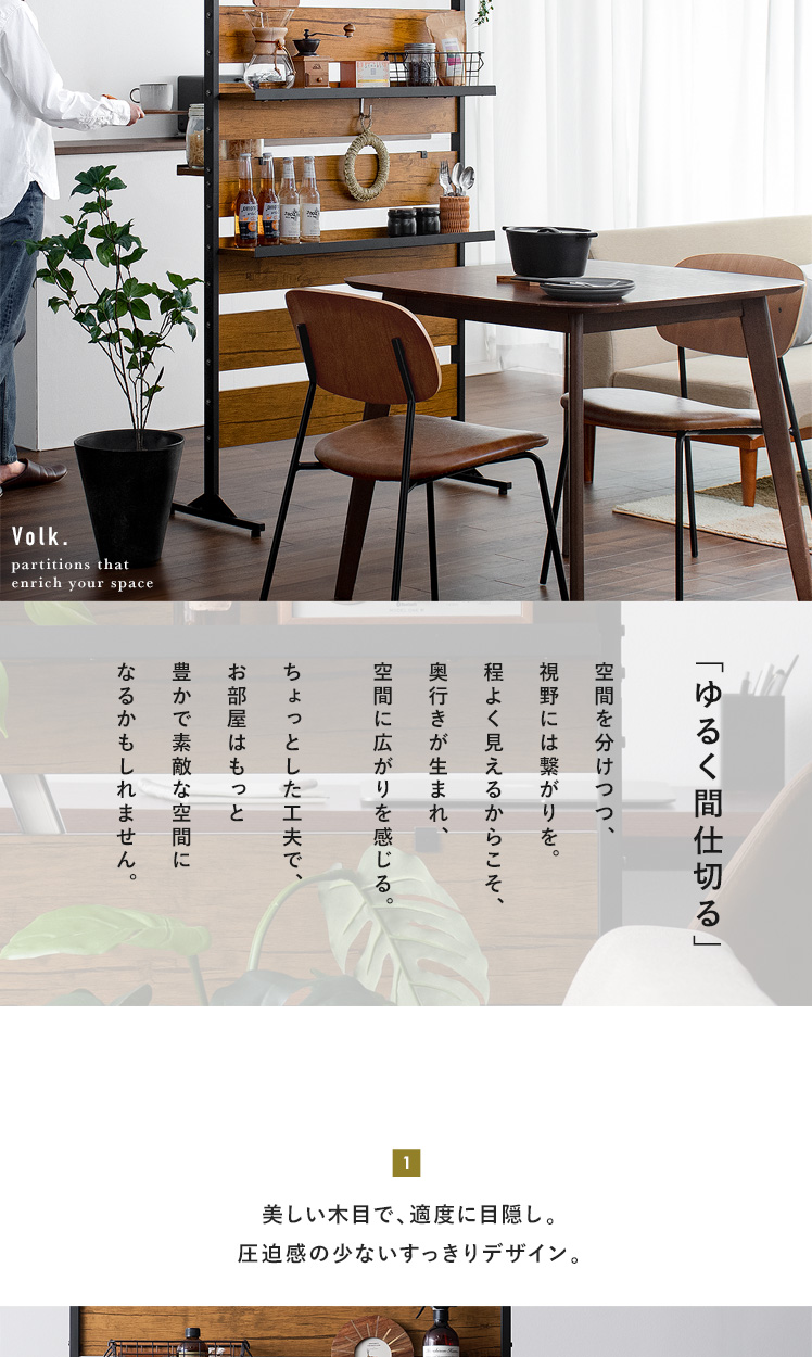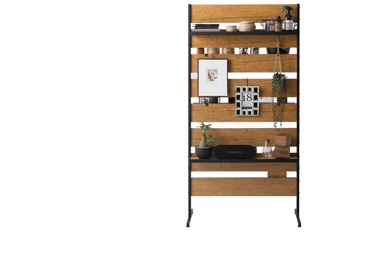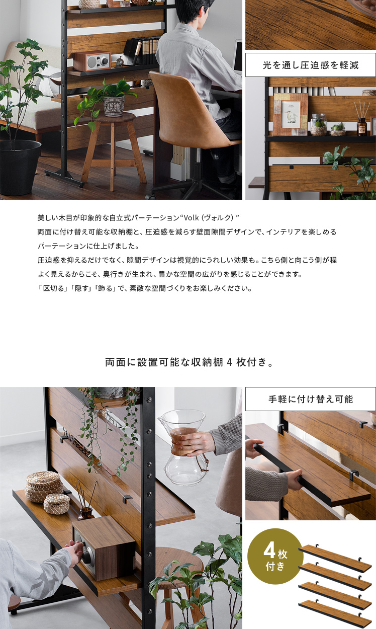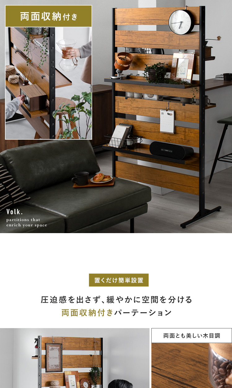 木目調パーテーションラック Volk〔ヴォルク〕/美しい木目が印象的な自立式パーテーション“Volk(ヴォルク)”両面に付け替え可能な収納棚と、圧迫感を減らす壁面隙間デザインで、インテリアを楽しめるパーテーションに仕上げました。圧迫感を抑えるだけでなく、隙間デザインは視覚的にうれしい効果も。こちら側と向こう側が程よく見えるからこそ、奥行きが生まれ、豊かな空間の広がりを感じることができます。 「区切る」「隠す」「飾る」で、素敵な空間づくりをお楽しみください。