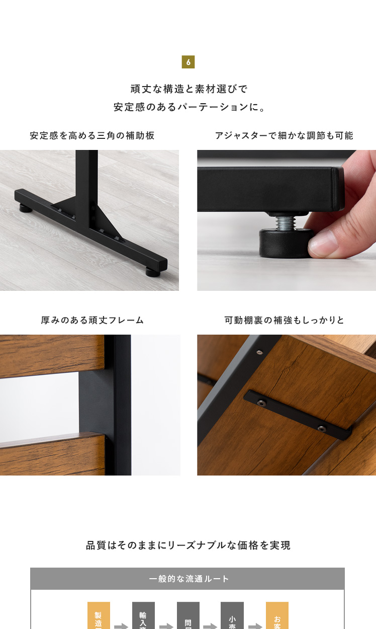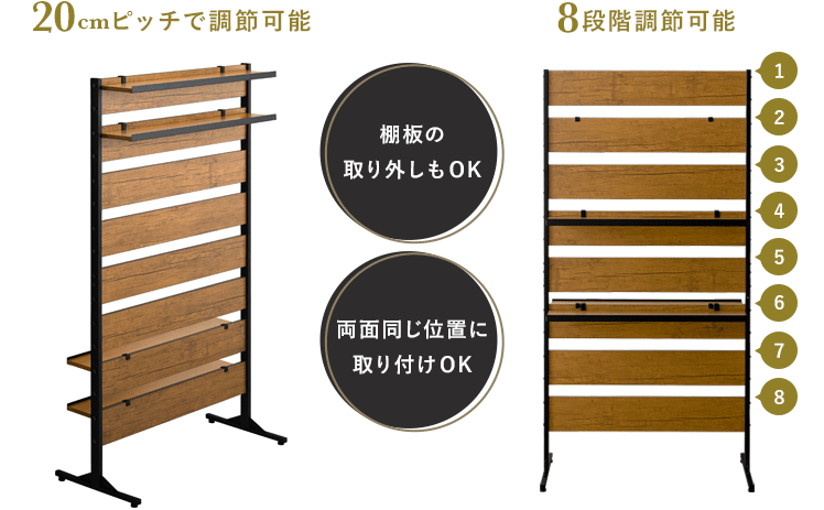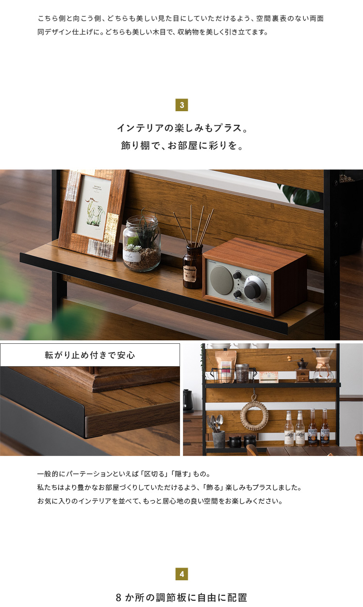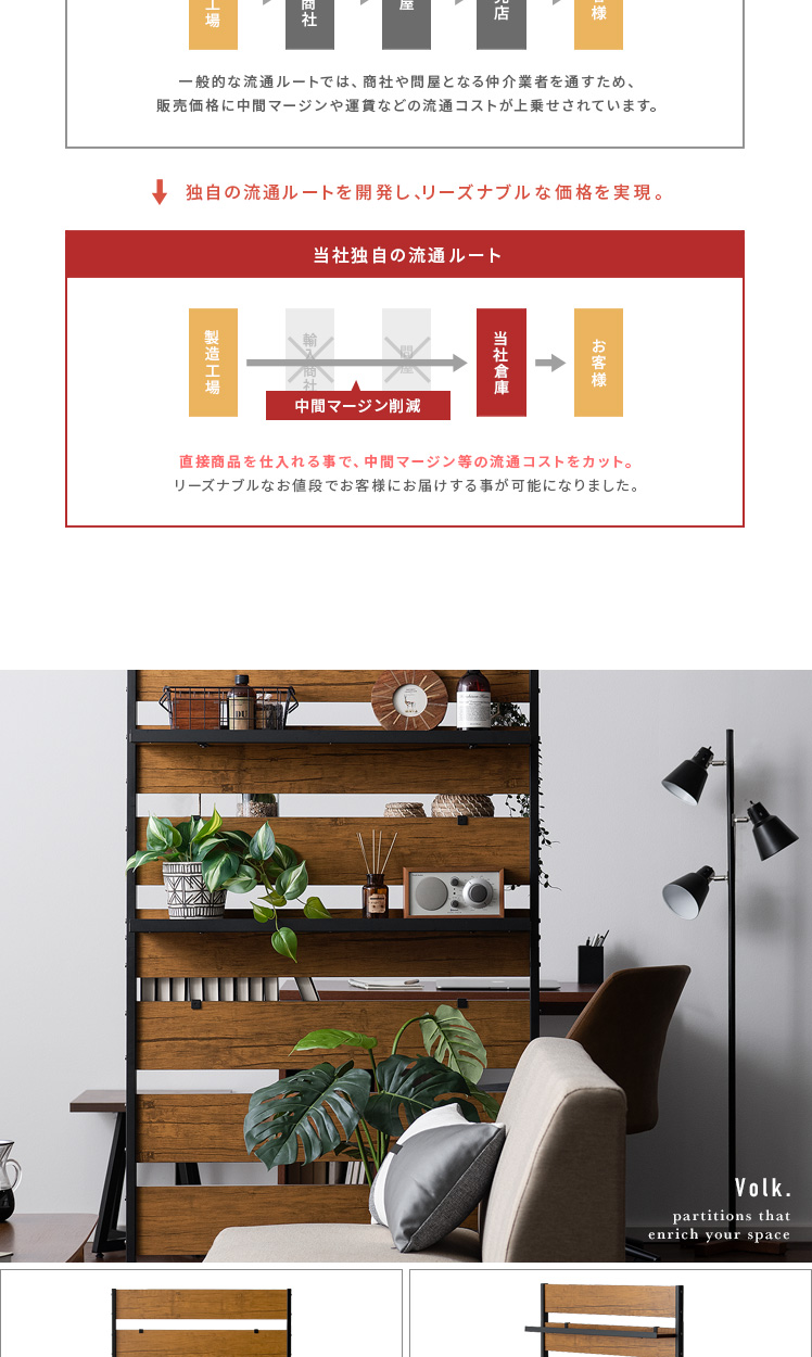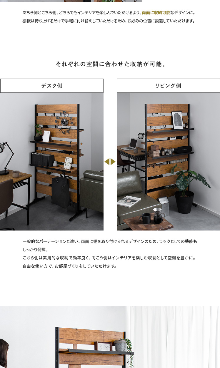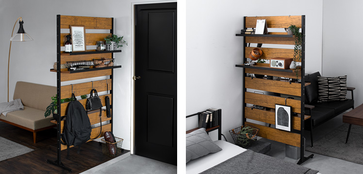 木目調パーテーションラック Volk〔ヴォルク〕/美しい木目が印象的な自立式パーテーション“Volk(ヴォルク)”両面に付け替え可能な収納棚と、圧迫感を減らす壁面隙間デザインで、インテリアを楽しめるパーテーションに仕上げました。圧迫感を抑えるだけでなく、隙間デザインは視覚的にうれしい効果も。こちら側と向こう側が程よく見えるからこそ、奥行きが生まれ、豊かな空間の広がりを感じることができます。 「区切る」「隠す」「飾る」で、素敵な空間づくりをお楽しみください。