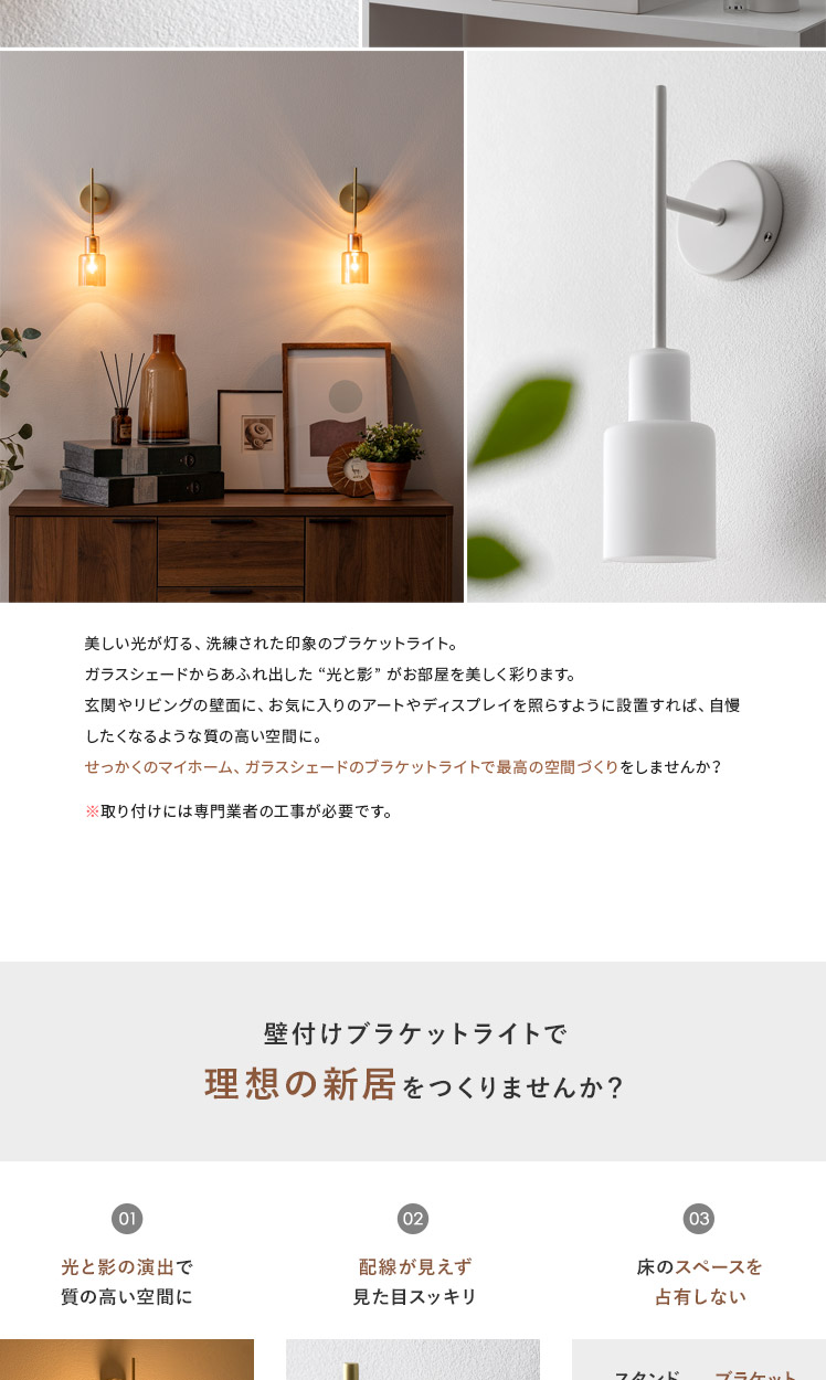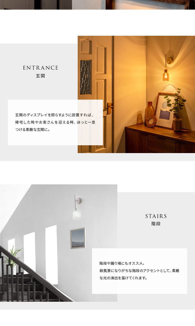 ガラスシェードブラケットライト GENE〔ジーン〕/美しい光が灯る、洗練された印象のブラケットライト。ガラスシェードからあふれ出した “光と影” がお部屋を美しく彩ります。玄関やリビングの壁面に、お気に入りのアートやディスプレイを照らすように設置すれば、自慢したくなるような質の高い空間に。せっかくのマイホーム、ガラスシェードのブラケットライトで最高の空間づくりをしませんか?※取り付けには専門業者の工事が必要です。