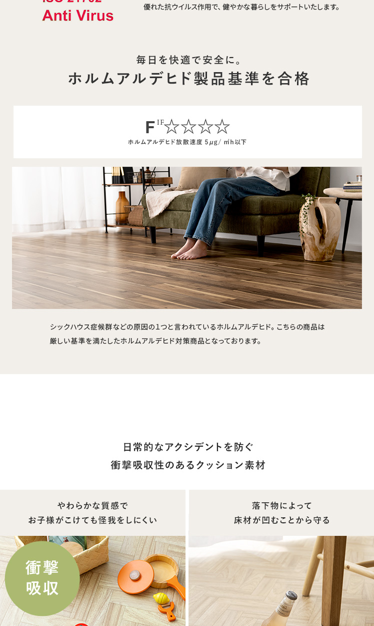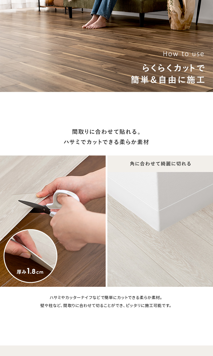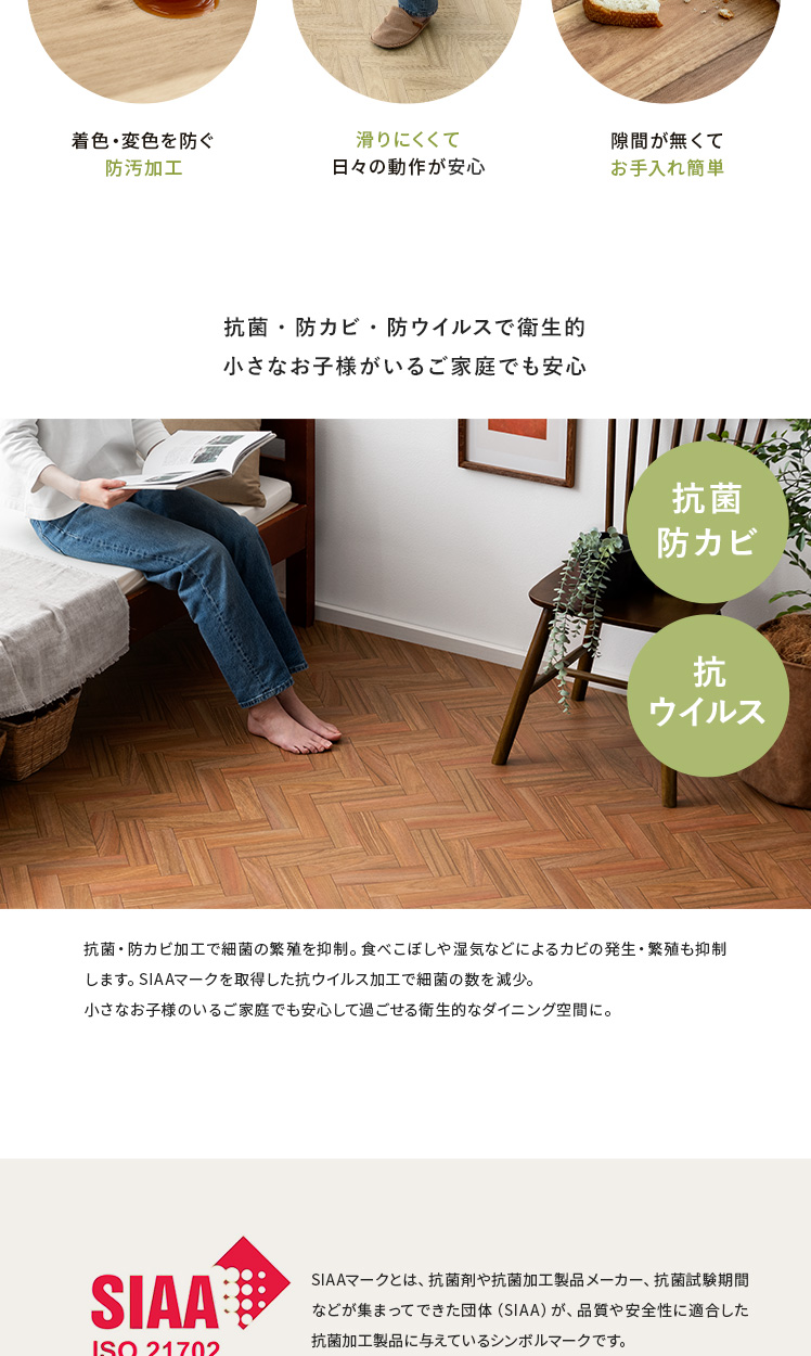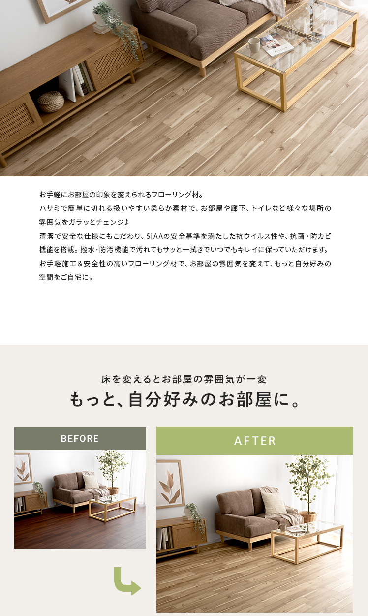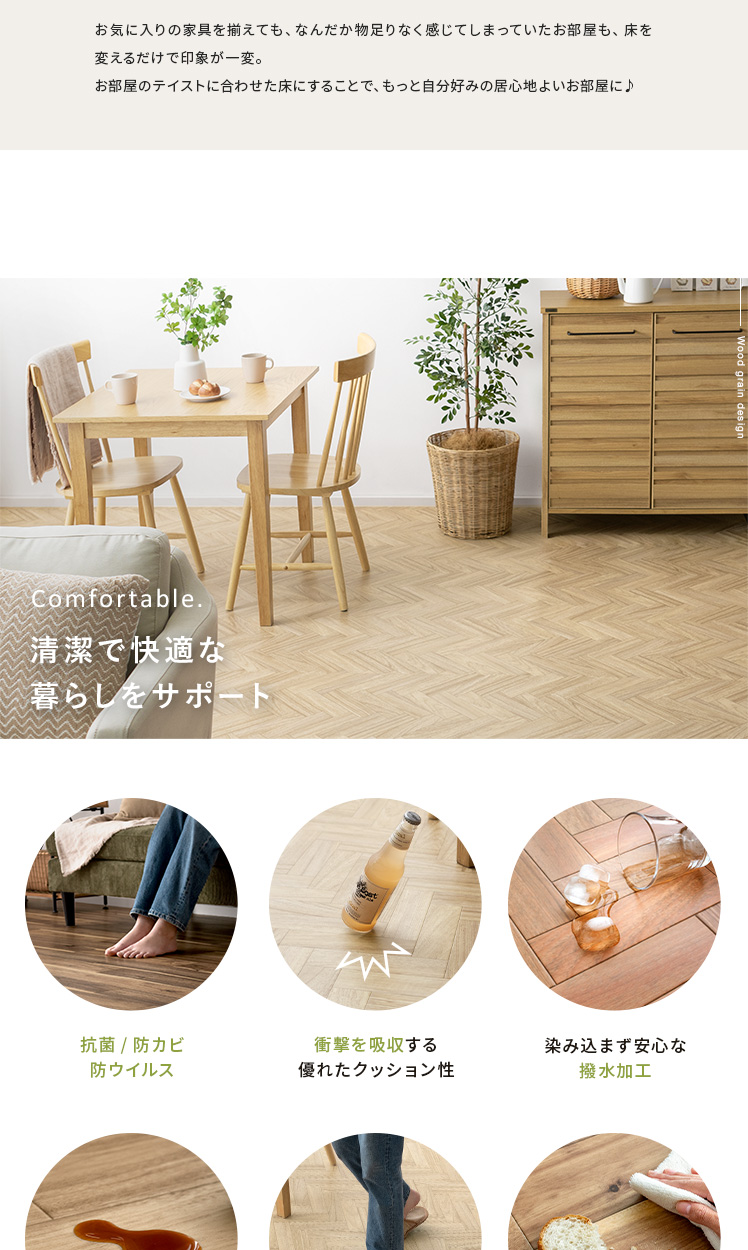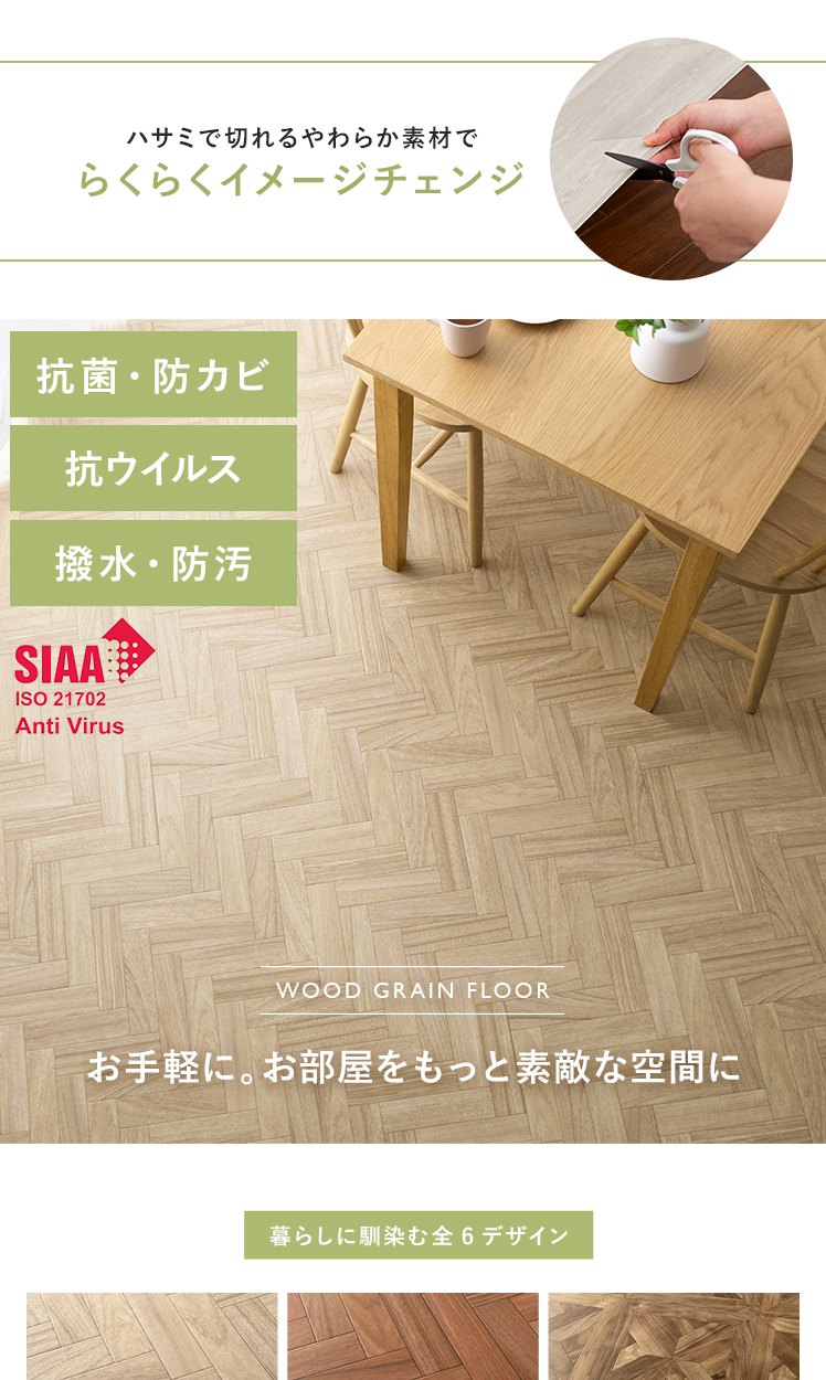 SIAA取得 抗ウイルス加工フローリング材 WOOD GRAIN FLOOR〔ウッドグレインフロア〕 182×350cm/お手軽にお部屋の印象を変えられるフローリング材。ハサミで簡単に切れる扱いやすい柔らか素材で、お部屋や廊下、トイレなど様々な場所の雰囲気をガラッとチェンジ♪清潔で安全な仕様にもこだわり、SIAAの安全基準を満たした抗ウイルス性や、抗菌・防カビ機能を搭載。撥水・防汚機能で汚れてもサッと一拭きでいつでもキレイに保っていただけます。お手軽施工&安全性の高いフローリング材で、お部屋の雰囲気を変えて、もっと自分好みの空間をご自宅に。