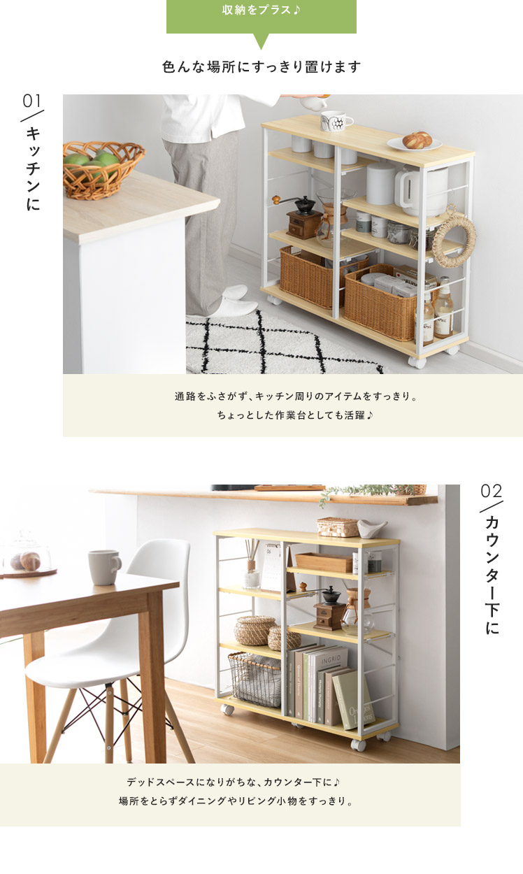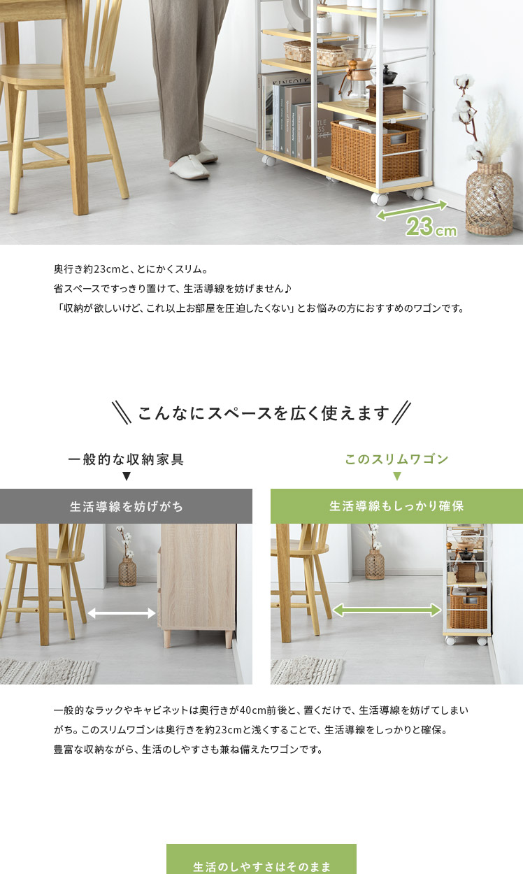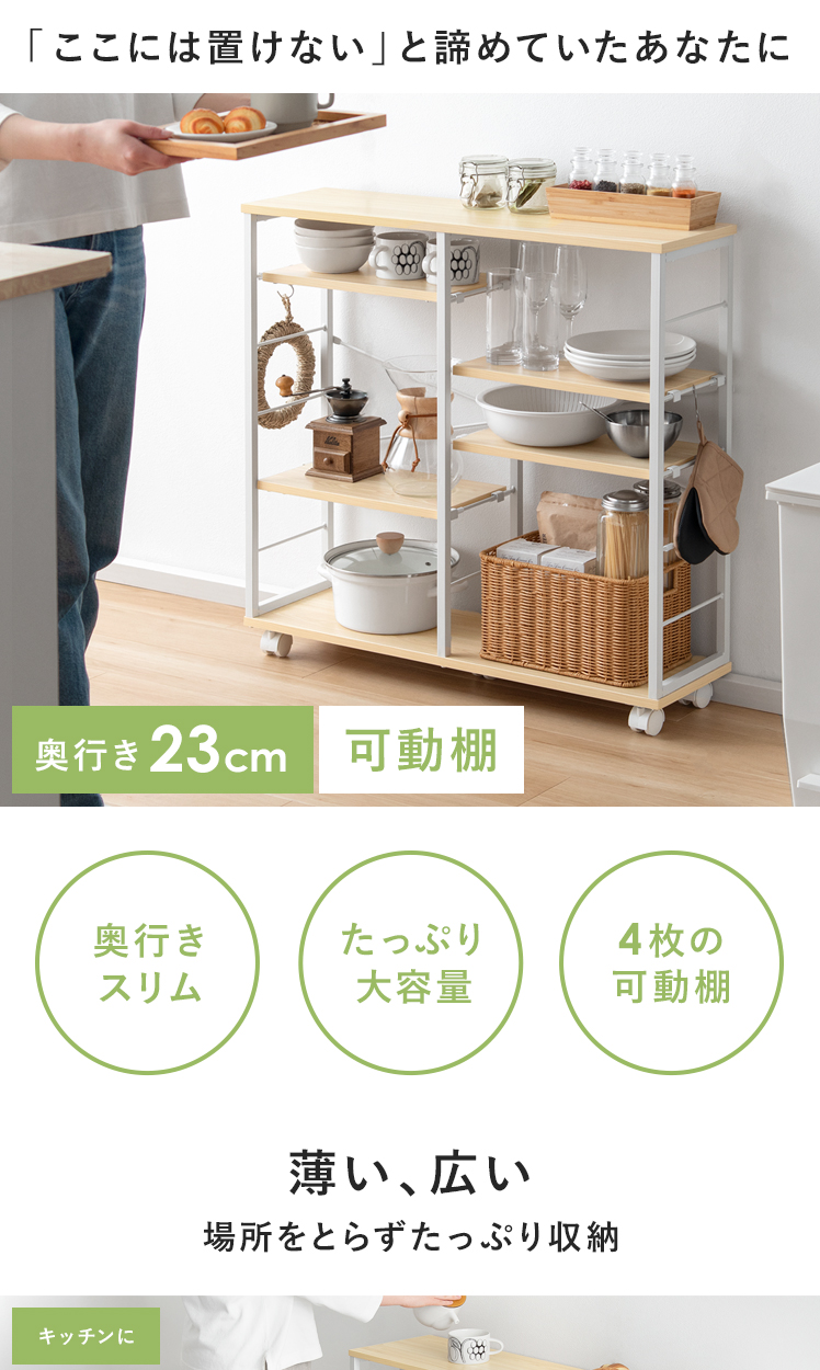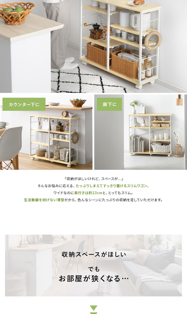 キャスター付きスリムカウンターワゴン/「収納がほしいけれど、スペースが…」そんなお悩みに応える、たっぷりしまえてすっきり置けるスリムワゴン。ワイドなのに奥行きは約23cmと、とってもスリム。生活動線を妨げない薄型だから、色んなシーンにたっぷりの収納を足していただけます。