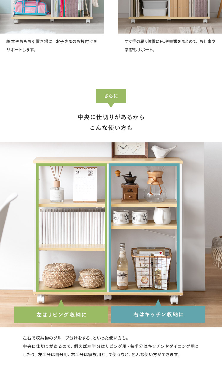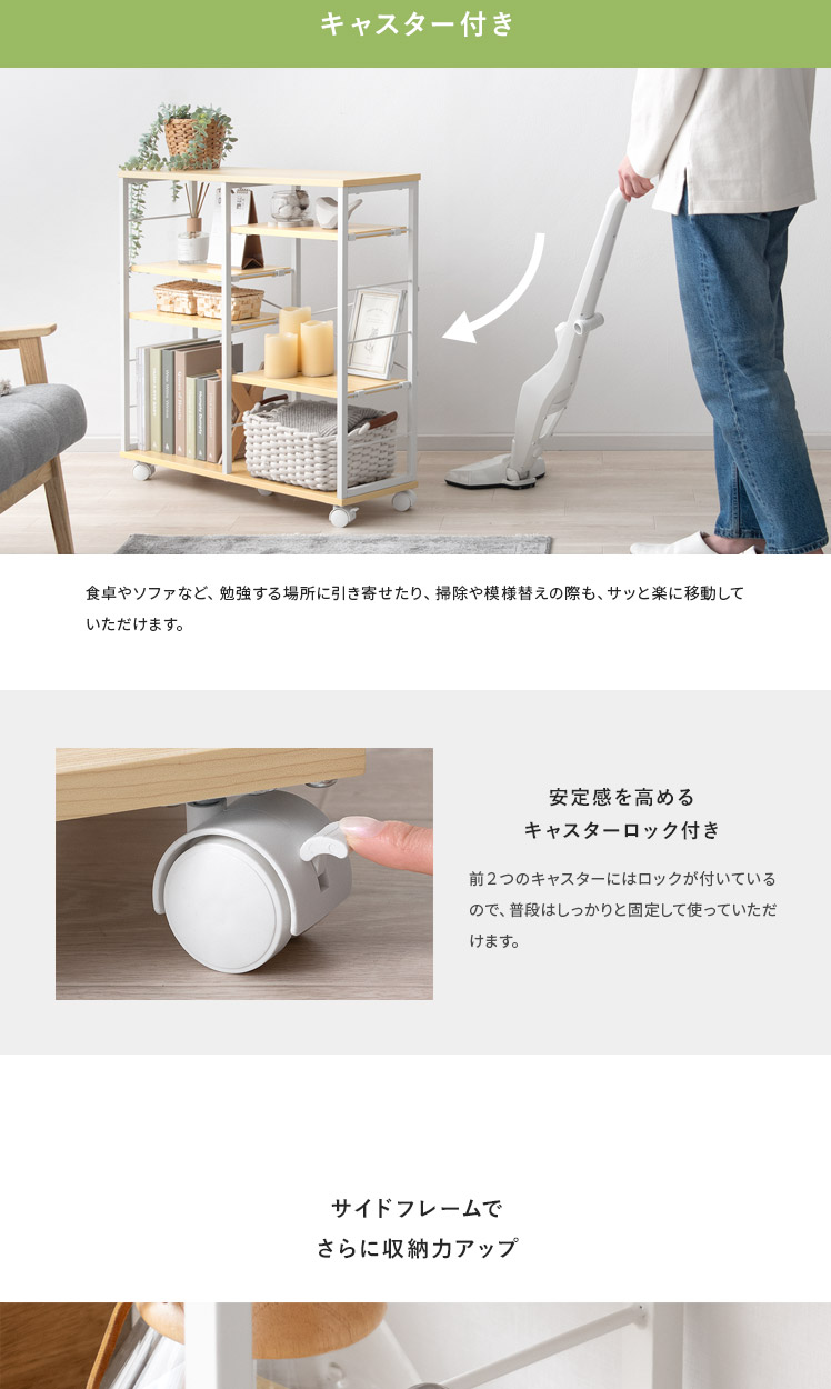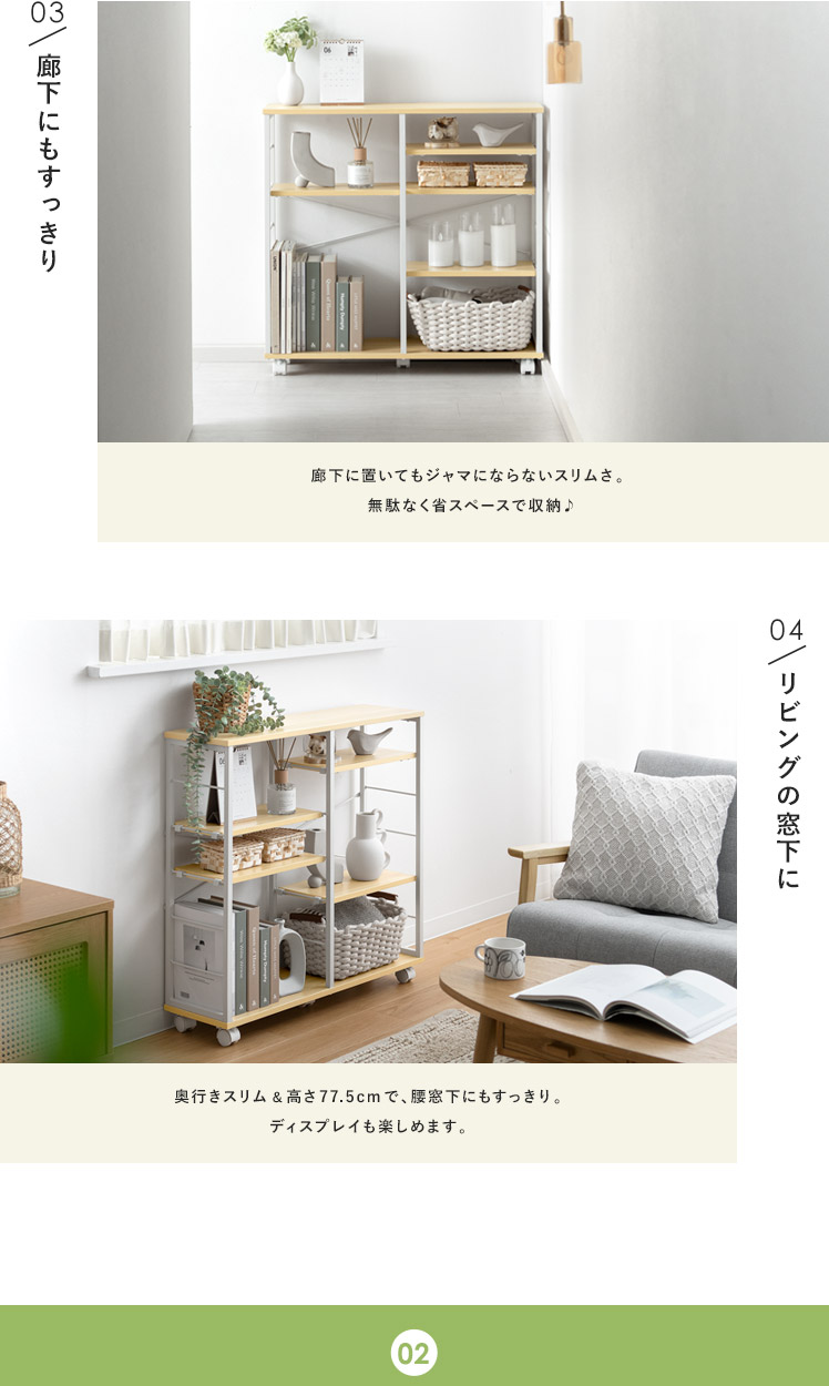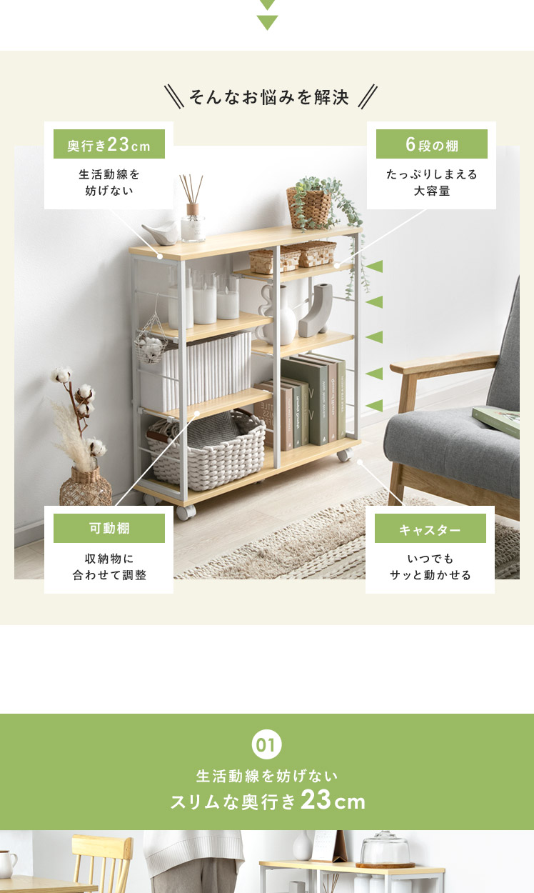 キャスター付きスリムカウンターワゴン/「収納がほしいけれど、スペースが…」そんなお悩みに応える、たっぷりしまえてすっきり置けるスリムワゴン。ワイドなのに奥行きは約23cmと、とってもスリム。生活動線を妨げない薄型だから、色んなシーンにたっぷりの収納を足していただけます。
