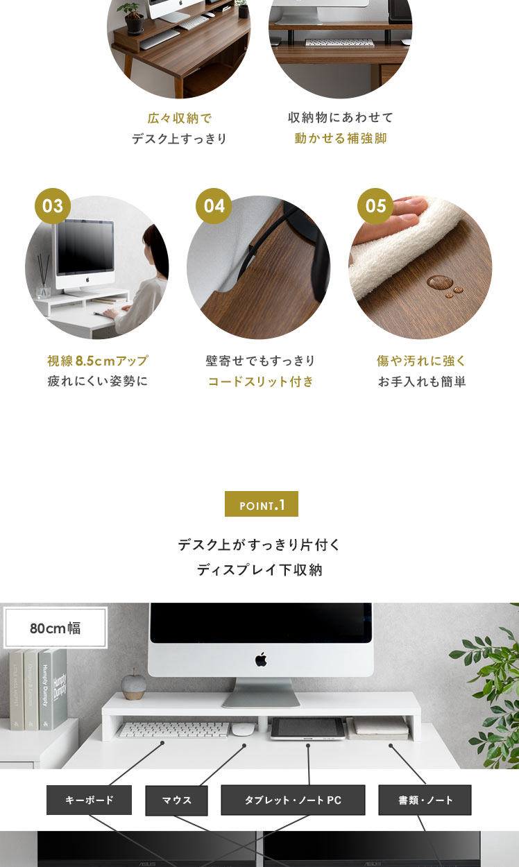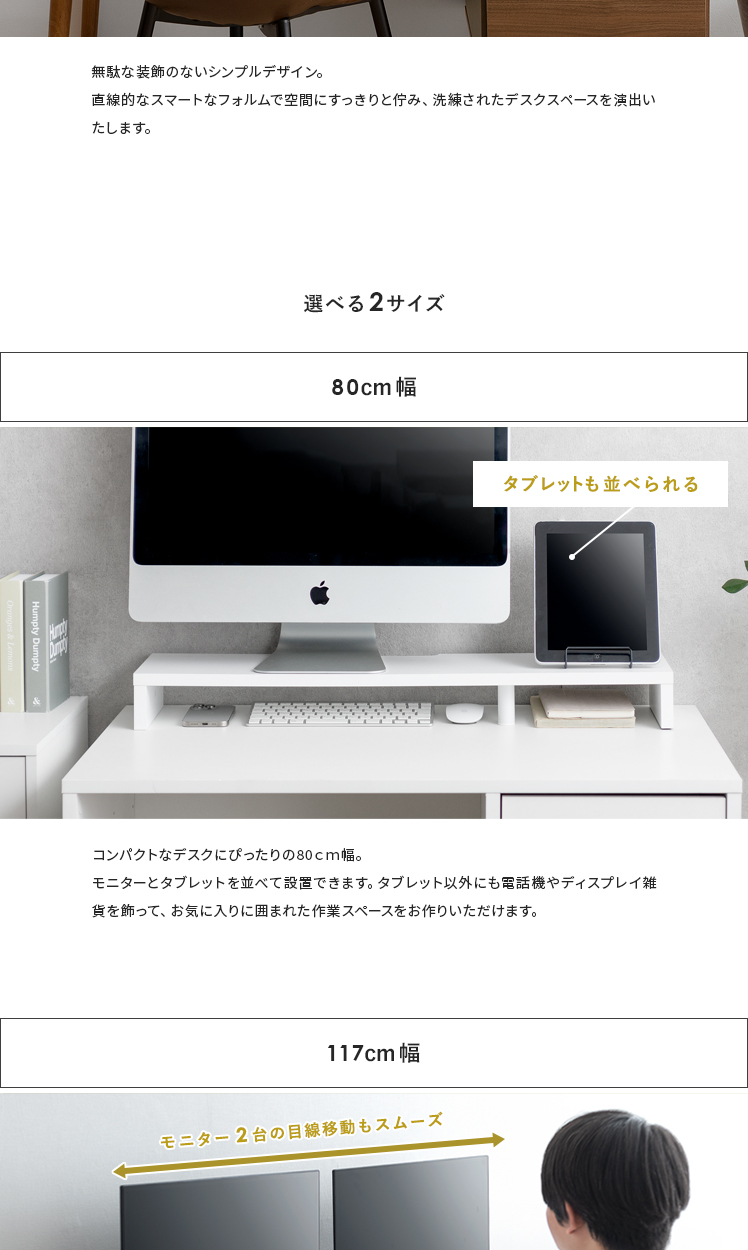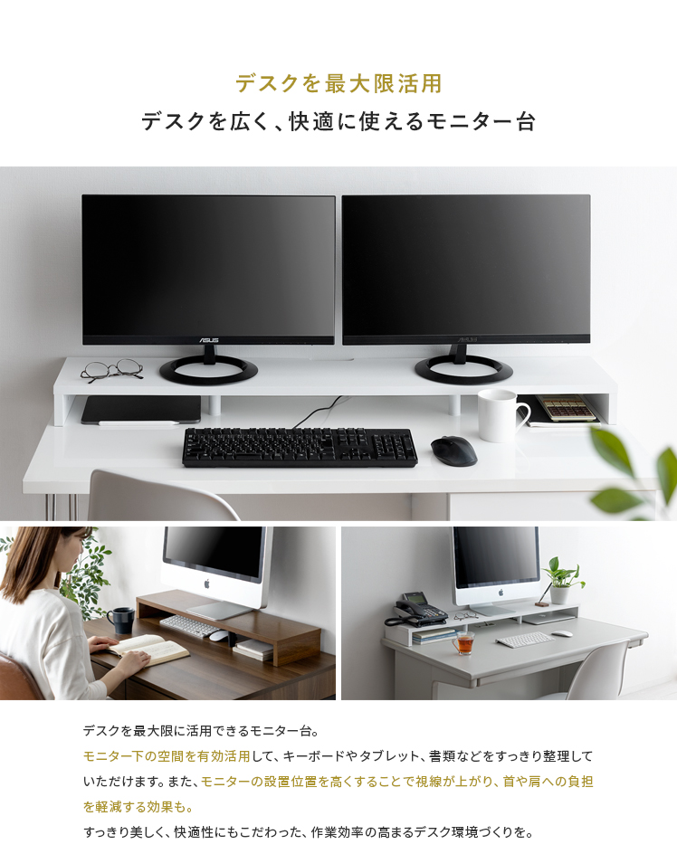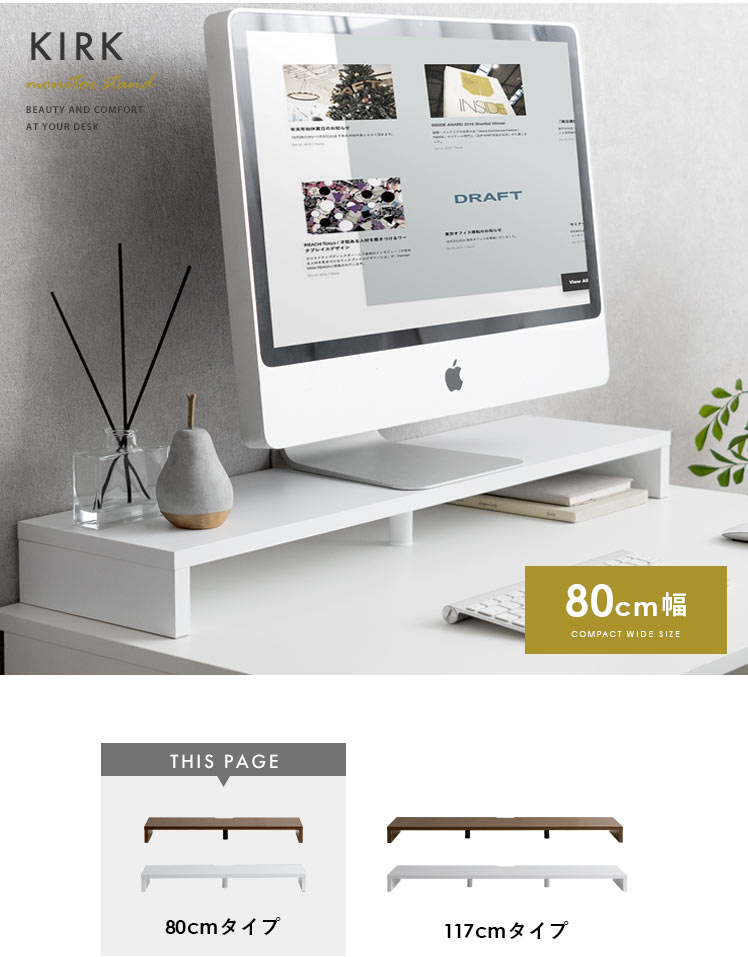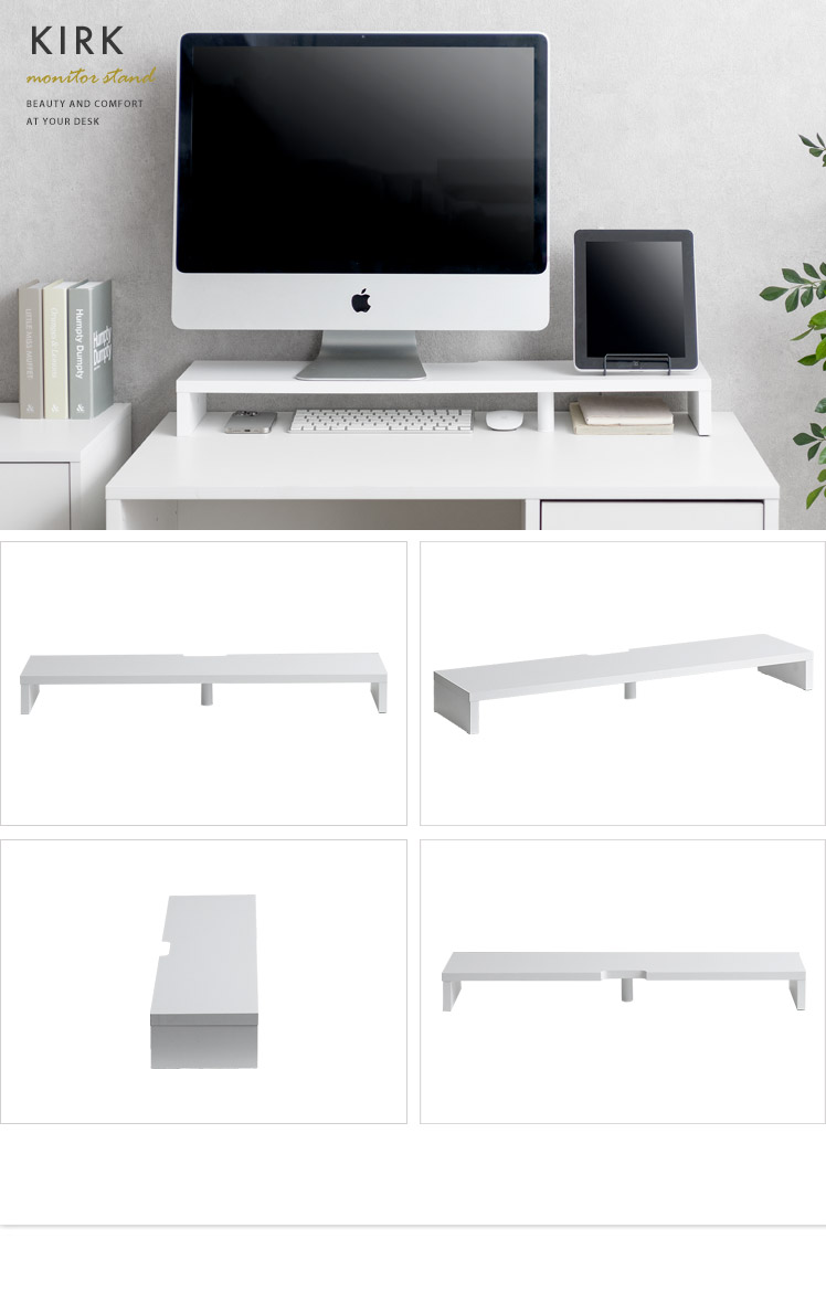 80cm幅デスク対応モニタースタンド KIRK〔カーク〕/デスクを最大限に活用できるモニター台。モニター下の空間を有効活用して、キーボードやタブレット、書類などをすっきり整理していただけます。また、モニターの設置位置を高くすることで視線が上がり首や肩への負担を軽減する効果も。すっきり美しく、快適性にもこだわった、作業効率の高まるデスク環境づくりを。