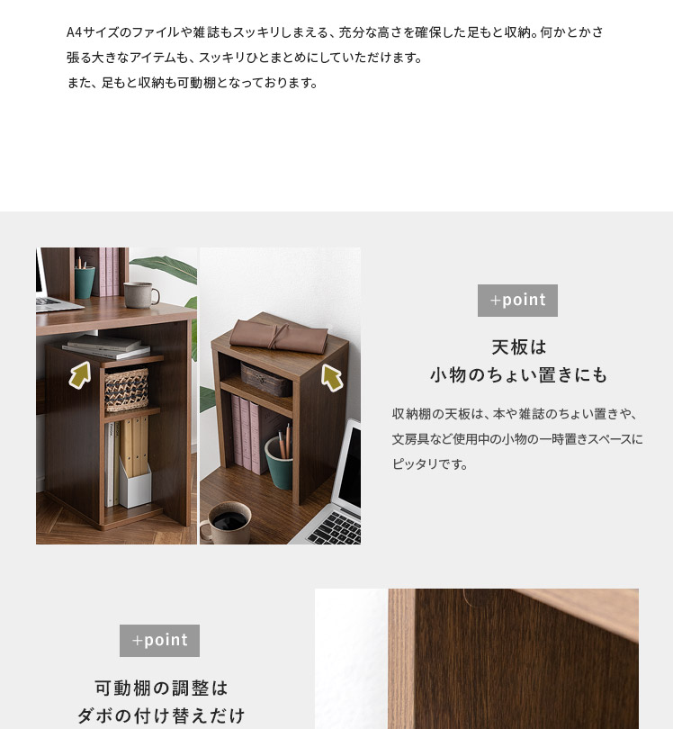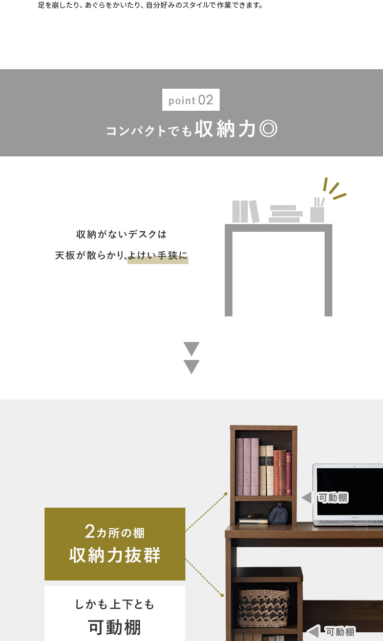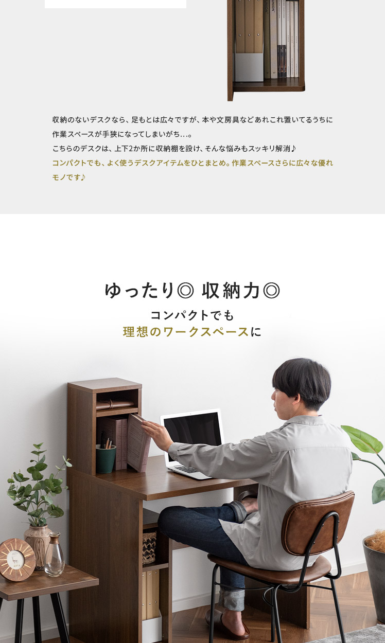 収納付きコンパクトデスク Edna〔エドナ〕/コンパクトなデスクは何かを我慢しないといけない…。収納付きタイプは足もとが窮屈に感じたり。収納がないタイプだと、本や文房具で散らかり作業スペースが手狭になったり。でも、こちらのデスクなら、そんな我慢は一切不要です。上下2か所の棚で収納力抜群。しかも下段の収納棚を少し奥まらせることで、収納付きでも足もとはデスク幅いっぱい♪足を崩したり、あぐらをかいたり、楽な姿勢で作業可能。コンパクトな見た目に、欲しい機能全て入った欲張りデスクです。
