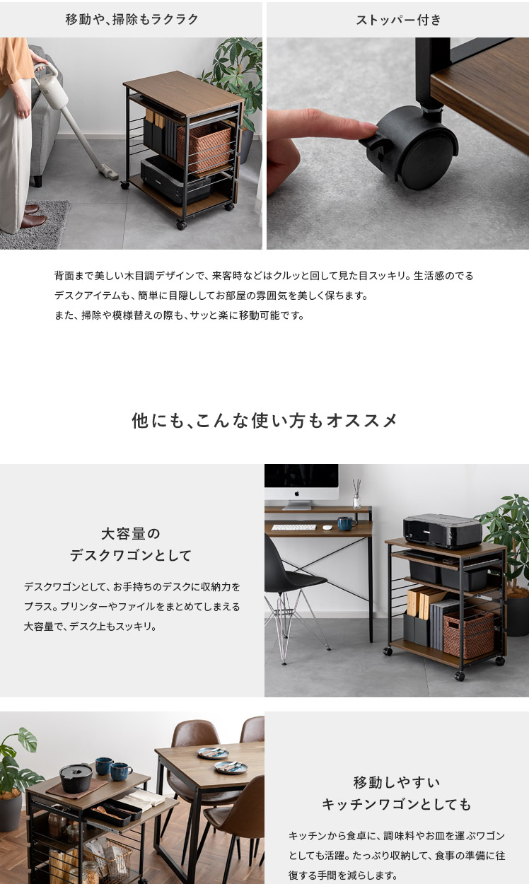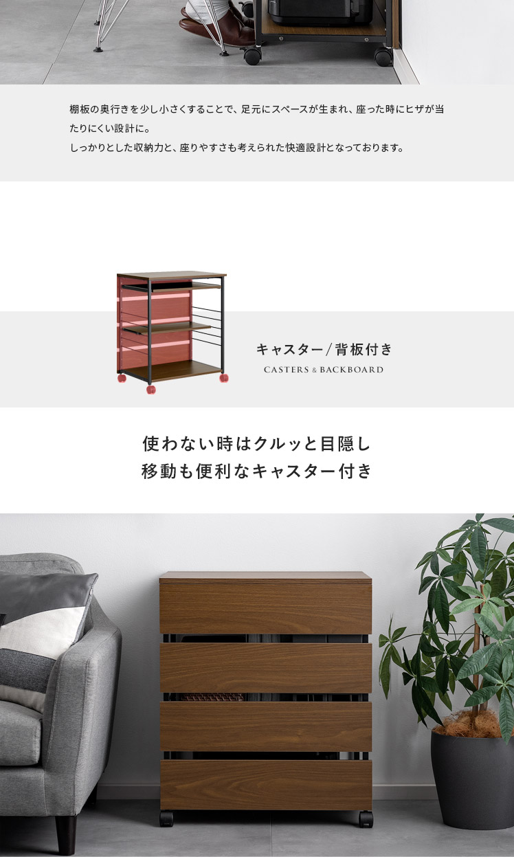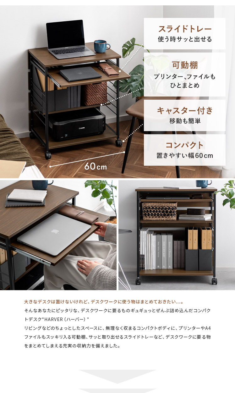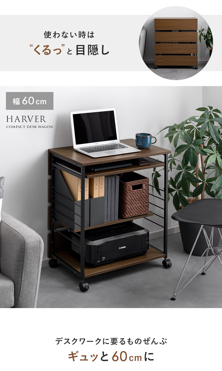 コンパクトデスクワゴン Harver〔ハーバー〕/大きなデスクは置けないけれど、デスクワークに使う物はまとめておきたい…。そんなあなたにピッタリな、デスクワークに要るものギュギュっとぜんぶ詰め込んだコンパクトデスク“HARVER(ハーバー)”リビングなどのちょっとしたスペースに、無理なく収まるコンパクトボディに、プリンターやA4ファイルもスッキリ入る可動棚、サッと取り出せるスライドトレーなど、デスクワークに要る物をまとめてしまえる充実の収納力を備えました。